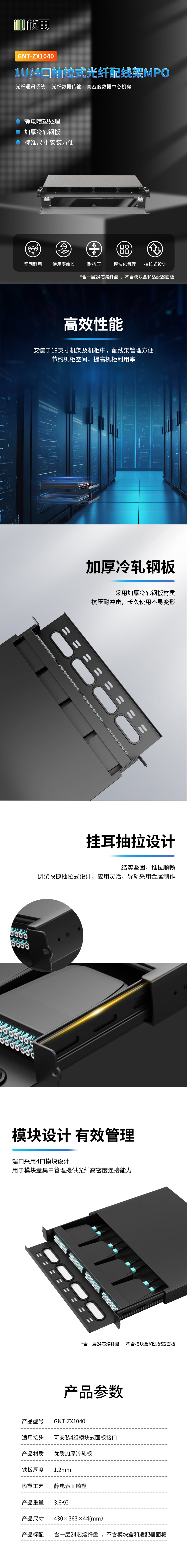 MPO配线架-1U 4口抽拉式 无盘 GNT-ZX1040