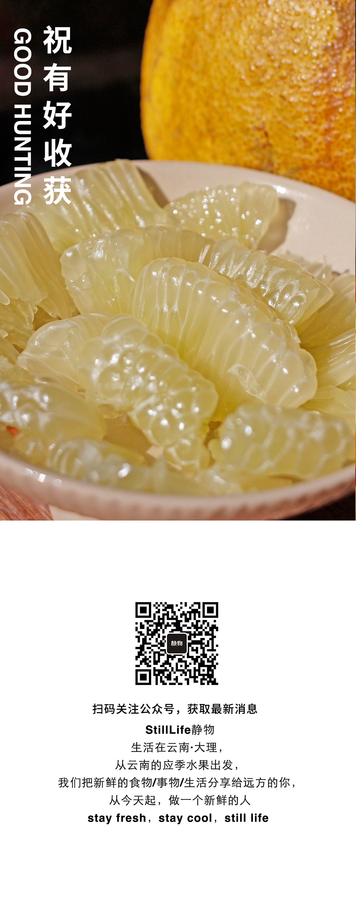 我们生活在云南·大理,从云南的应季水果出发,我们把新鲜的食物/事物/生活分享给远方的你,从今天起,做一个新鲜的人 stay fresh,stay cool,still life