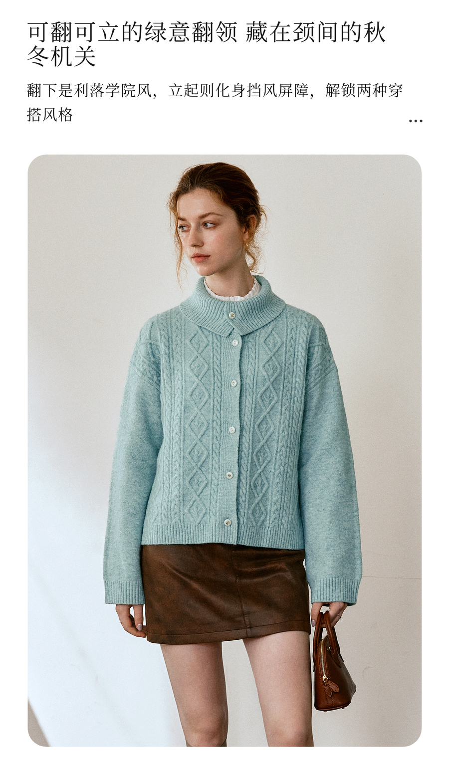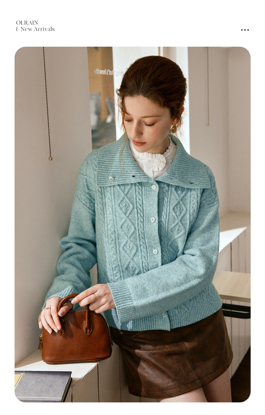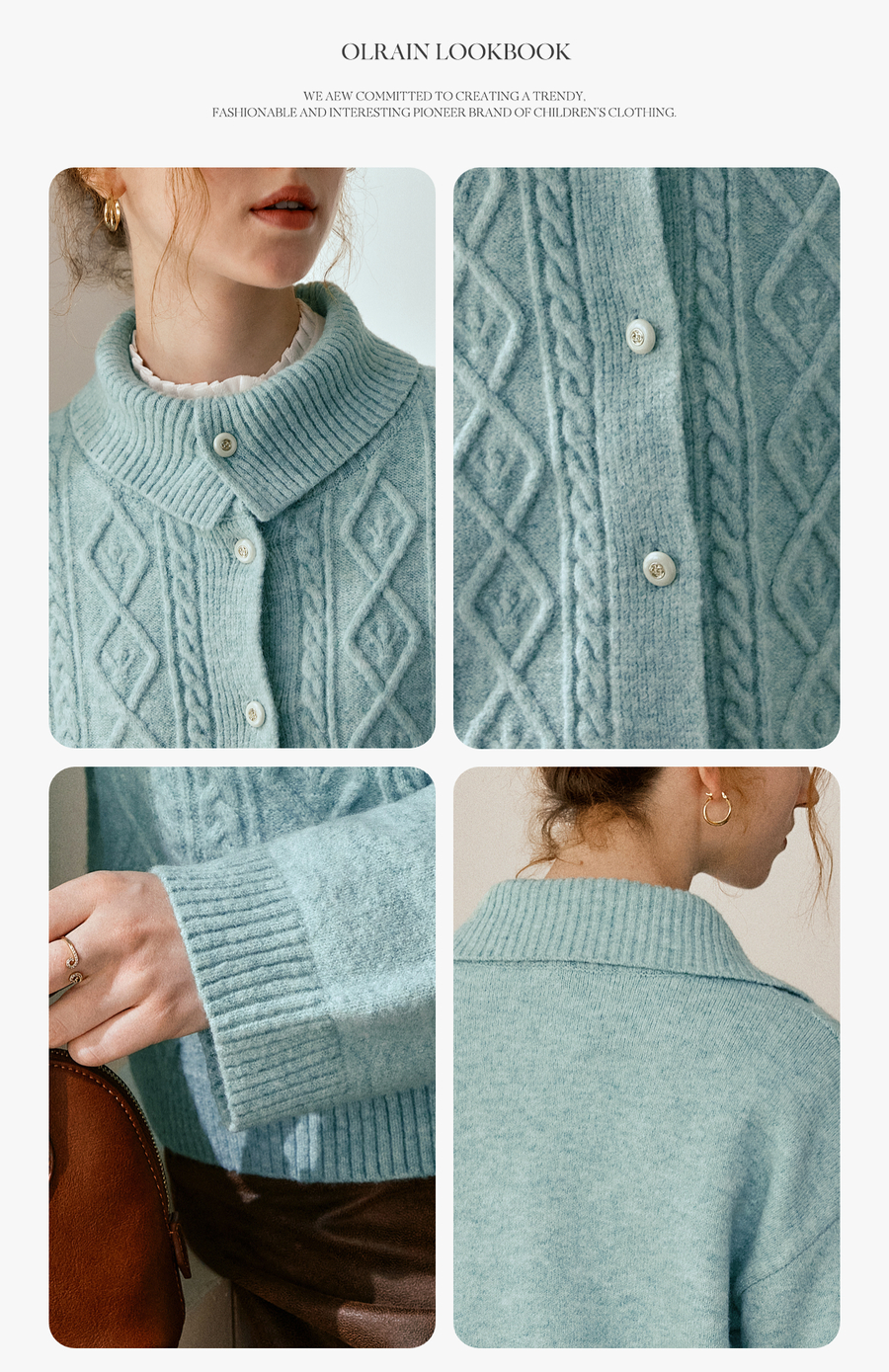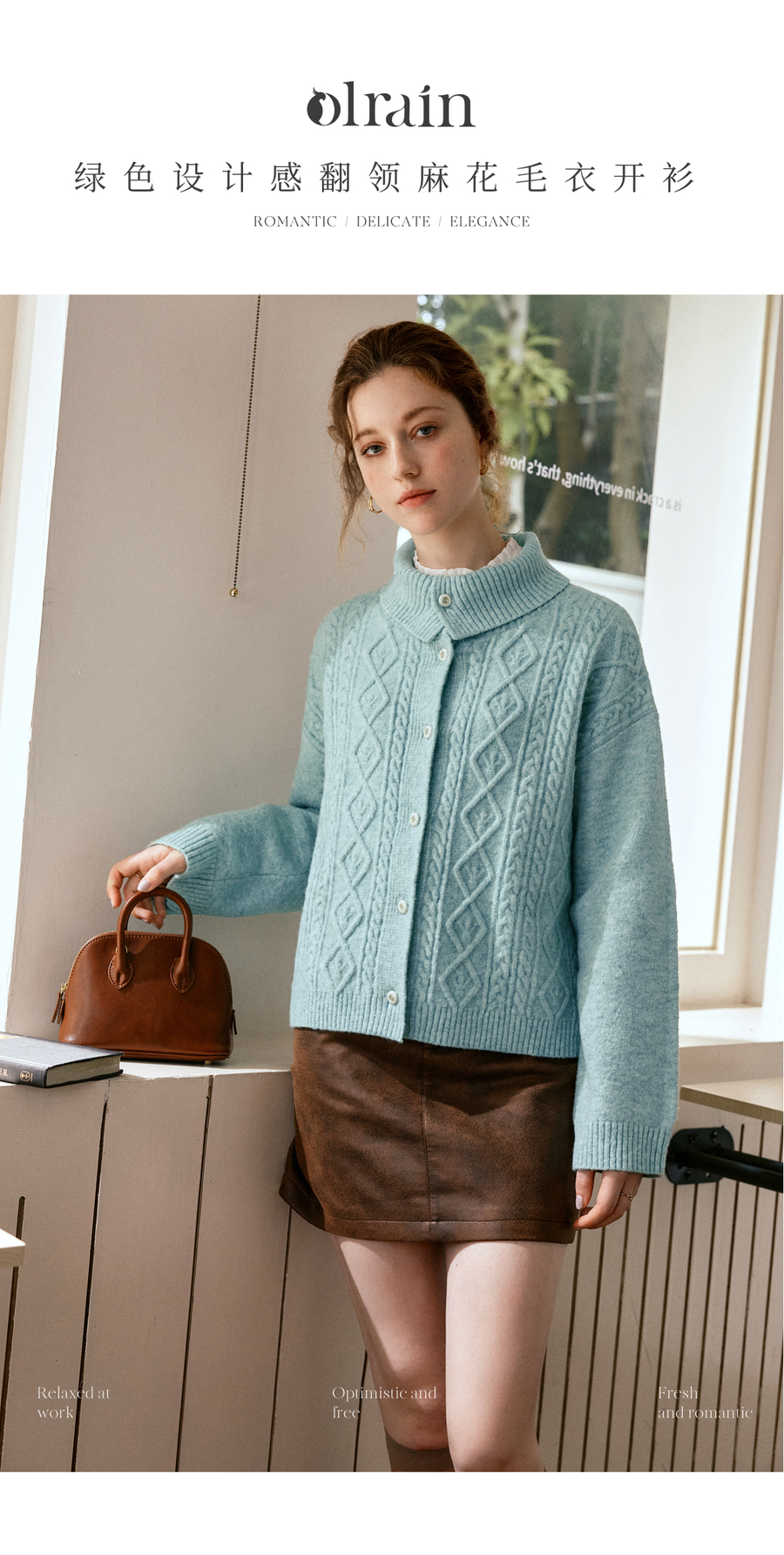 OLrain欧芮儿2025新款秋季设计感翻领麻花毛衣开衫慵懒羊毛上衣女