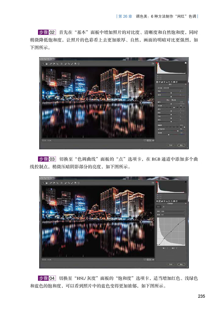 (3)照片调色,详细讲解:通过手机APP 及计算机上对于Lightroom、Photoshop等软件对照片进行调色的方法,步步详解,加速大家对于调色的理解。书中还包含许多社交媒体上的“网红色调”调色法,让你的照片焕然一新。