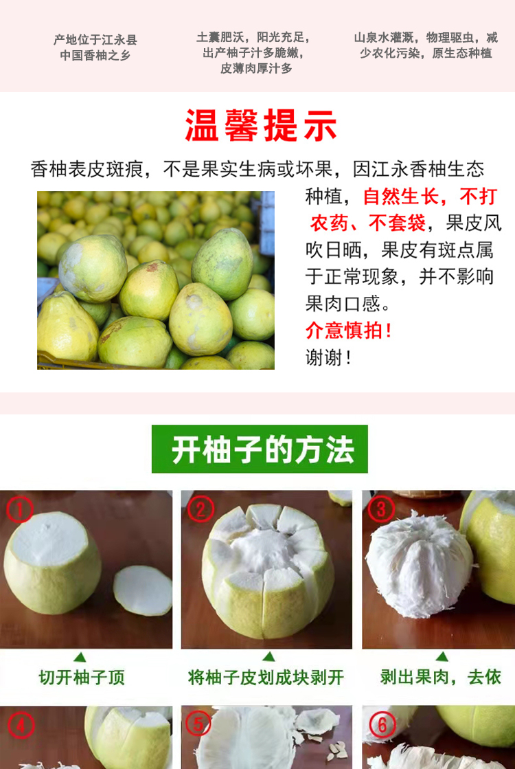 2.露天种植,没有过多的干预,江永香柚经历风吹日晒、枝叶剐蹭,可能会有一些疤痕、斑纹,不影响食用,不在售后范围内。