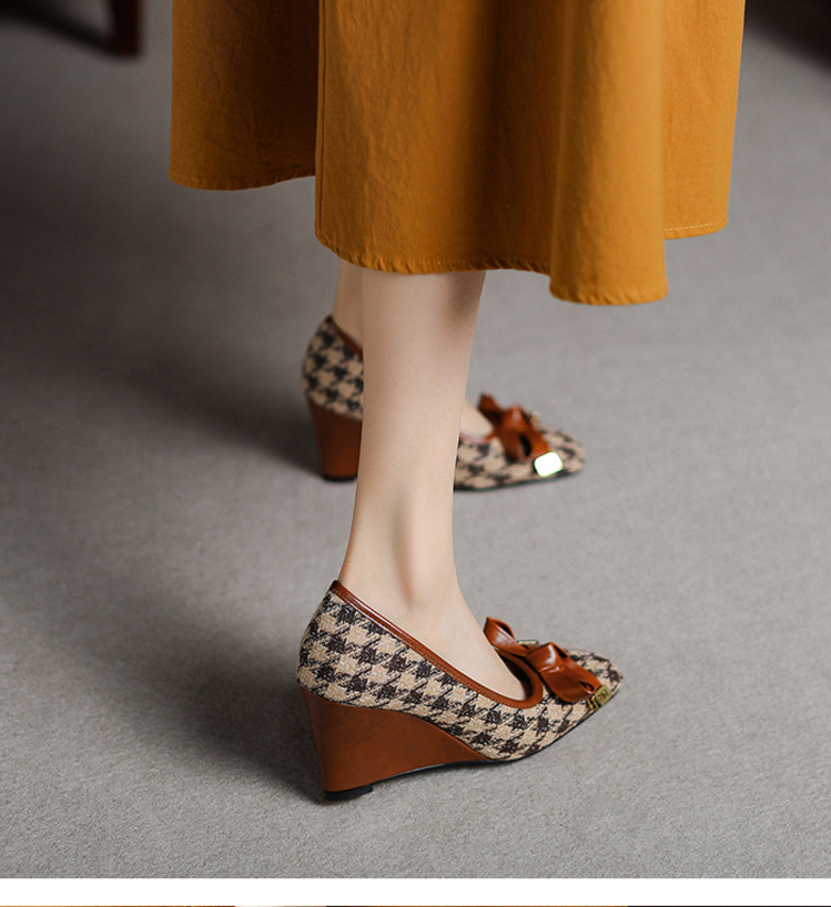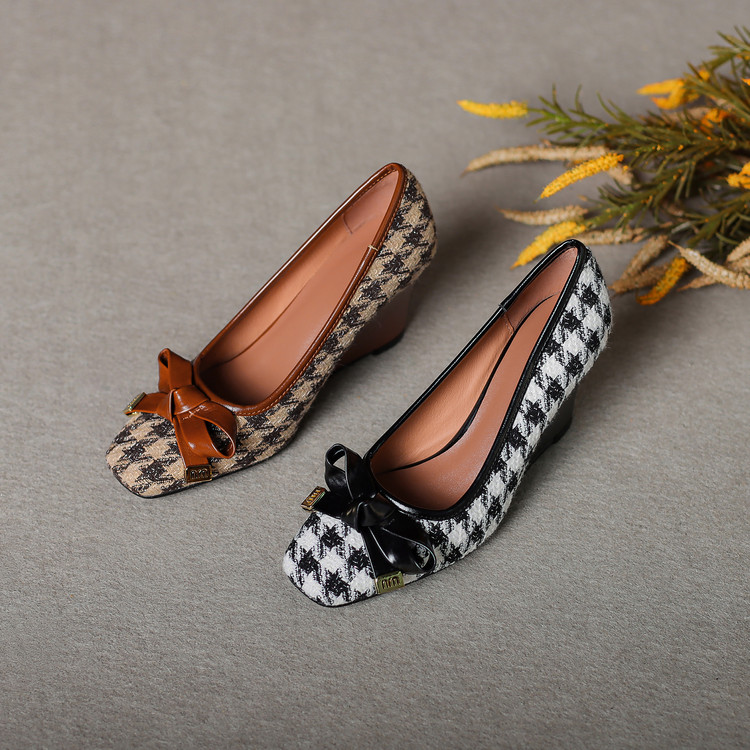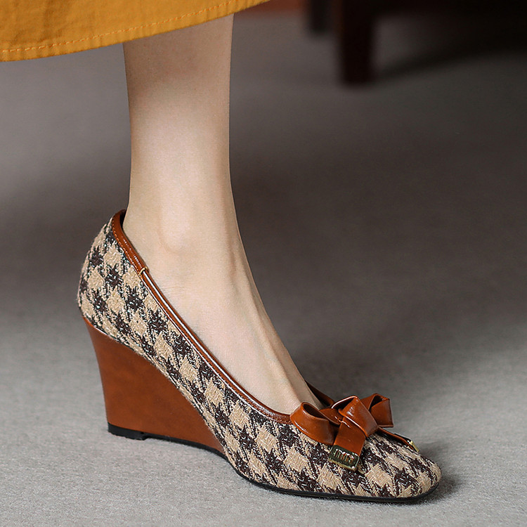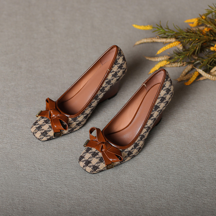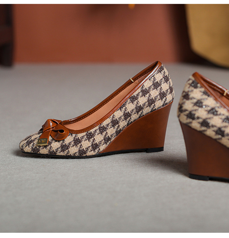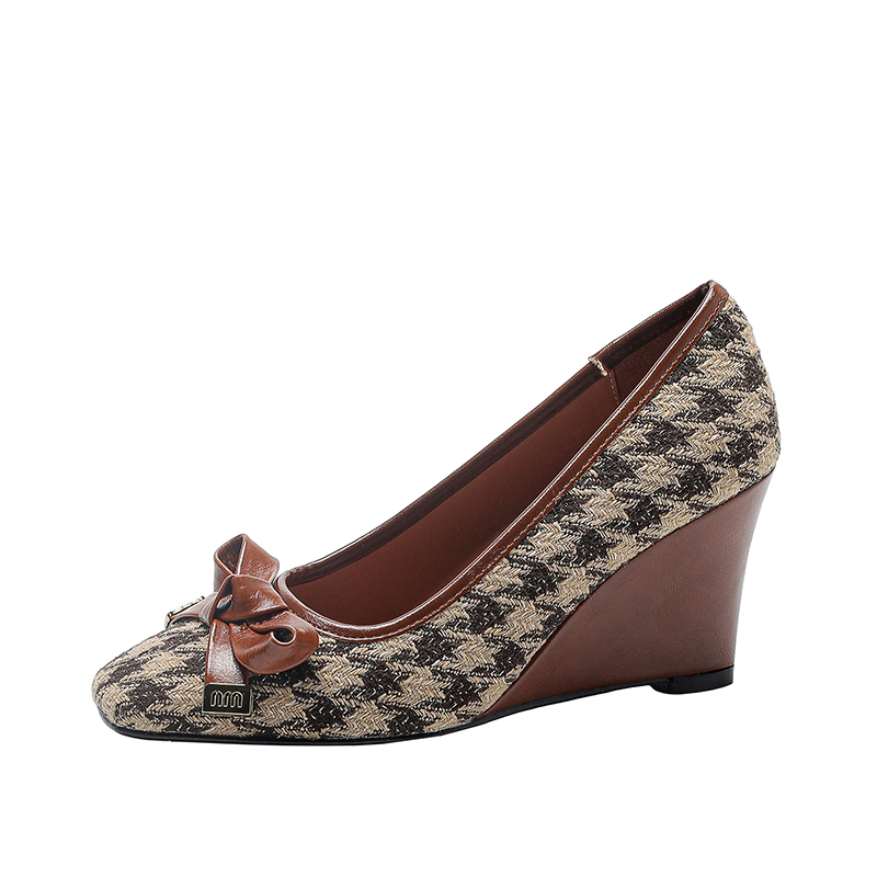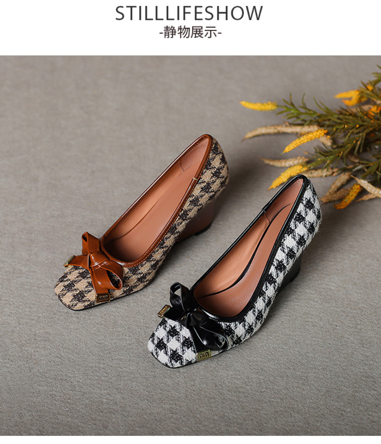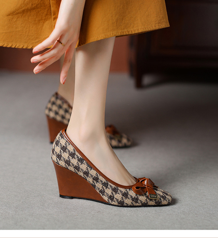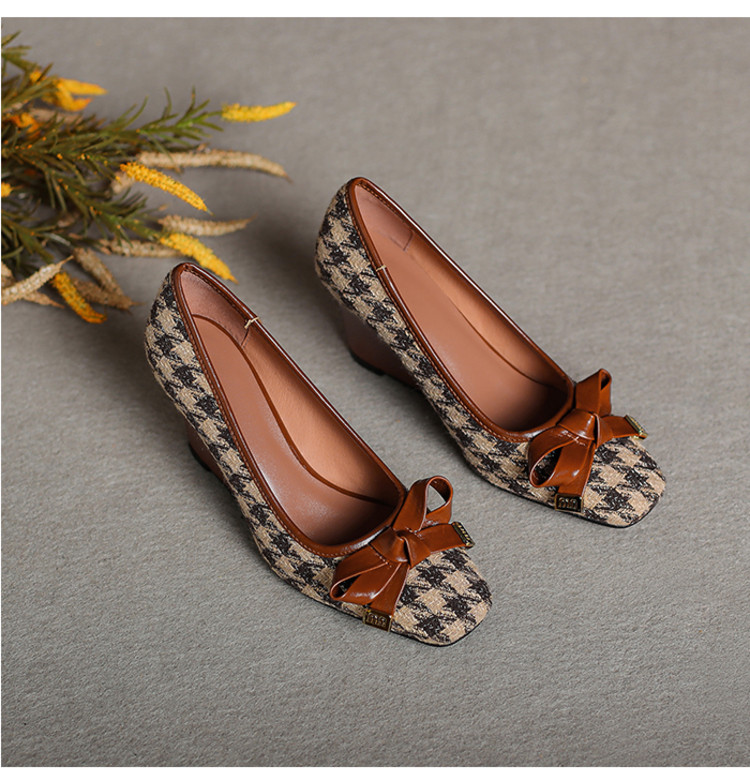 【预售5天】复古棕色千鸟格坡跟单鞋女秋季新款方头浅口显瘦蝴蝶结高跟鞋PPY&25-239