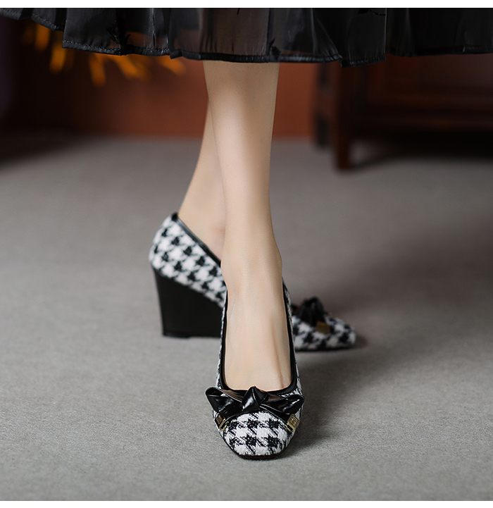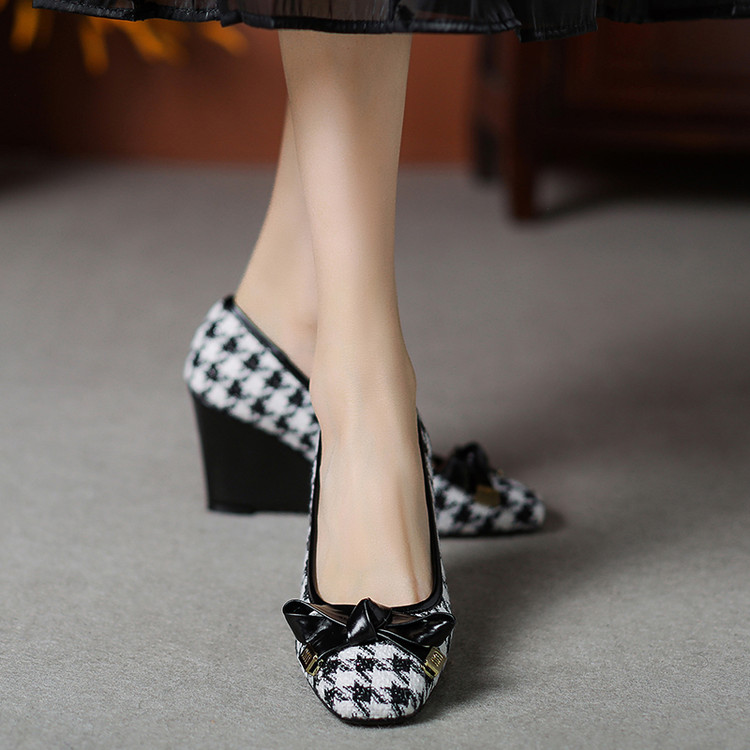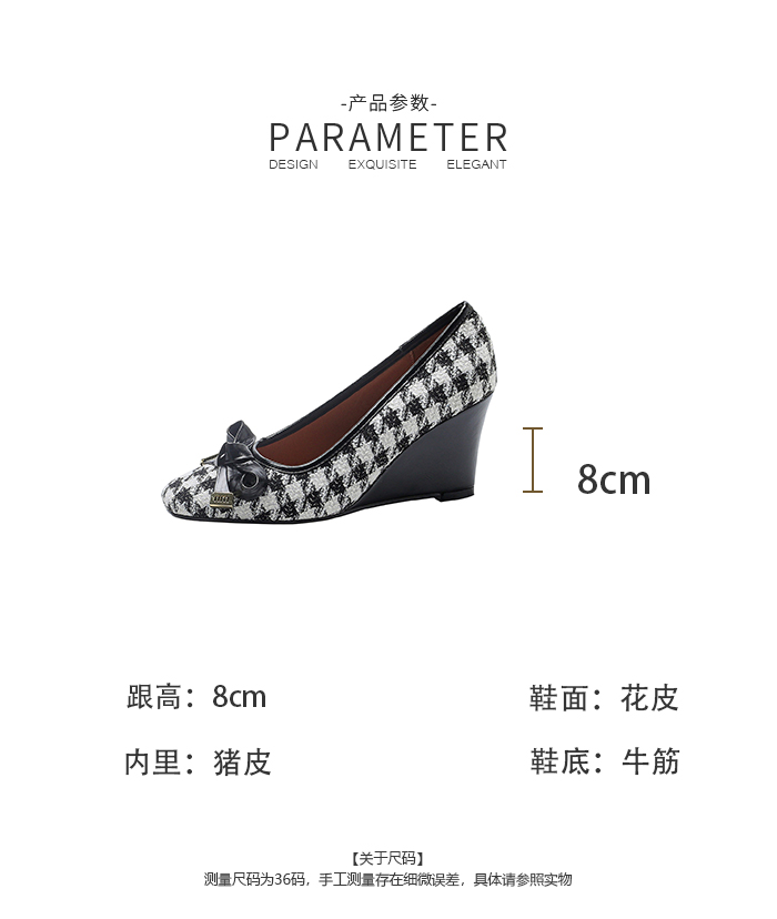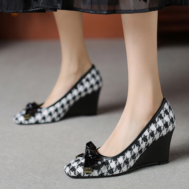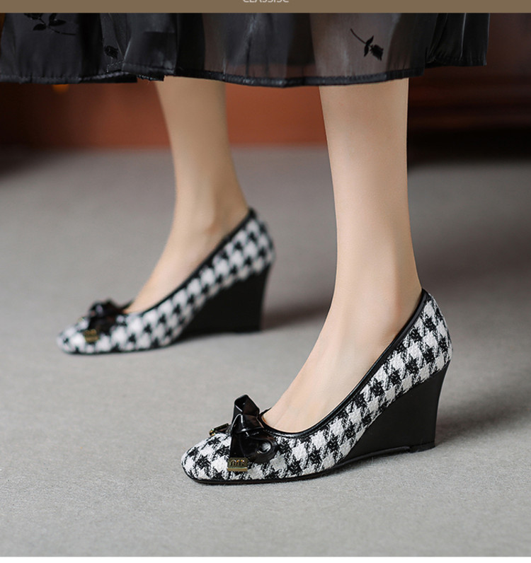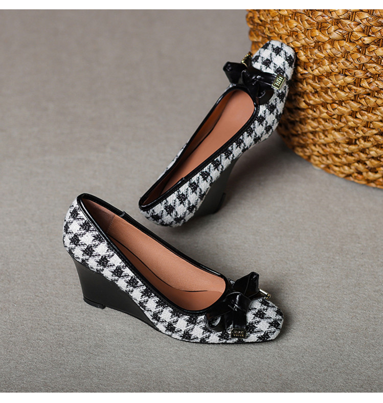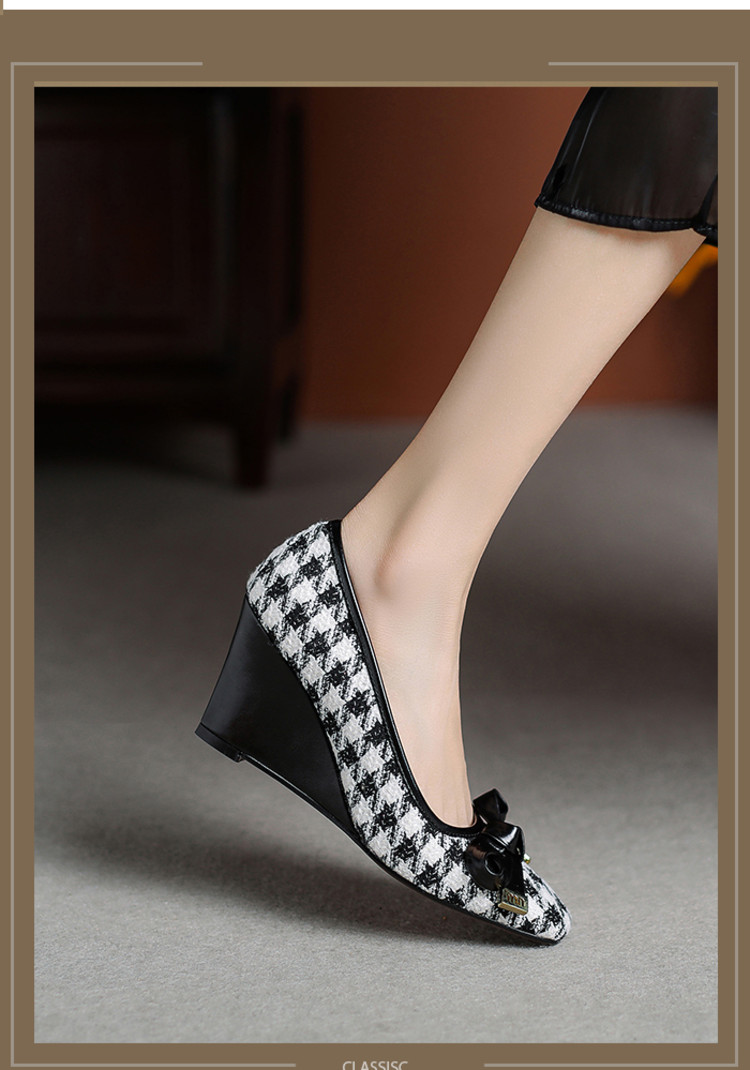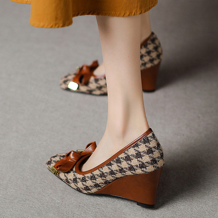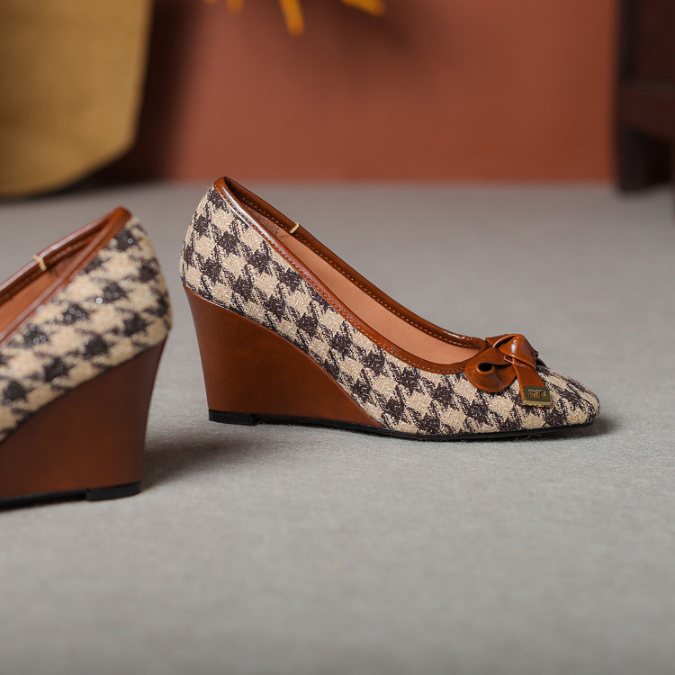【预售5天】复古棕色千鸟格坡跟单鞋女秋季新款方头浅口显瘦蝴蝶结高跟鞋PPY&25-239