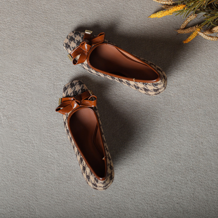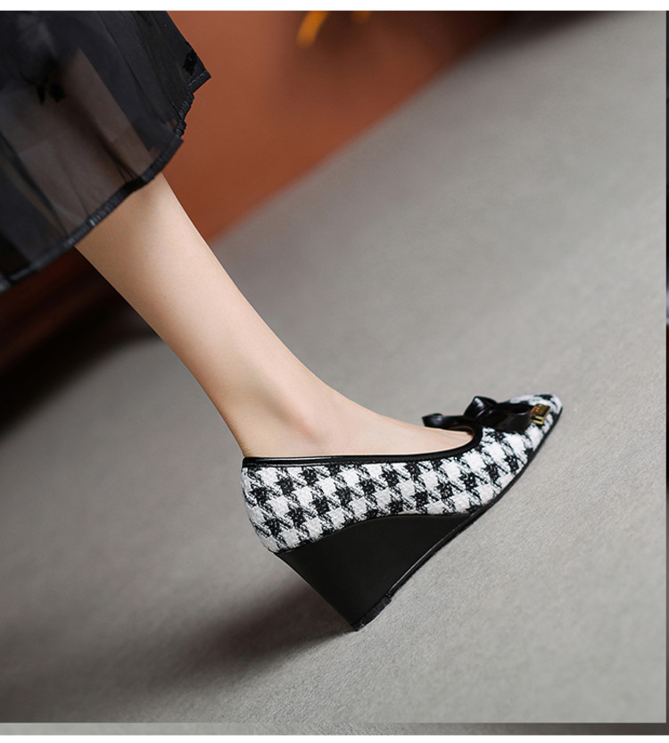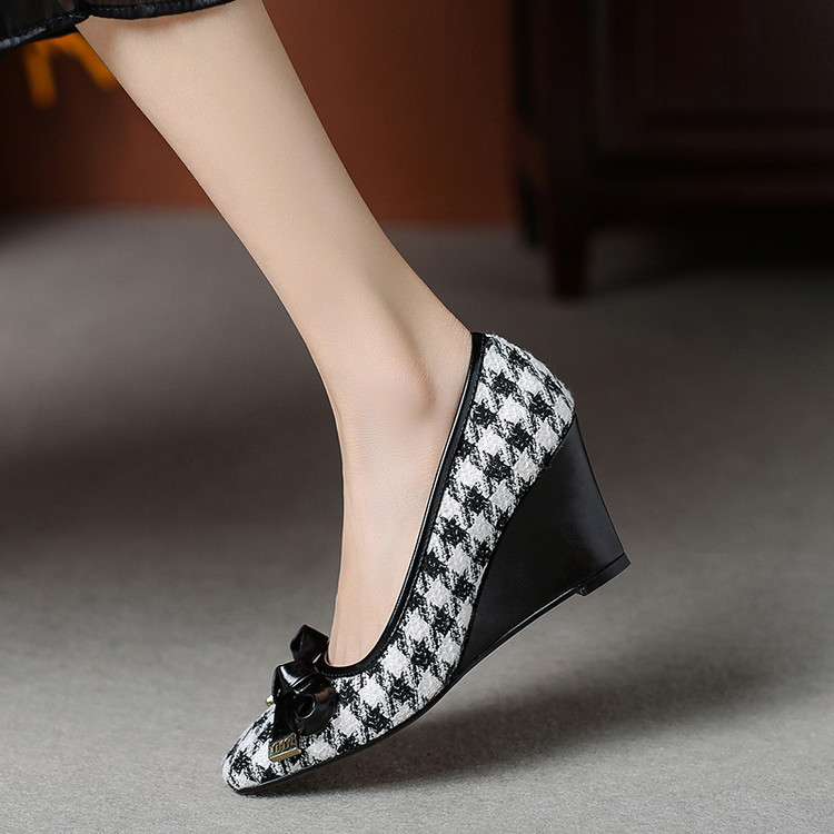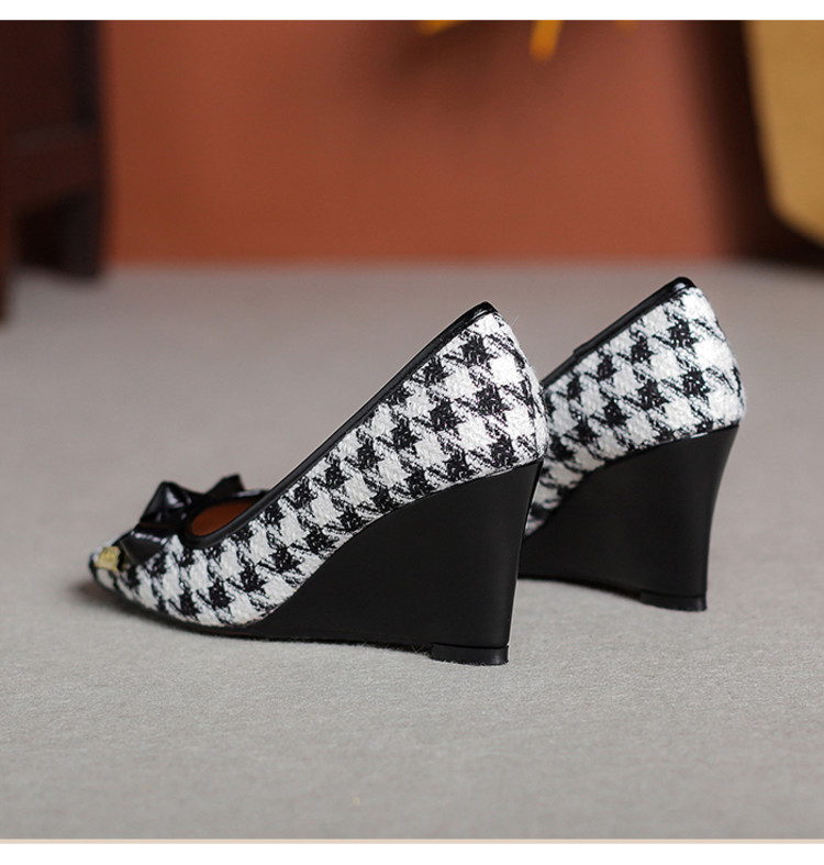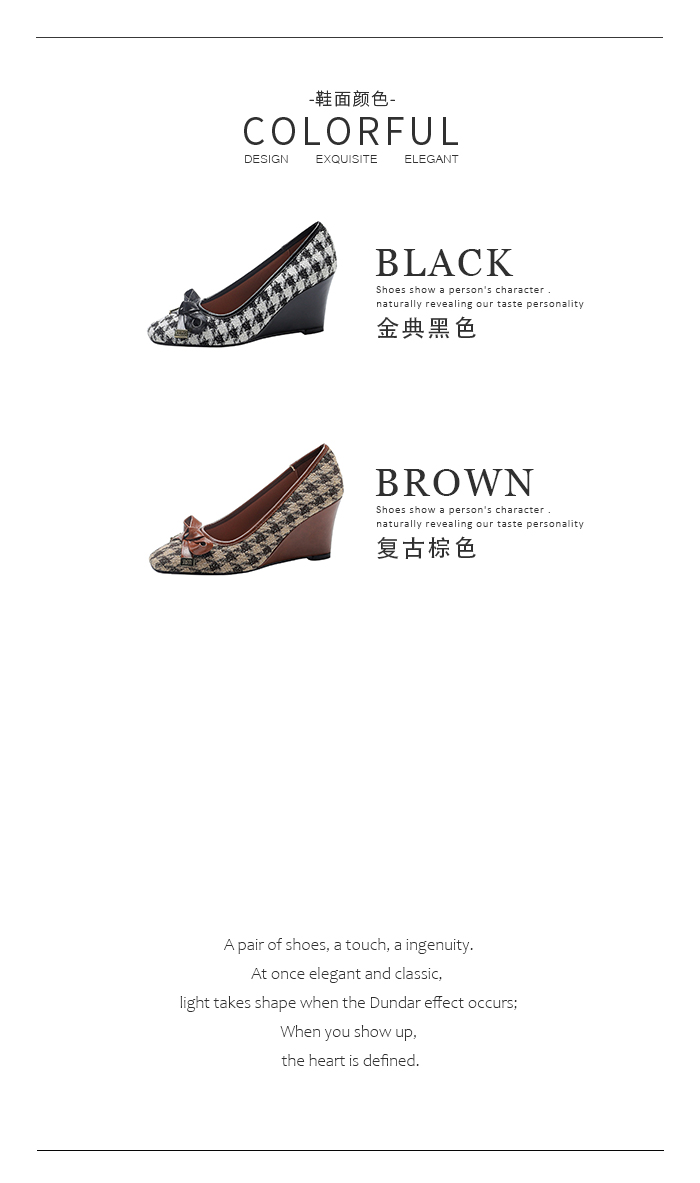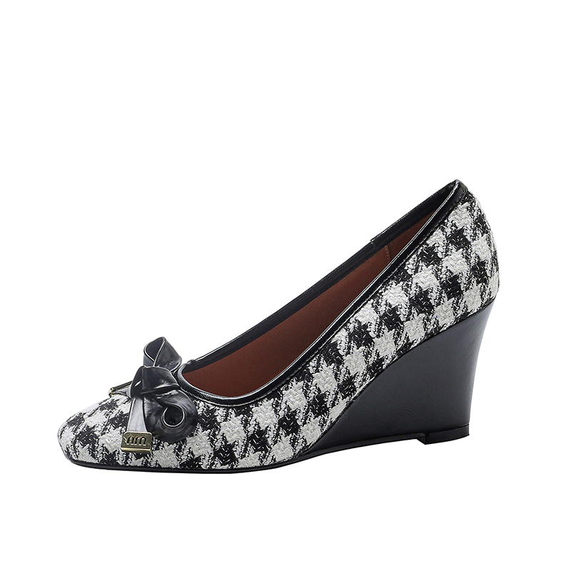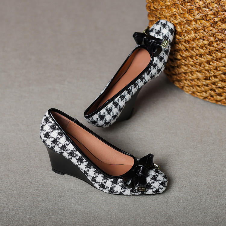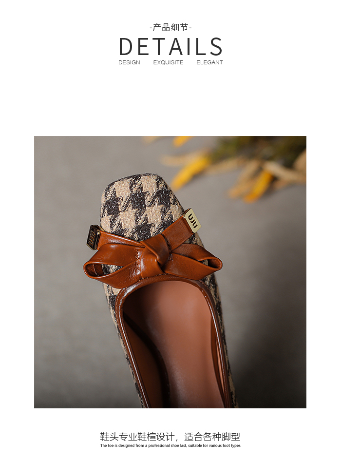 【预售5天】复古棕色千鸟格坡跟单鞋女秋季新款方头浅口显瘦蝴蝶结高跟鞋PPY&25-239