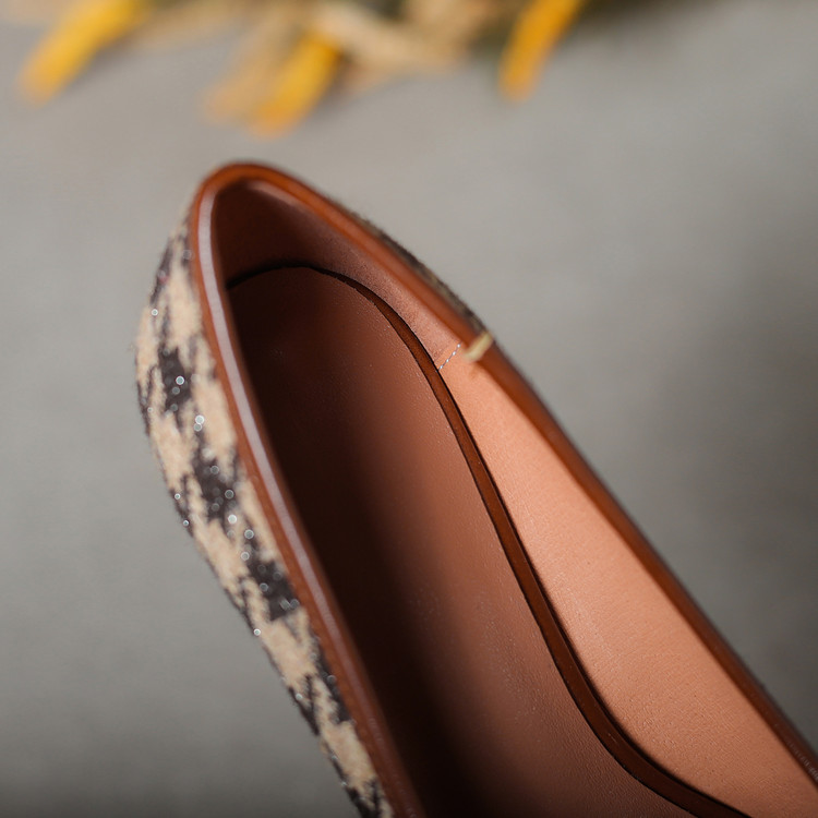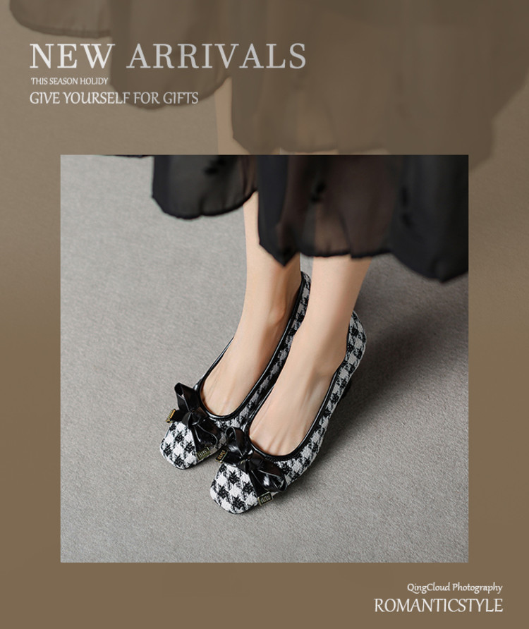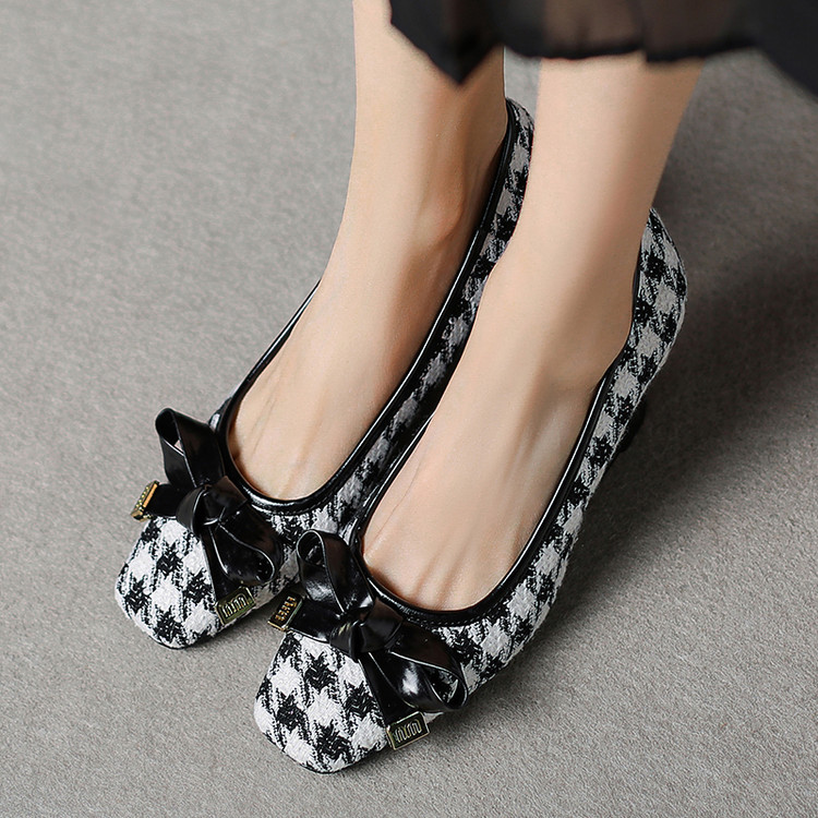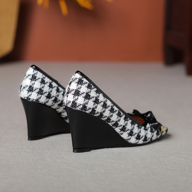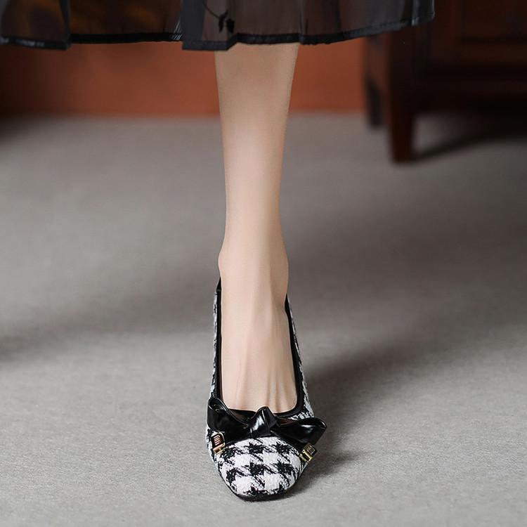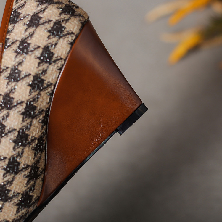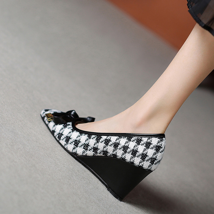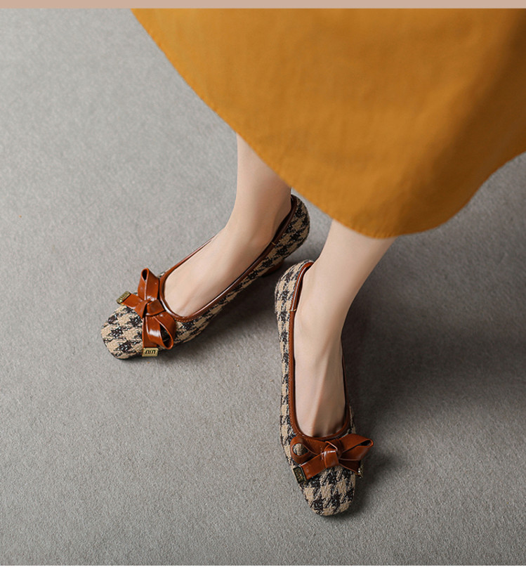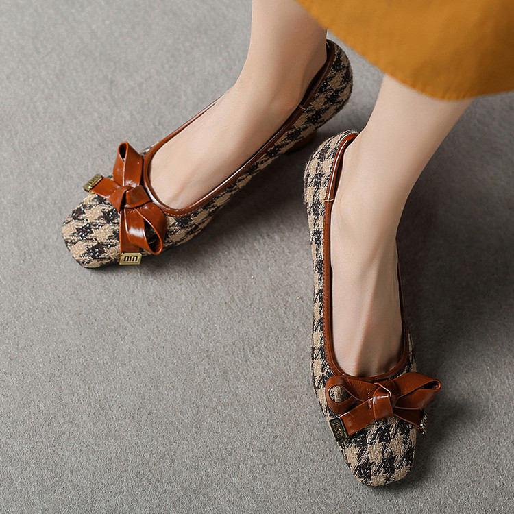 【预售5天】复古棕色千鸟格坡跟单鞋女秋季新款方头浅口显瘦蝴蝶结高跟鞋PPY&25-239