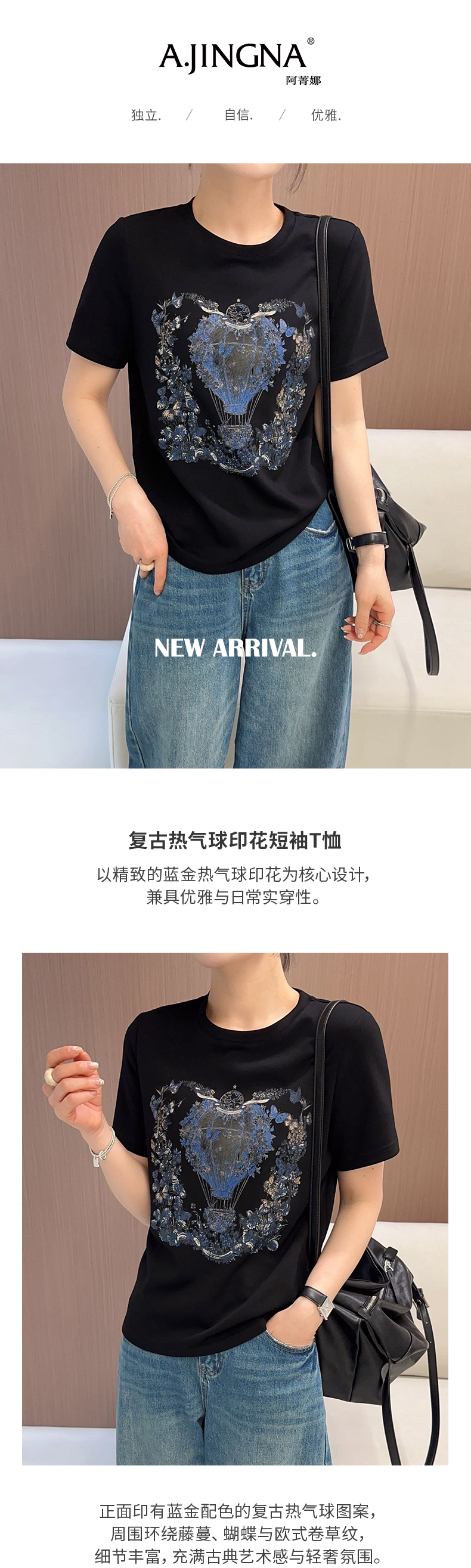 【日常通勤】阿菁娜春季新款复古热气球印花AB面短袖T恤F31C301022