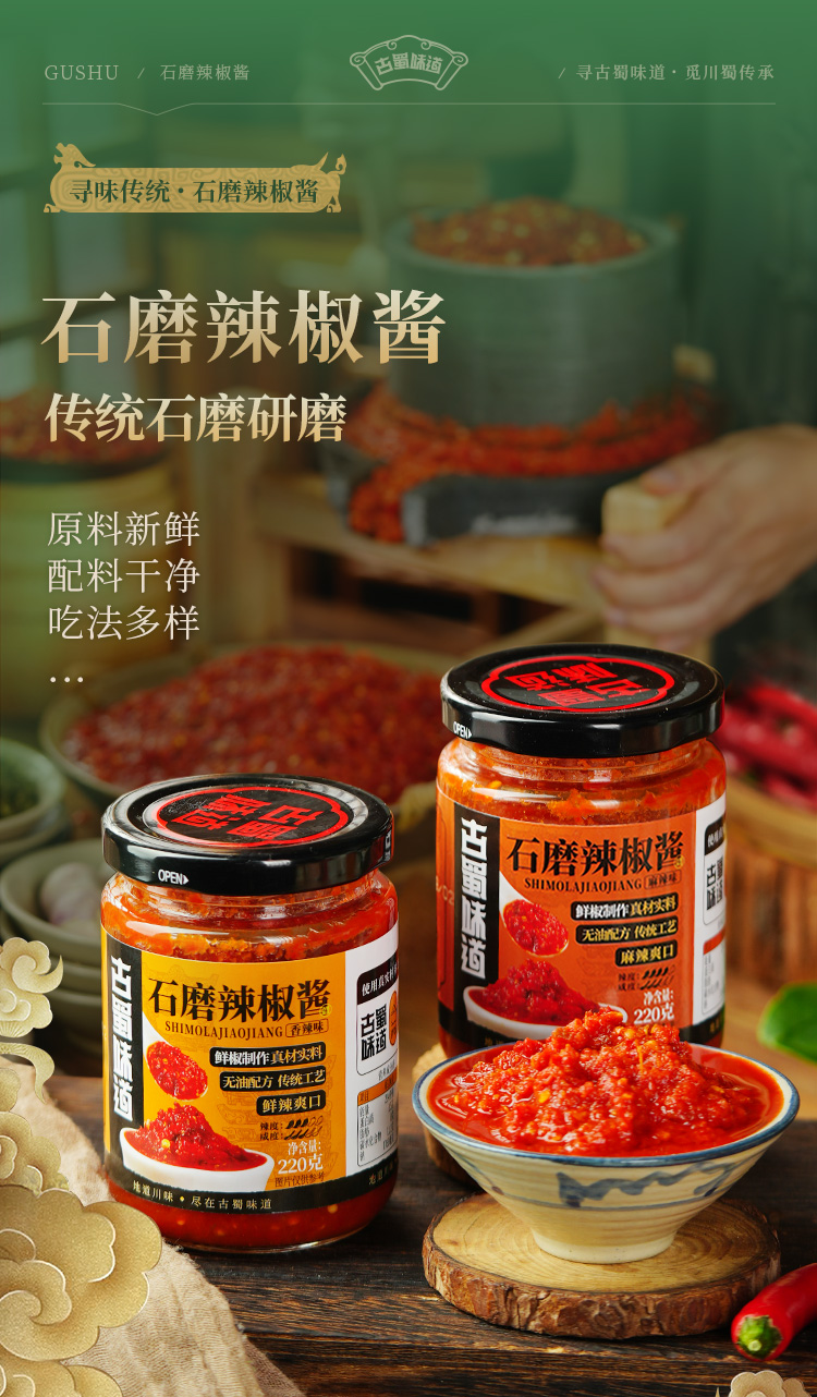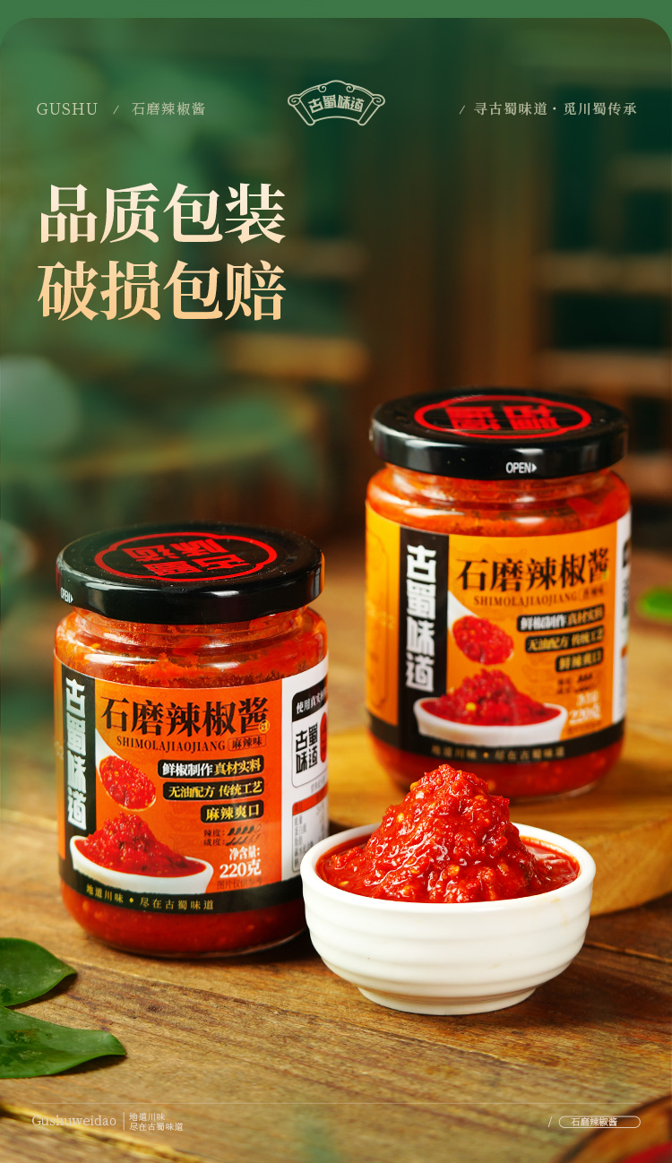 古蜀味道石磨辣椒酱 鲜辣爽口 椒香浓郁 配料干净 商品缩略图0 古蜀味道石磨辣椒酱 鲜辣爽口 椒香浓郁 配料干净 商品缩略图1 古蜀味道石磨辣椒酱 鲜辣爽口 椒香浓郁 配料干净 商品缩略图2 古蜀味道石磨辣椒酱 鲜辣爽口 椒香浓郁 配料干净 商品缩略图3 古蜀味道石磨辣椒酱 鲜辣爽口 椒香浓郁 配料干净 商品缩略图4