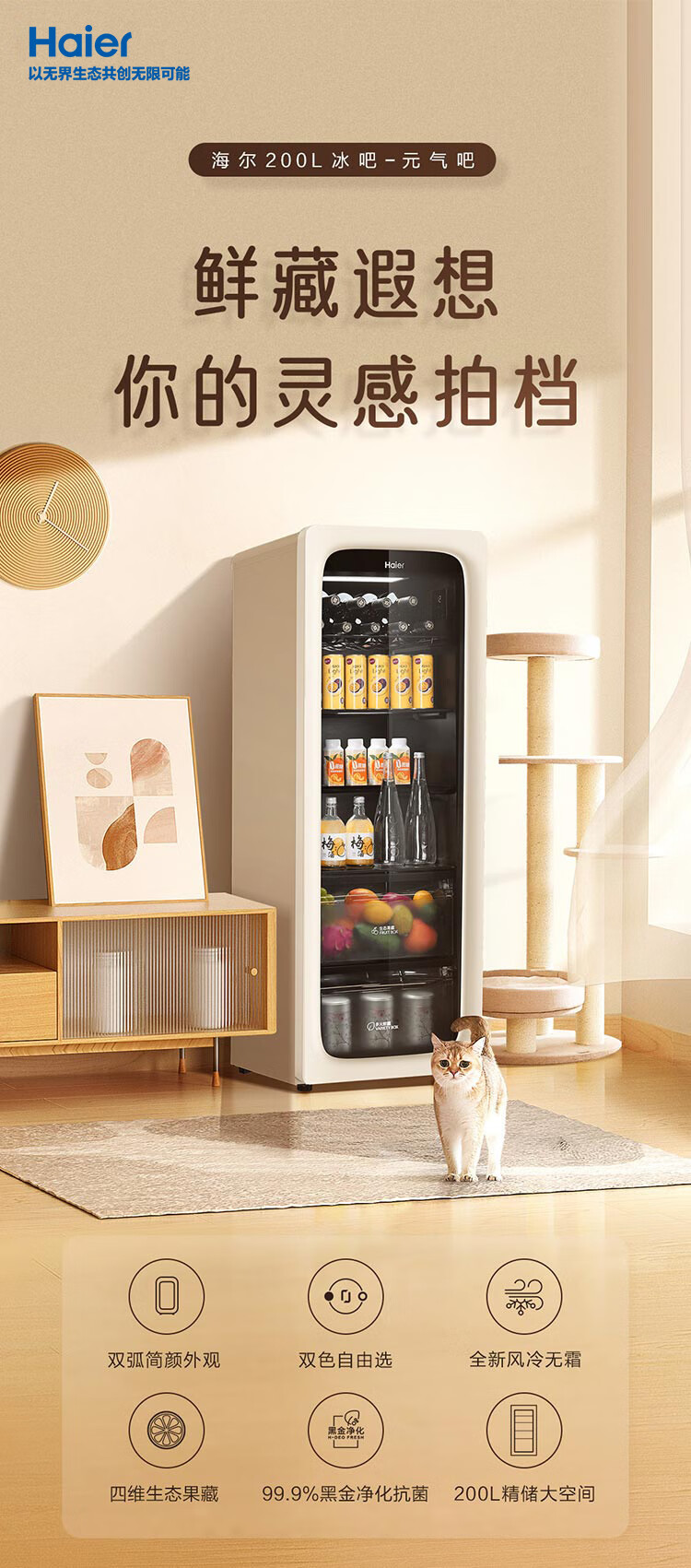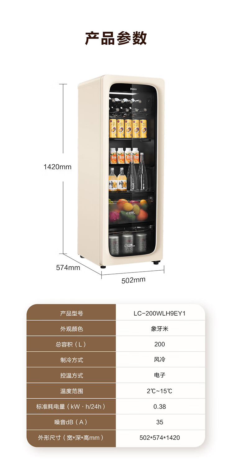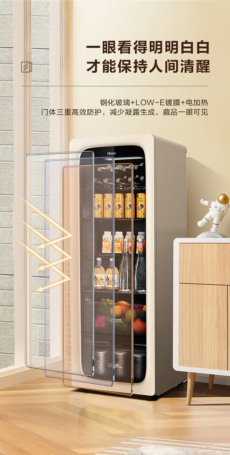 海尔200升一级能效家用客厅办公室冷藏柜暖藏冰吧元气吧茶叶饮料水果蔬菜小冰箱LC-200WLH9EY1