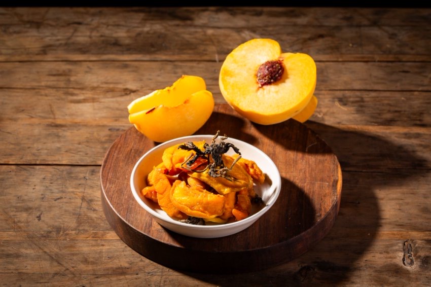 保留果肉柔韧与紫苏清香,甜中带一丝草本回甘,黄桃的浓郁果香与紫苏的独特辛香交织,酸甜平衡嚼劲十足。