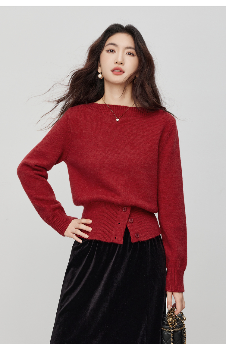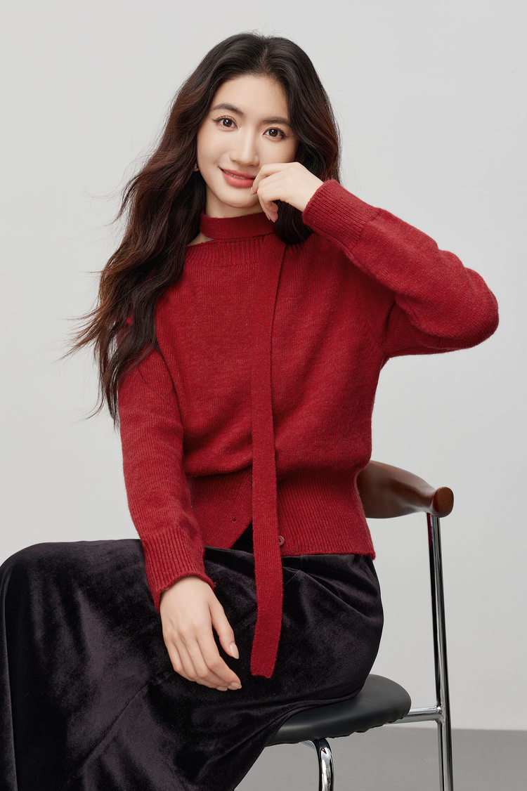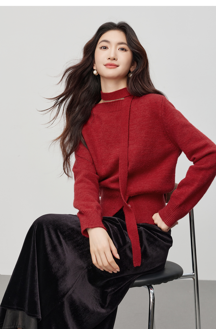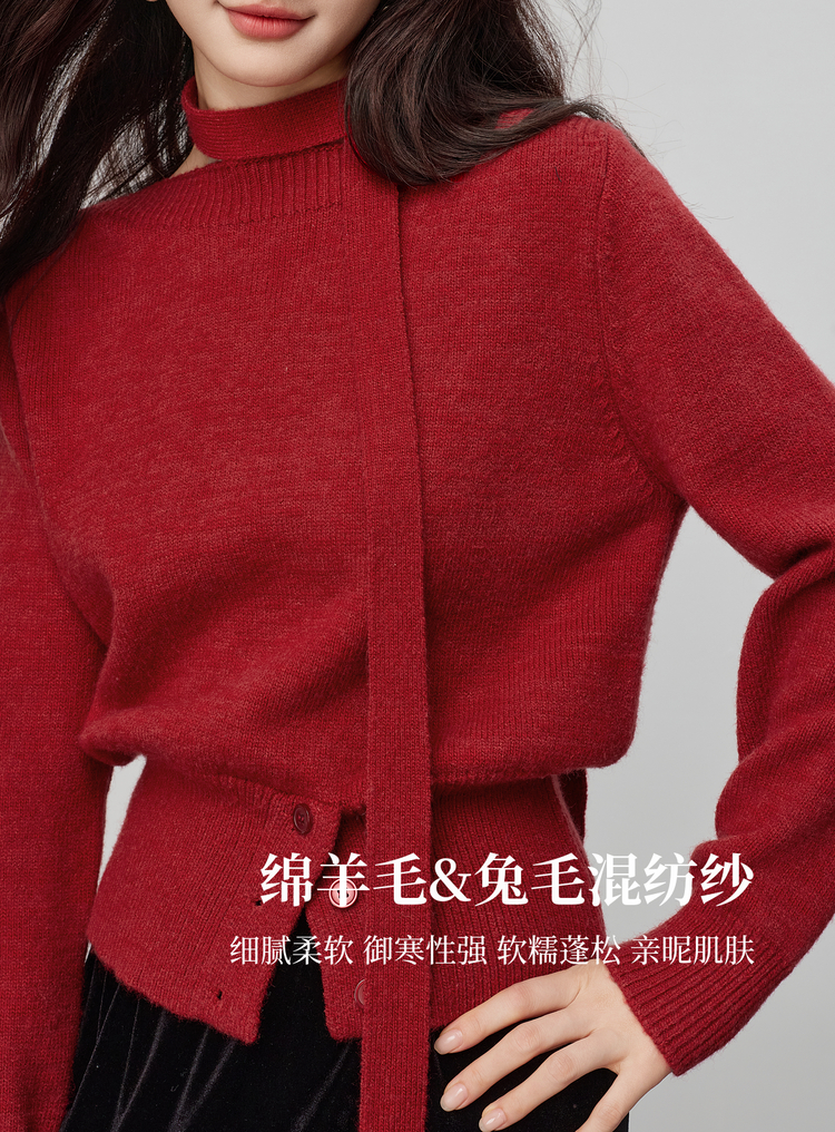 【12/03新品】熙世界绵羊毛&兔毛圣诞红色毛衣女冬季套头挂脖设计氛围感针织衫