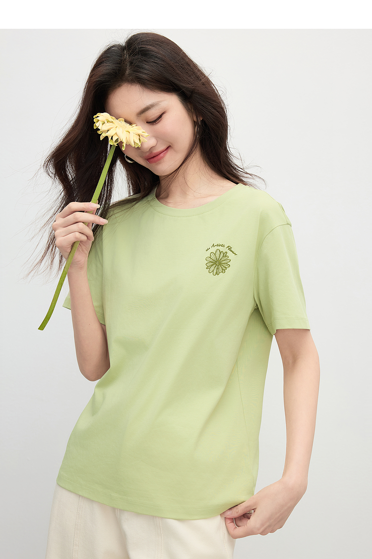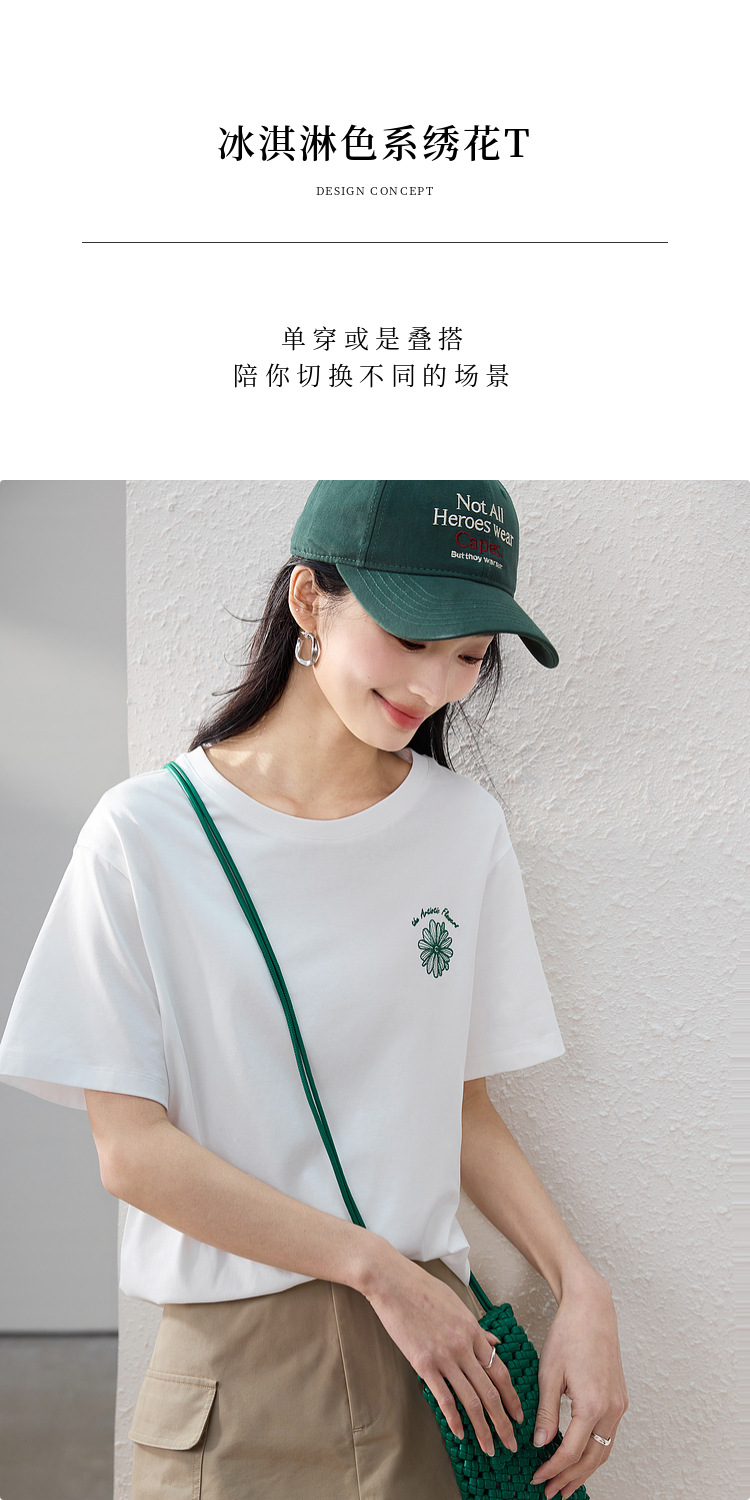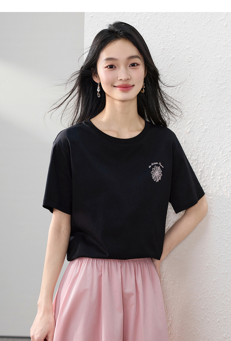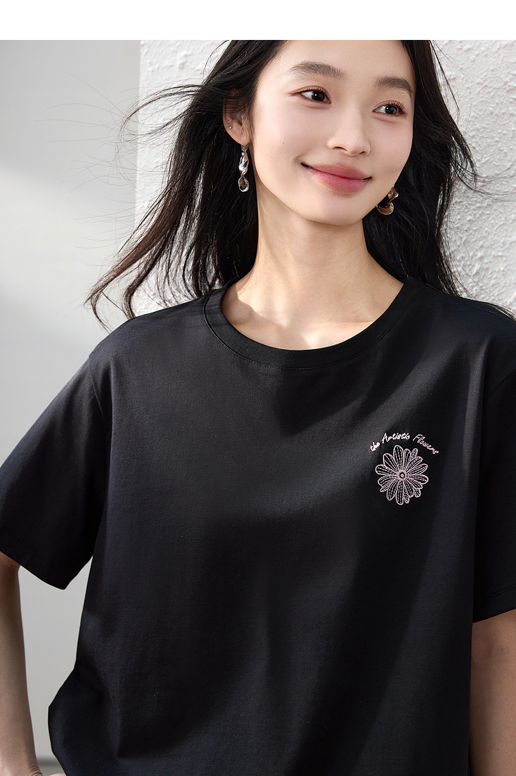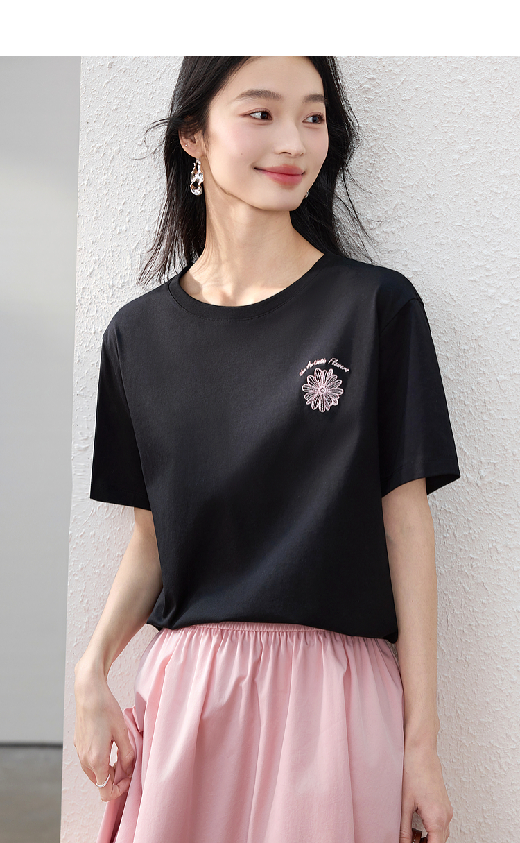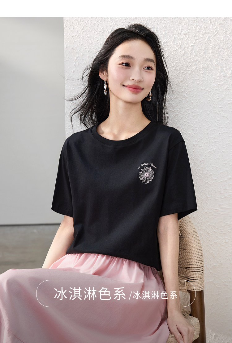 【周末秒杀】熙世界短袖女t恤女夏2025新款休闲宽松圆领花卉刺绣正肩体恤上衣