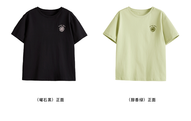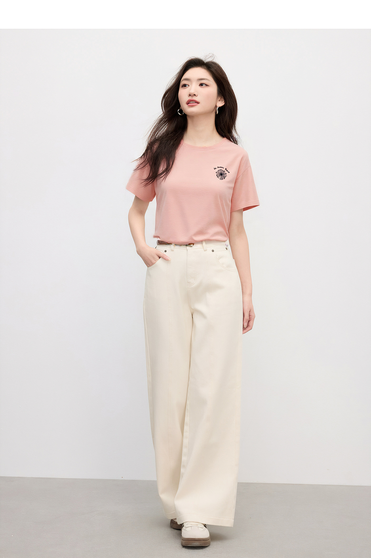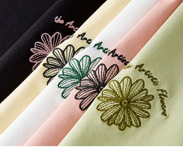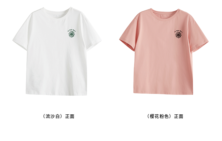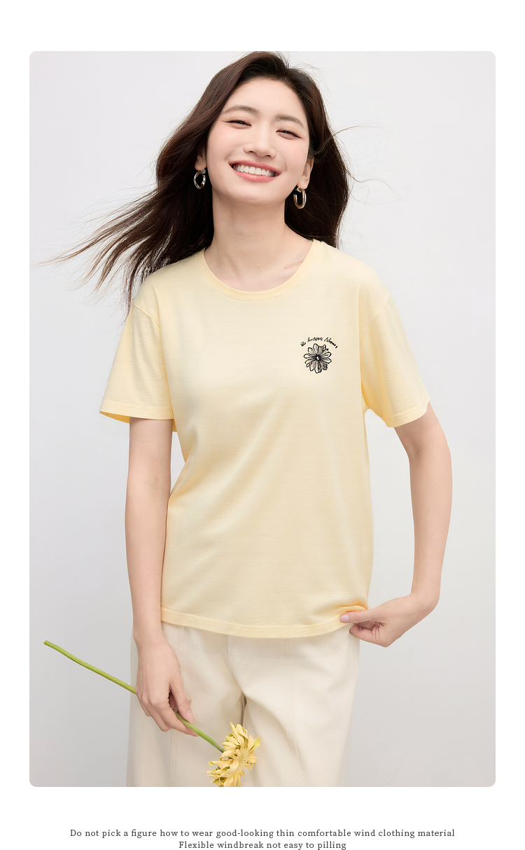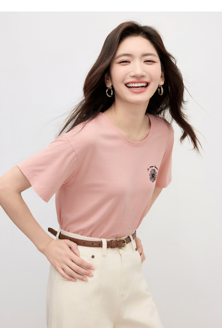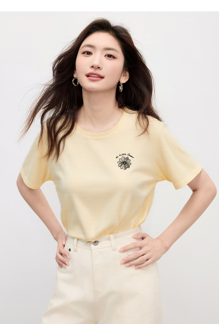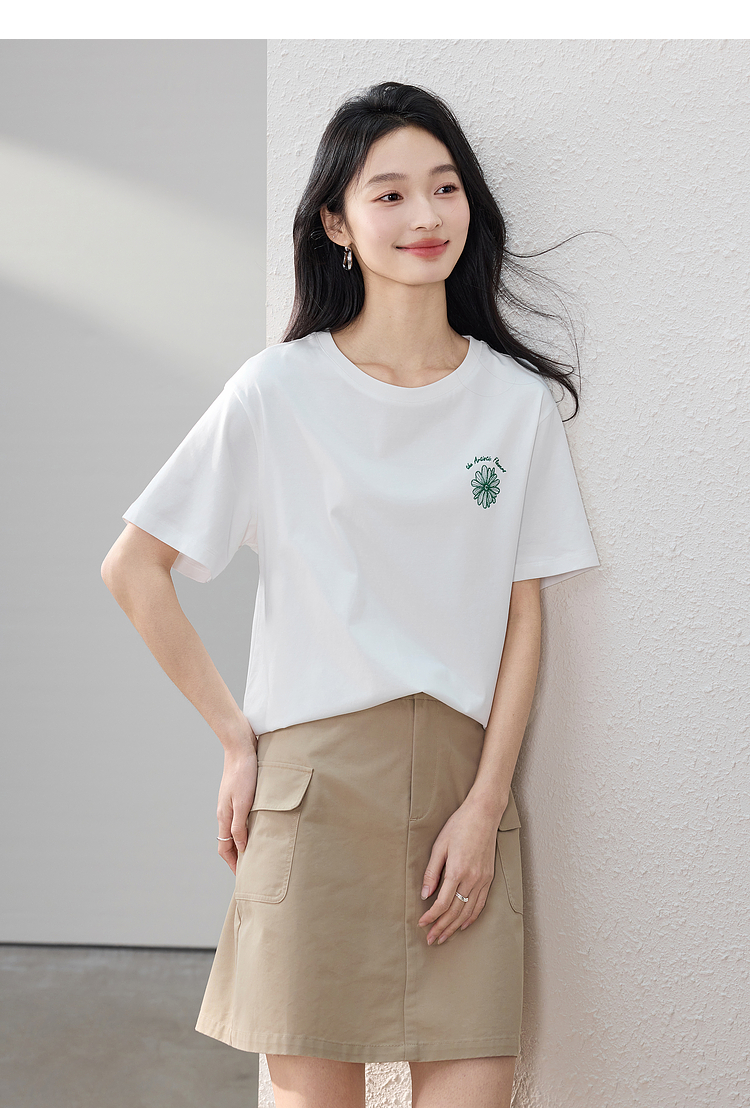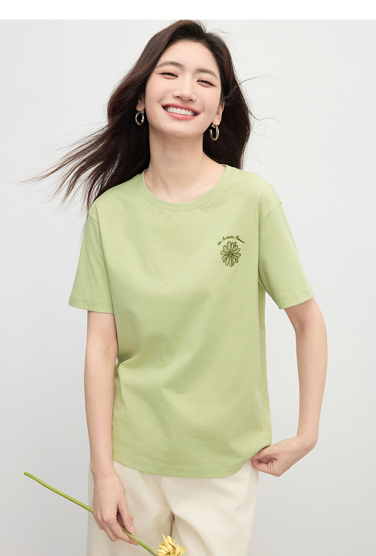 【周末秒杀】熙世界短袖女t恤女夏2025新款休闲宽松圆领花卉刺绣正肩体恤上衣