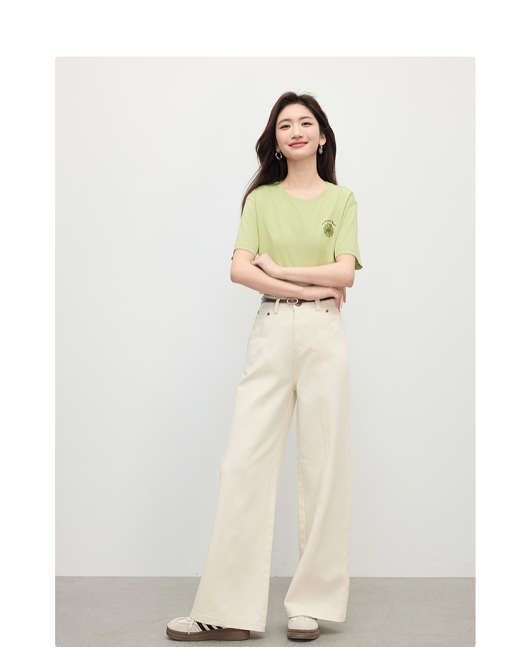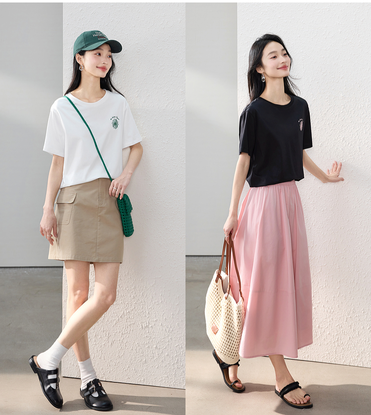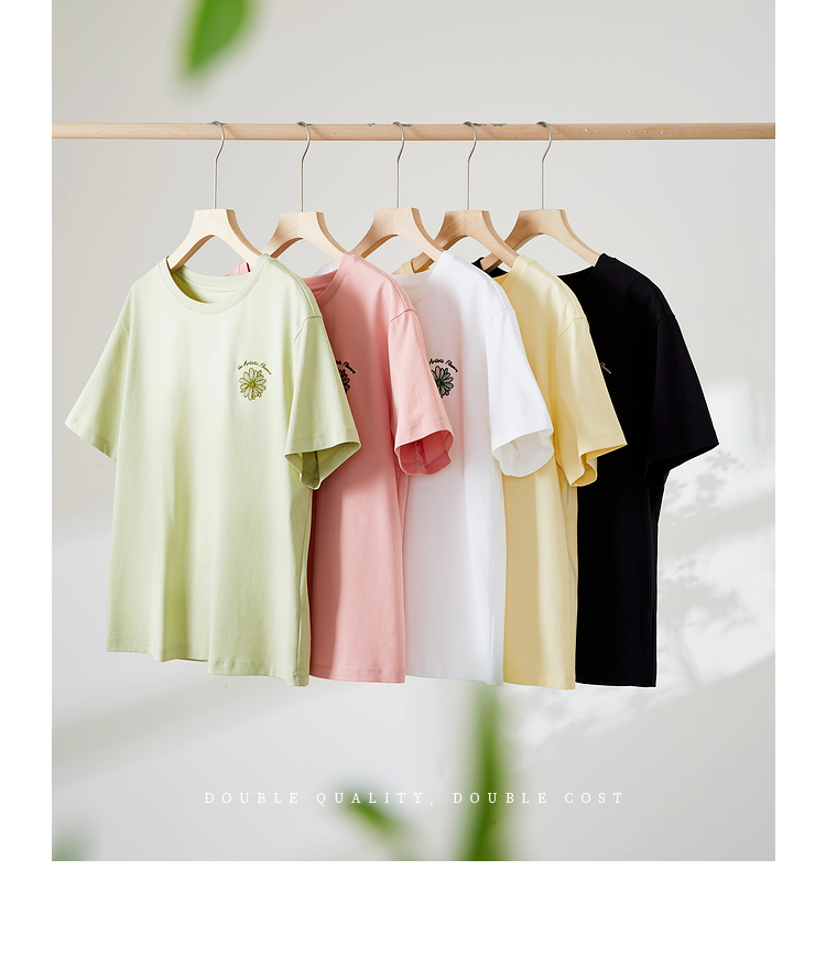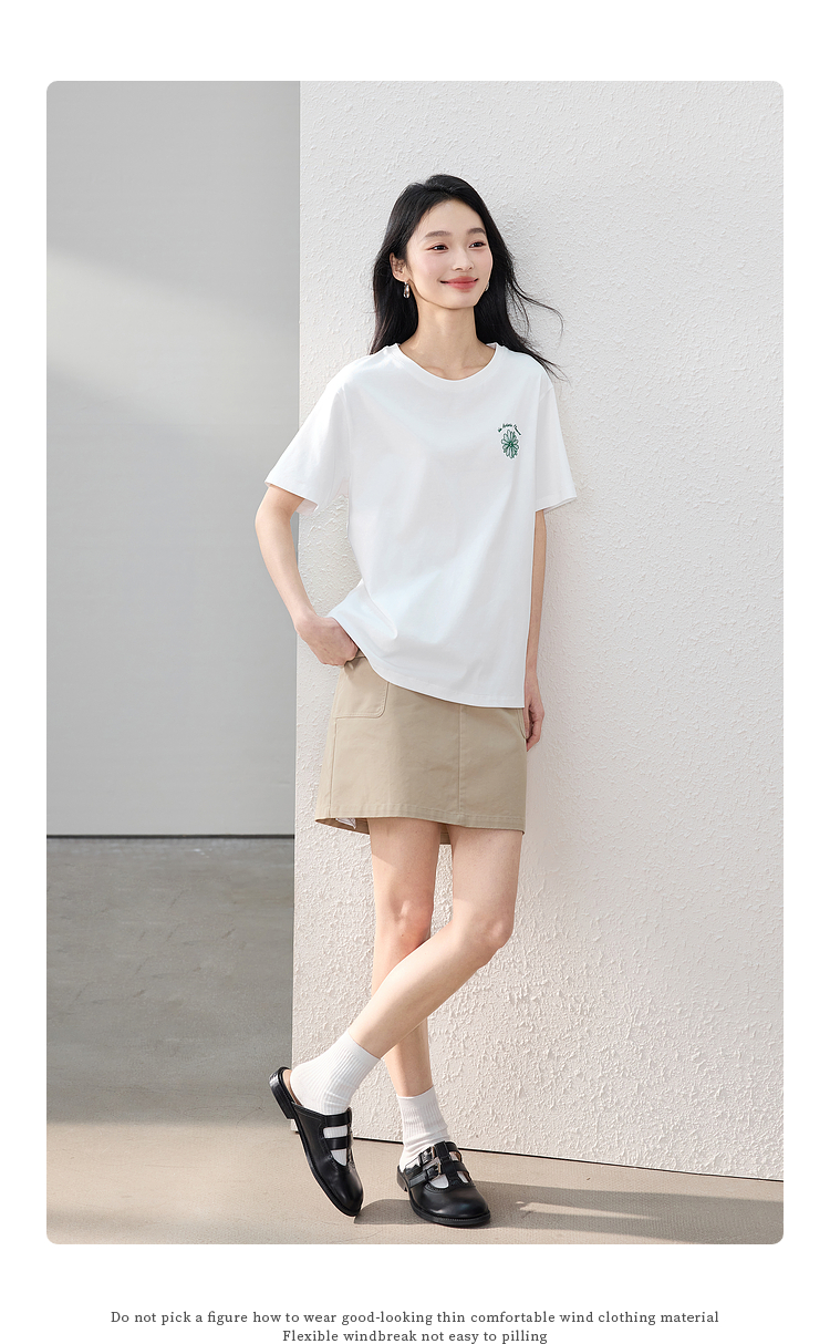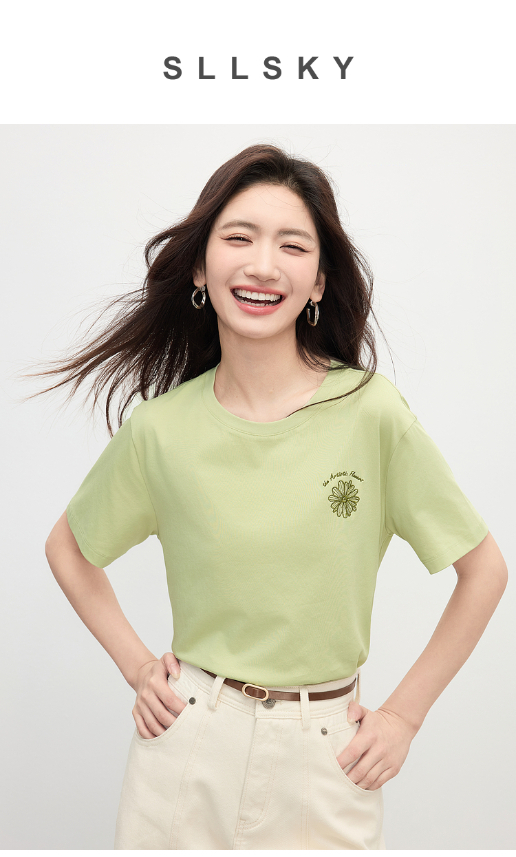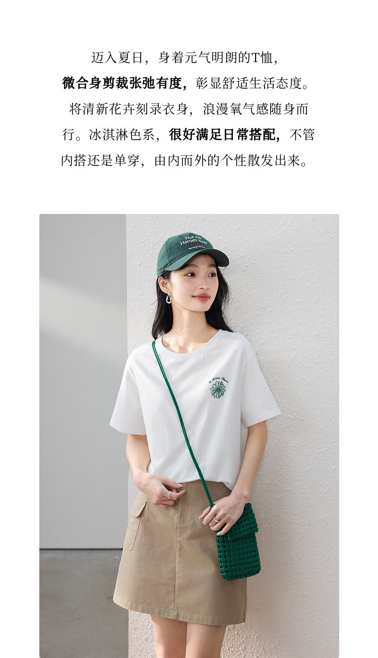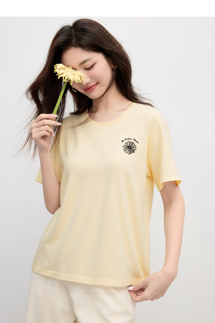 【周末秒杀】熙世界短袖女t恤女夏2025新款休闲宽松圆领花卉刺绣正肩体恤上衣