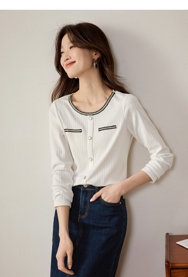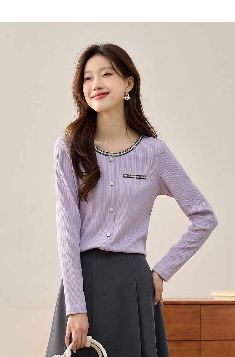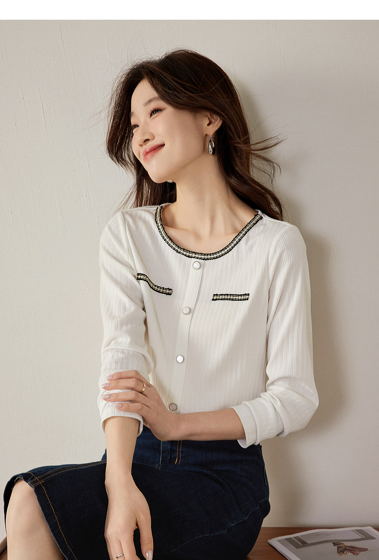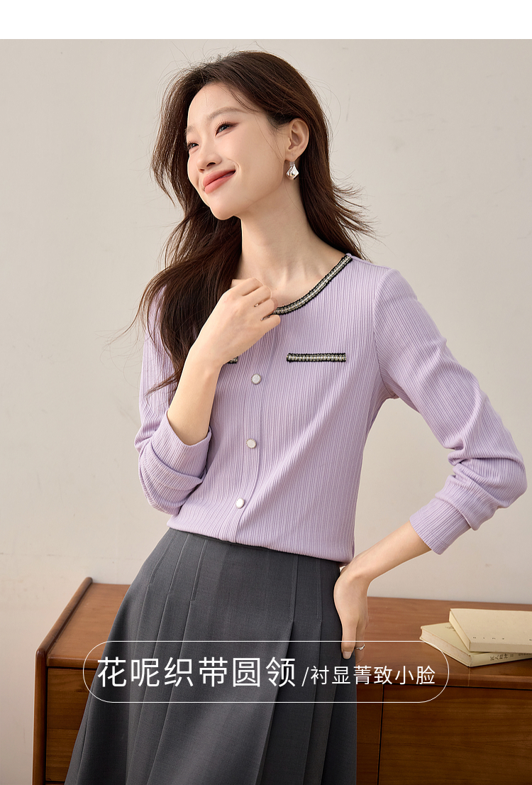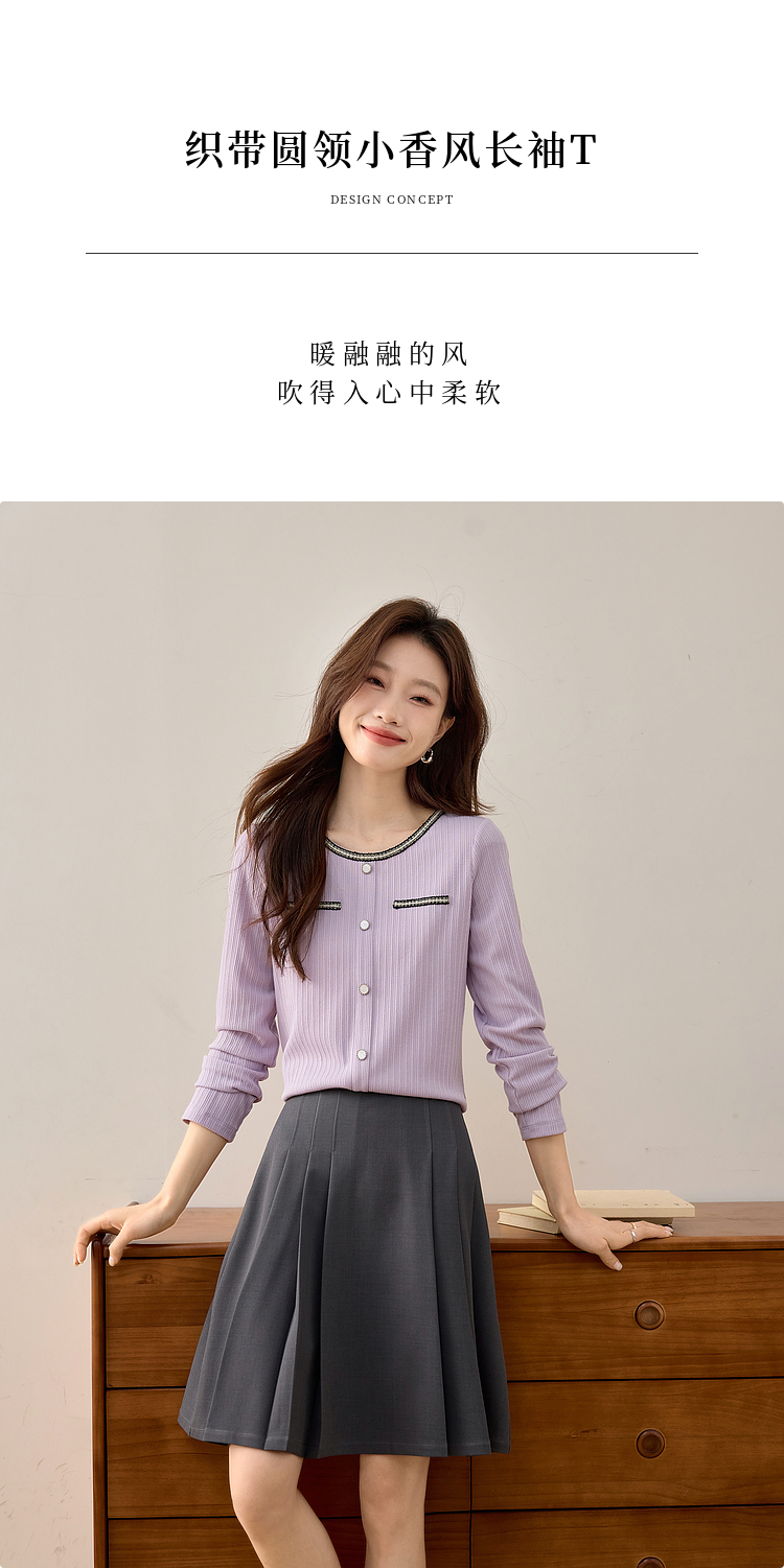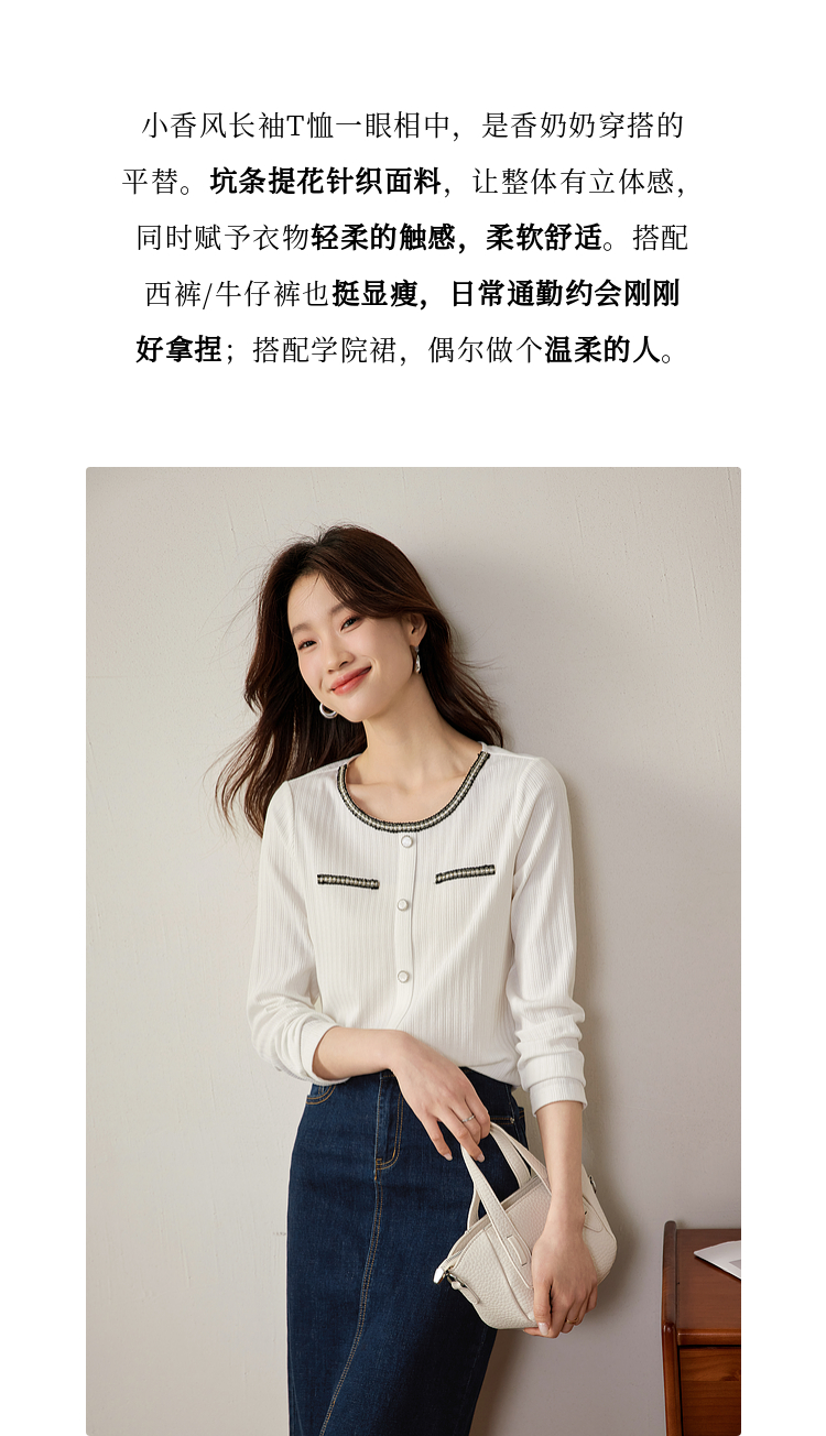 【专属特卖】熙世界小香风正肩T恤女长袖2025春秋新款气质肌理感织带圆领上衣