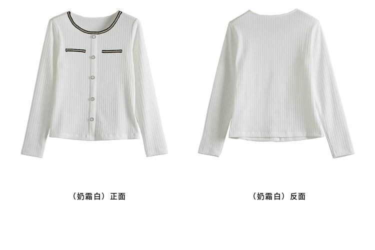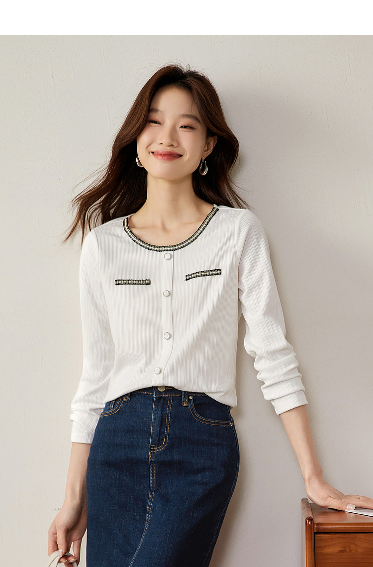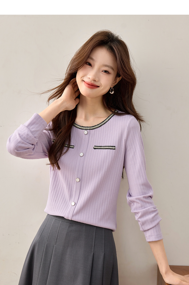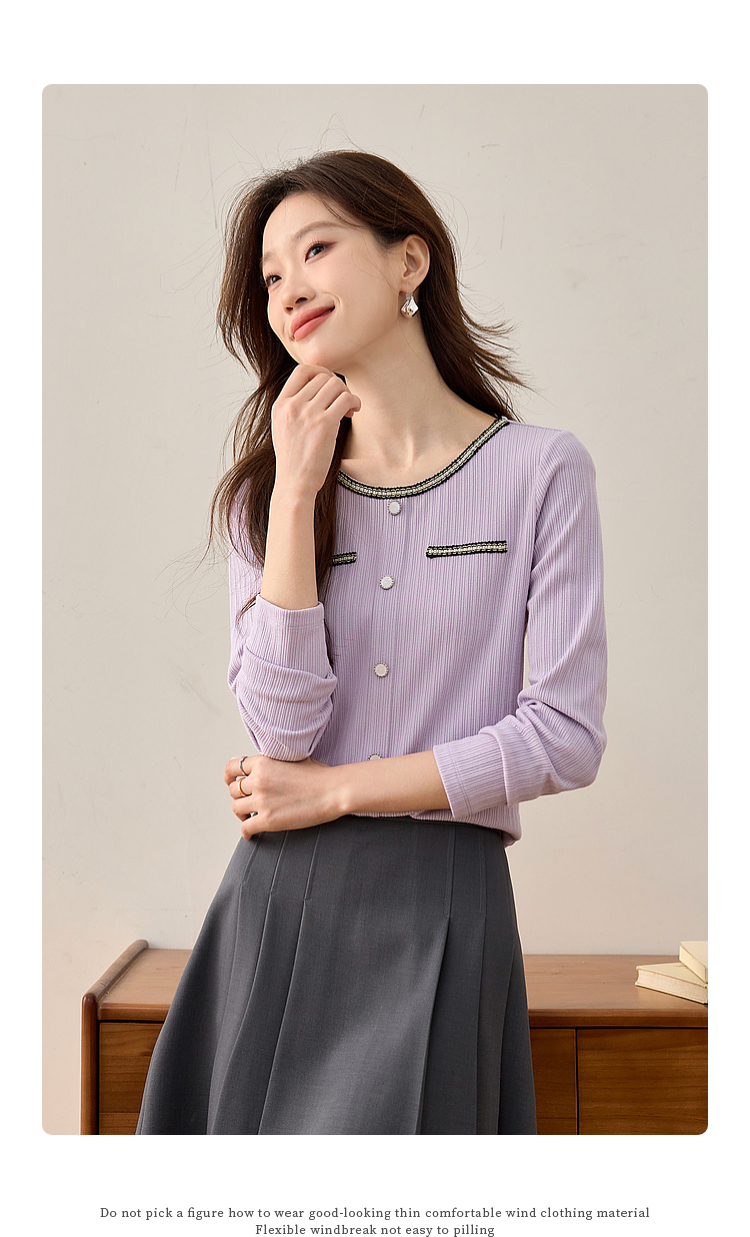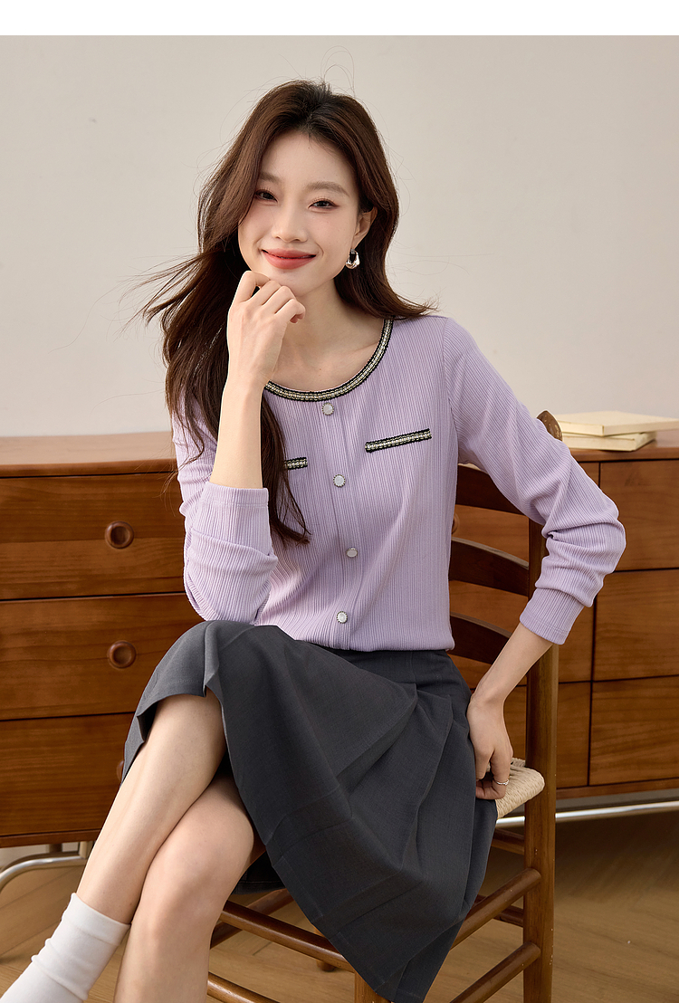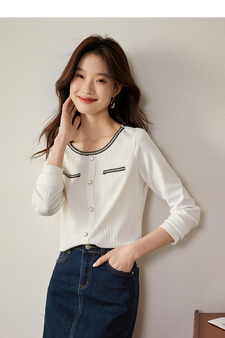 【专属特卖】熙世界小香风正肩T恤女长袖2025春秋新款气质肌理感织带圆领上衣