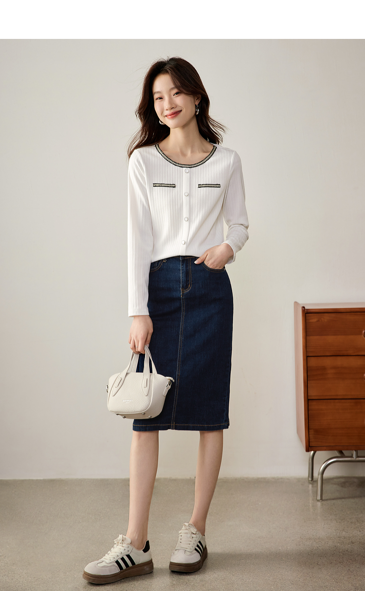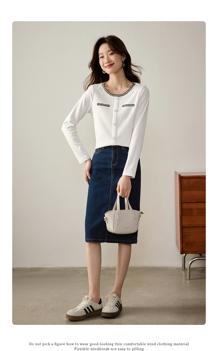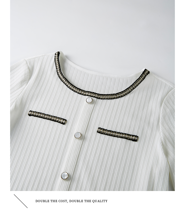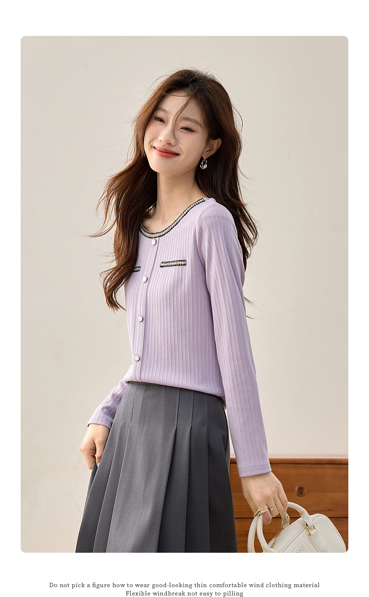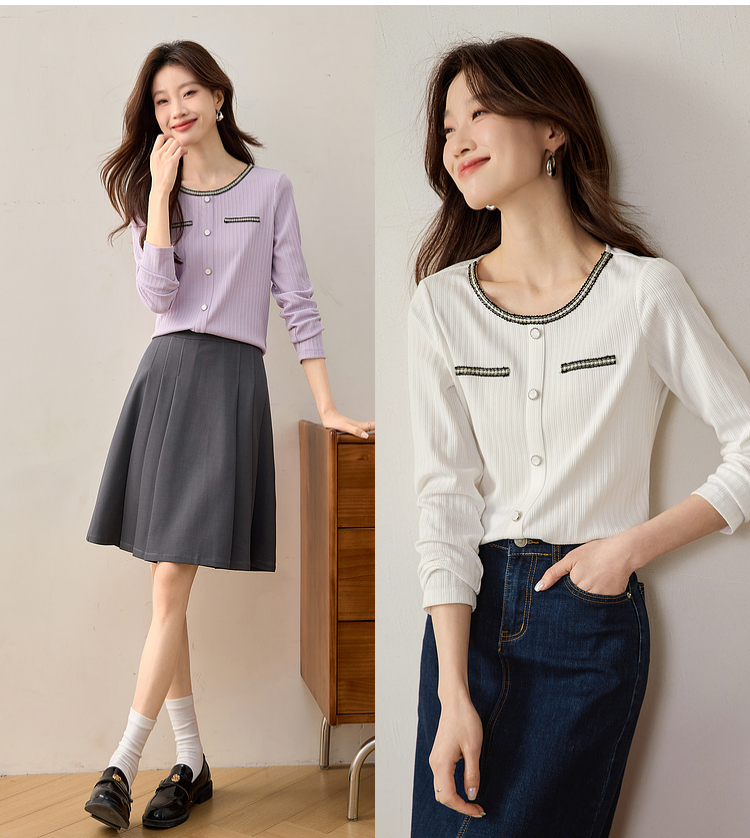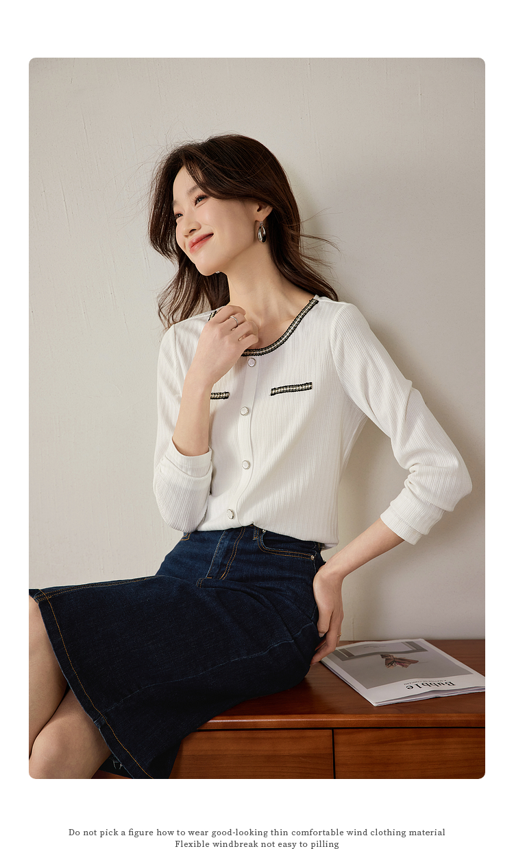 【专属特卖】熙世界小香风正肩T恤女长袖2025春秋新款气质肌理感织带圆领上衣