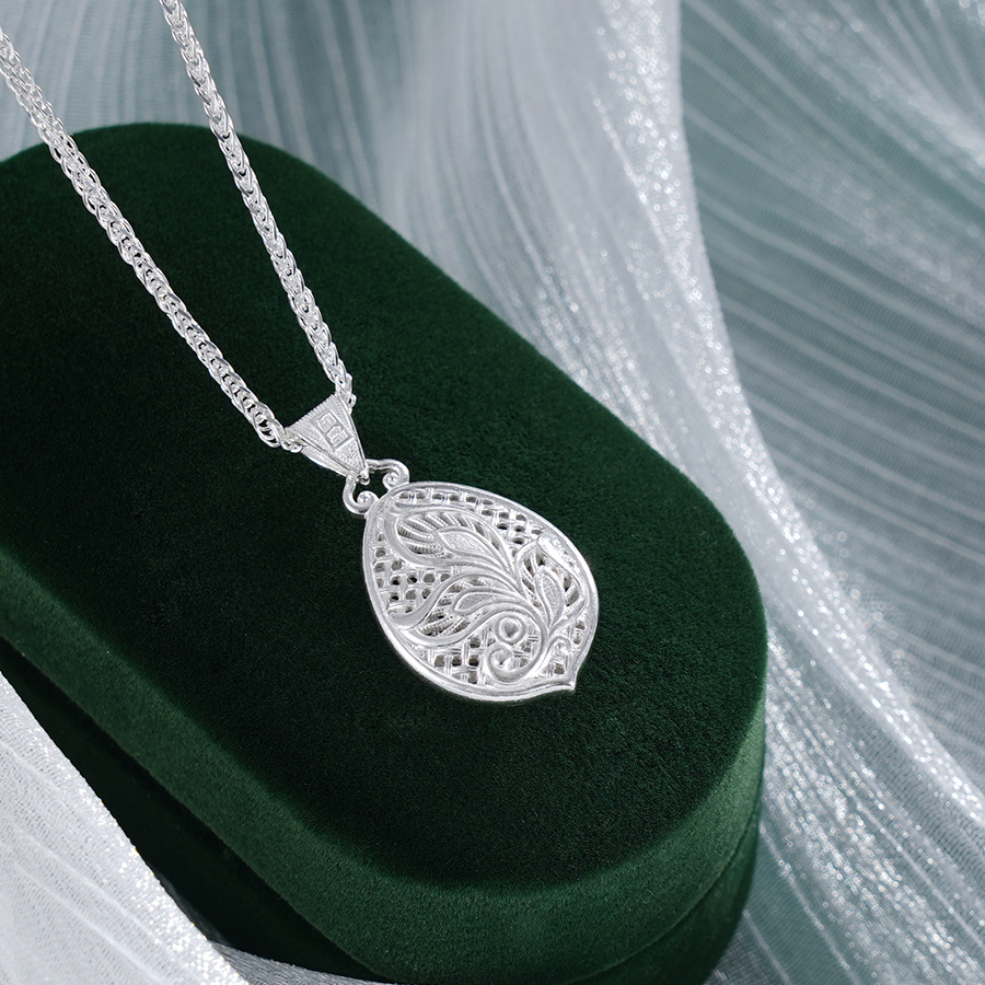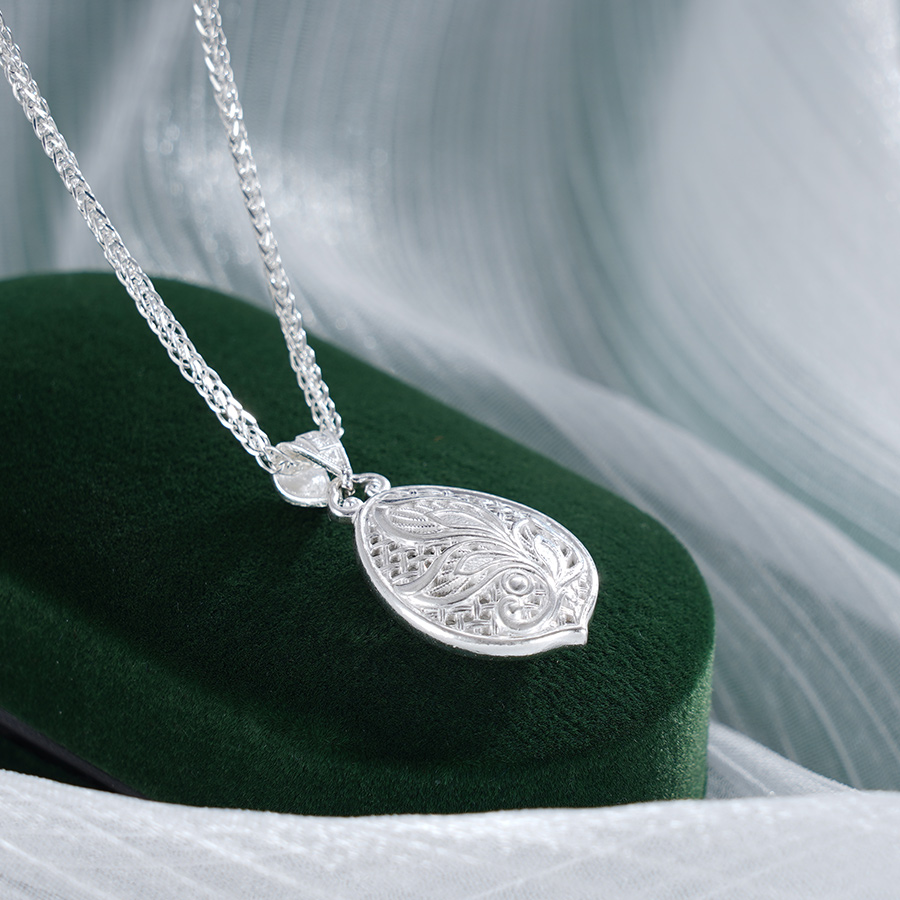 【寓意】:吊坠以树叶为灵感设计,采用银花丝工艺编织,通透干净,清雅动人,寓意学业(事业)有成。