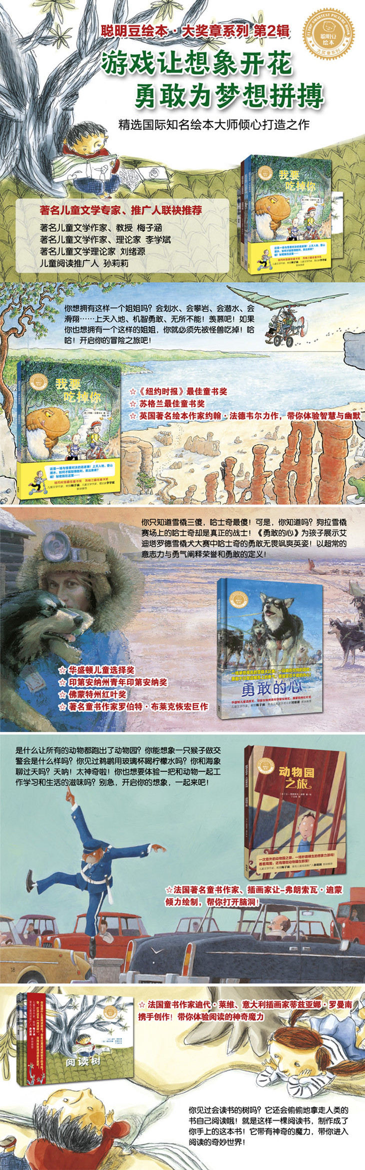 “大奖章绘本”汇聚了世界各地一流的作者、一流的故事、一流的图画……更重要的是,还汇聚了人类宝贵的创意与童心。“大奖章绘本”令我们震撼的,是大师们在进行绘本艺术创作时迸发的奇思、巧思,以及我们掩卷回味时在心底激荡着的感动、感悟。金波、梅子涵、朱自强等儿童文学专家为“大奖章”成员们撰写的一篇篇颇具启发意义的导读文字,也定会帮助小读者们在阅读与成长中收获到一枚枚沉甸甸、金灿灿的大奖章。