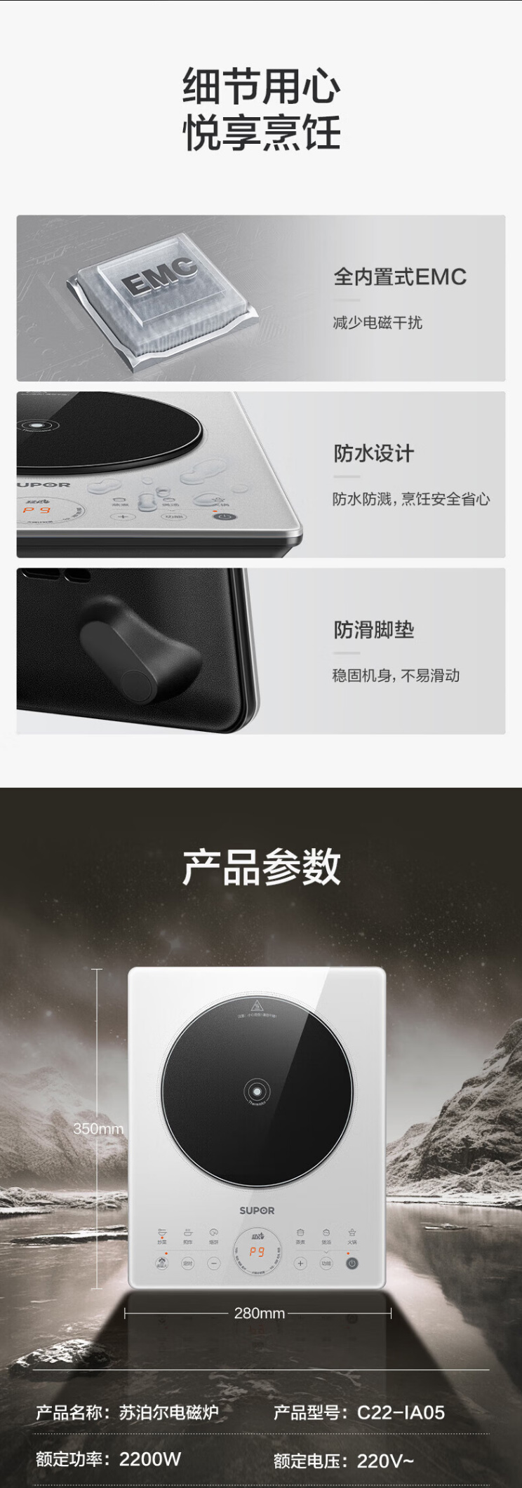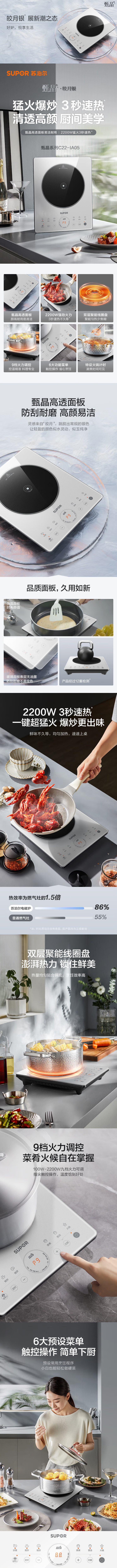 苏泊尔 电磁炉 C22-IA05 2200W 触控式操控 方形外观 一体面板 过热保护 三级能效 9档火力调节