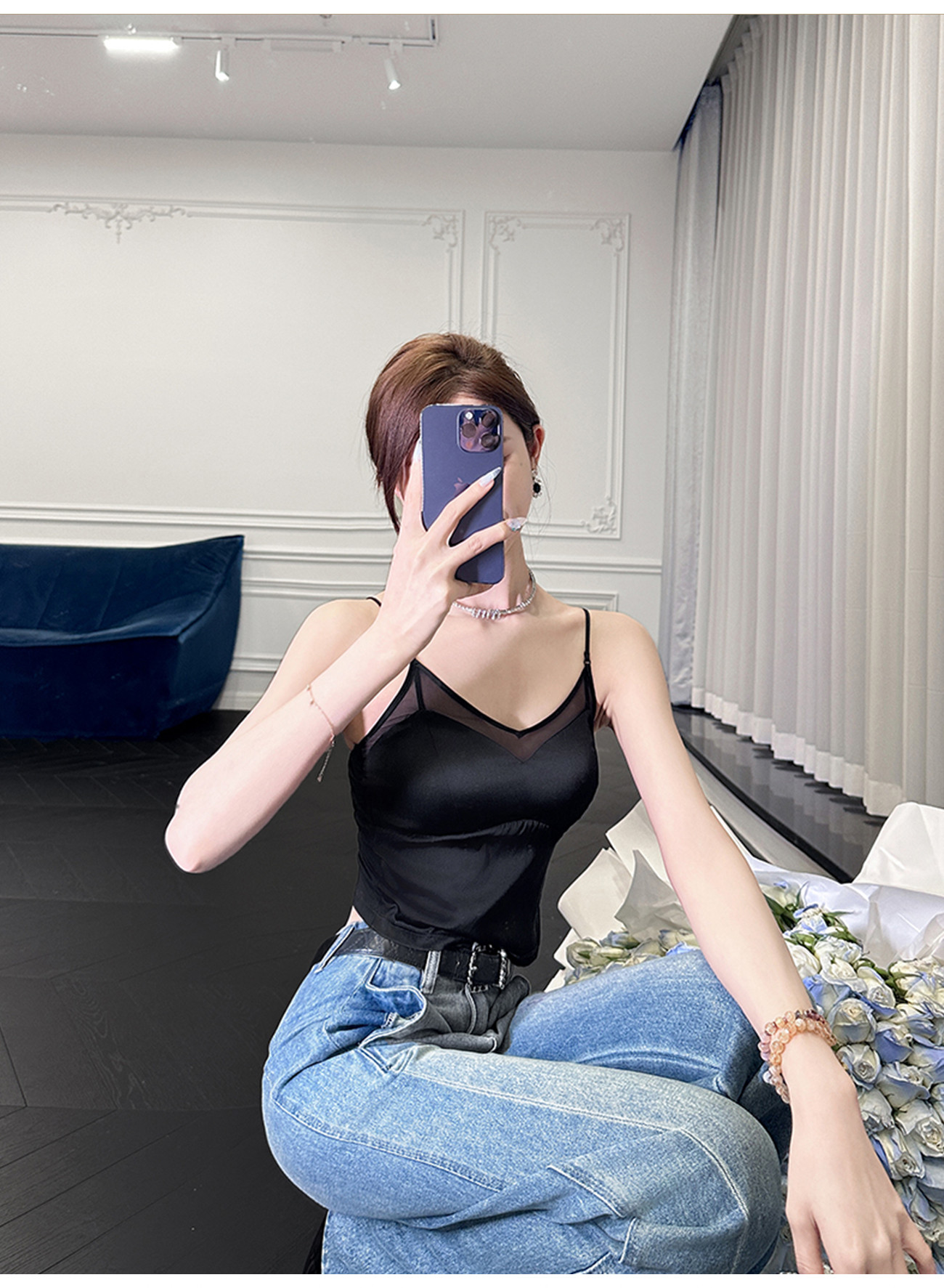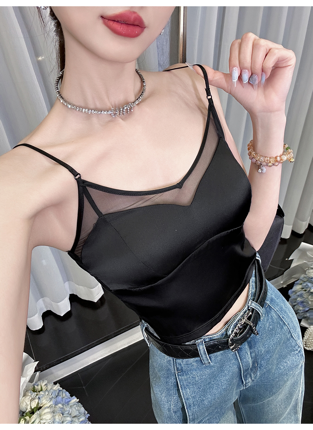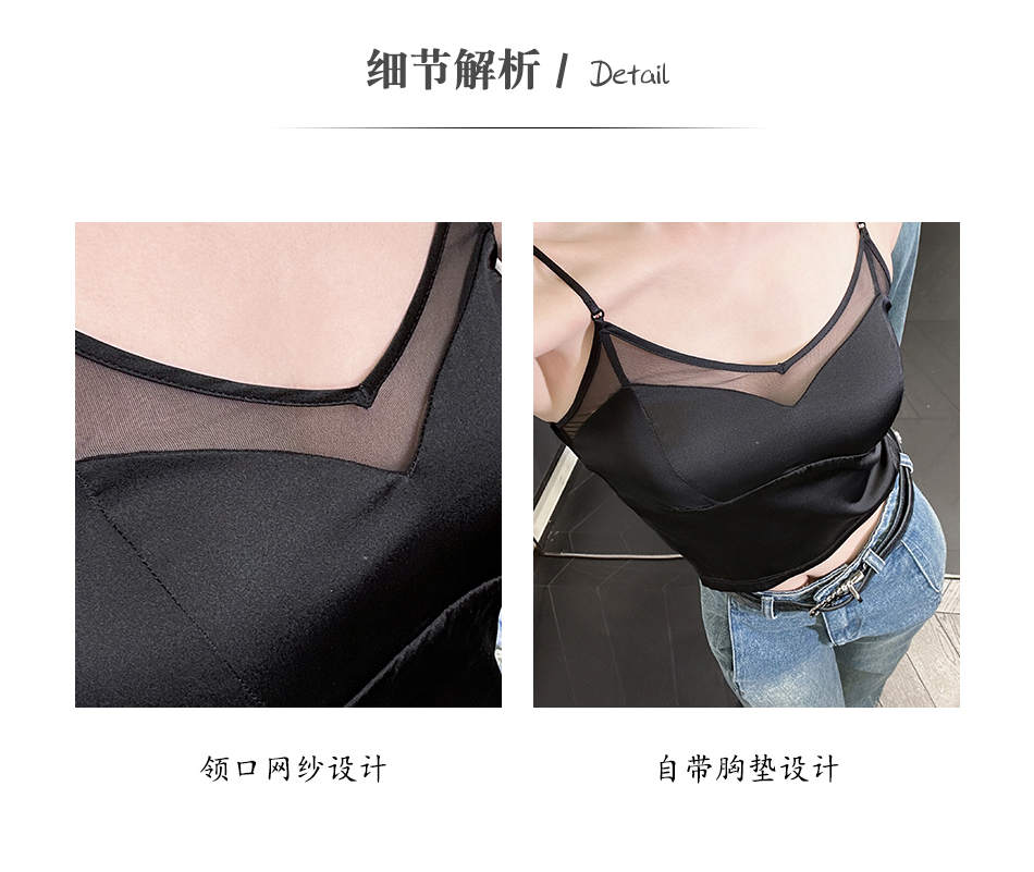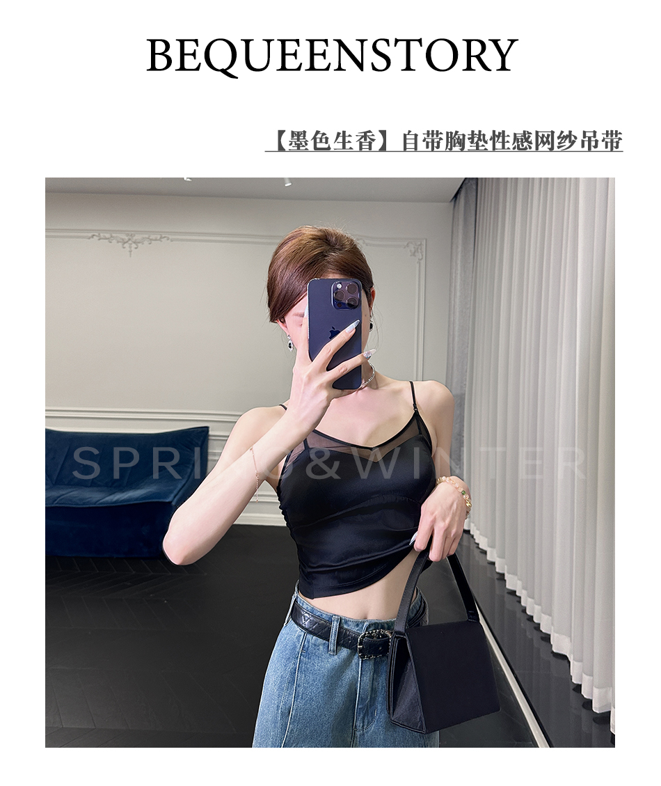 BeQueenStory【墨色生香】16姆米弹力真丝缎自带胸垫性感网纱吊带