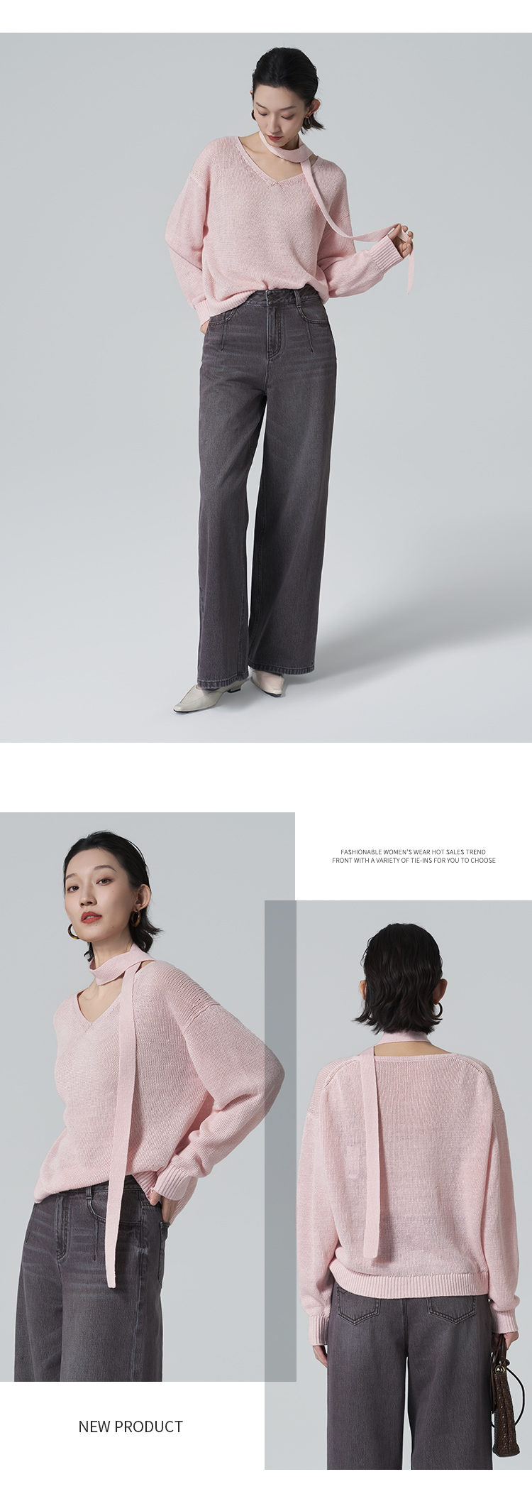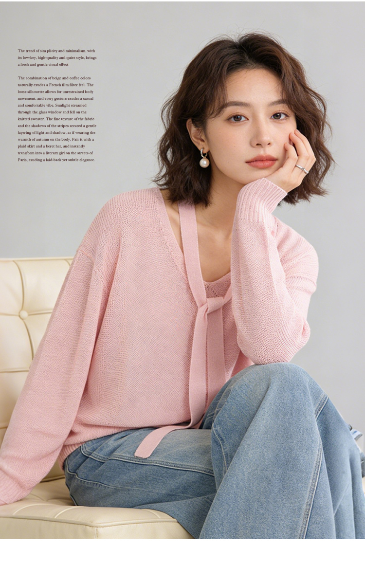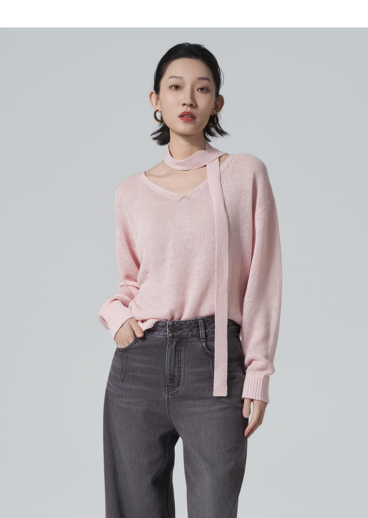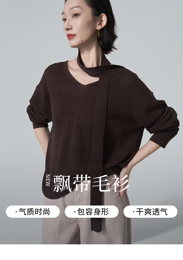 【商场同款】CNK6346 “ 飘带V领毛衫 ”天然亚麻材质 干爽舒适 宽松版型舒适自在