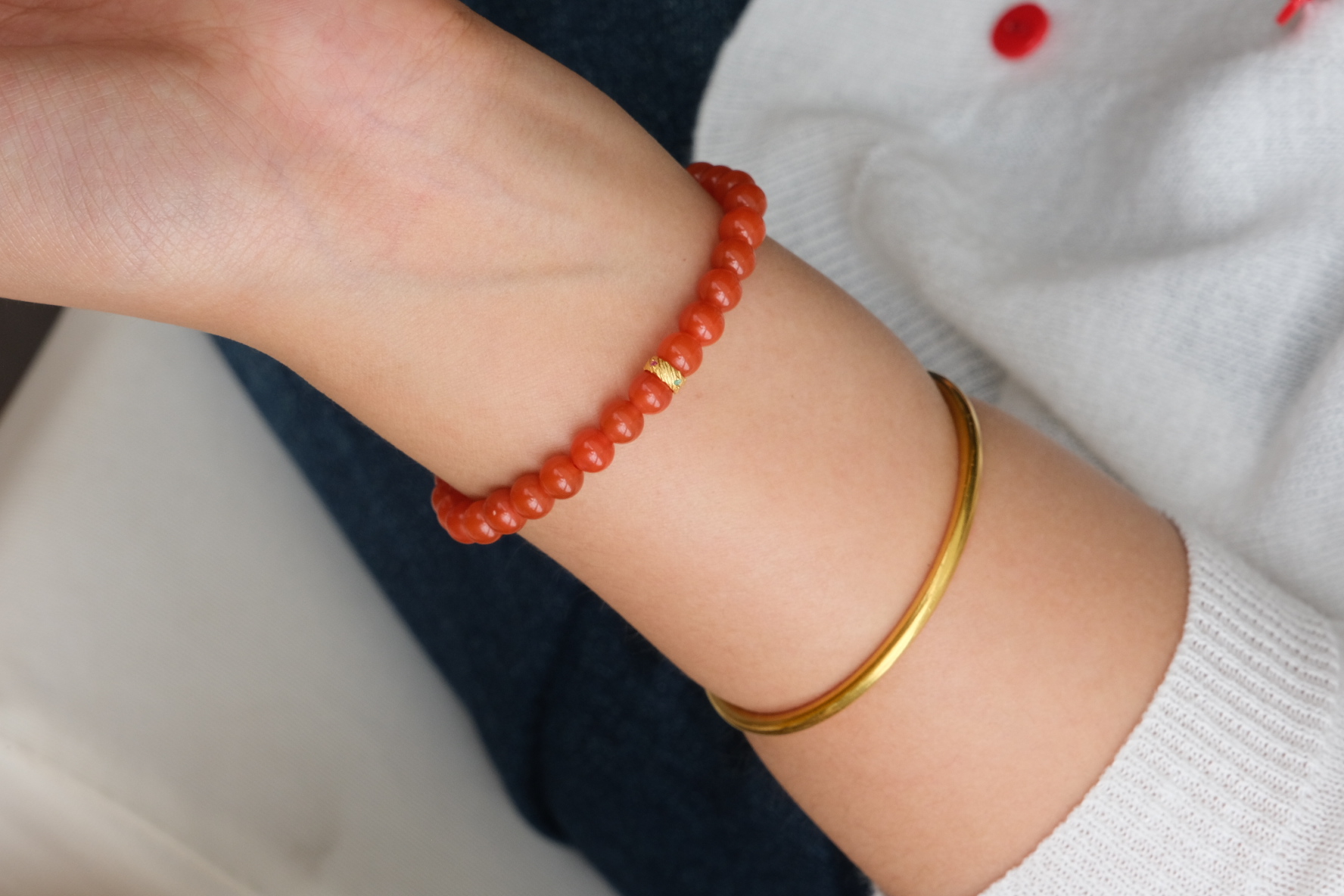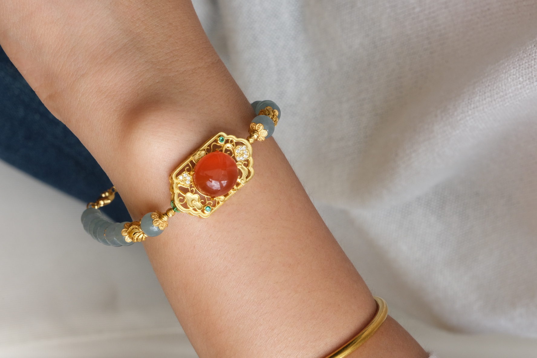 卖点:简约的单圈设计经典不过时,金色配饰虽小巧,但起到了画龙点睛的作用, 与南红的红色相互映衬,增添了一丝华贵感,提升了手串的整体档次。能轻松搭配各种风格的服饰,