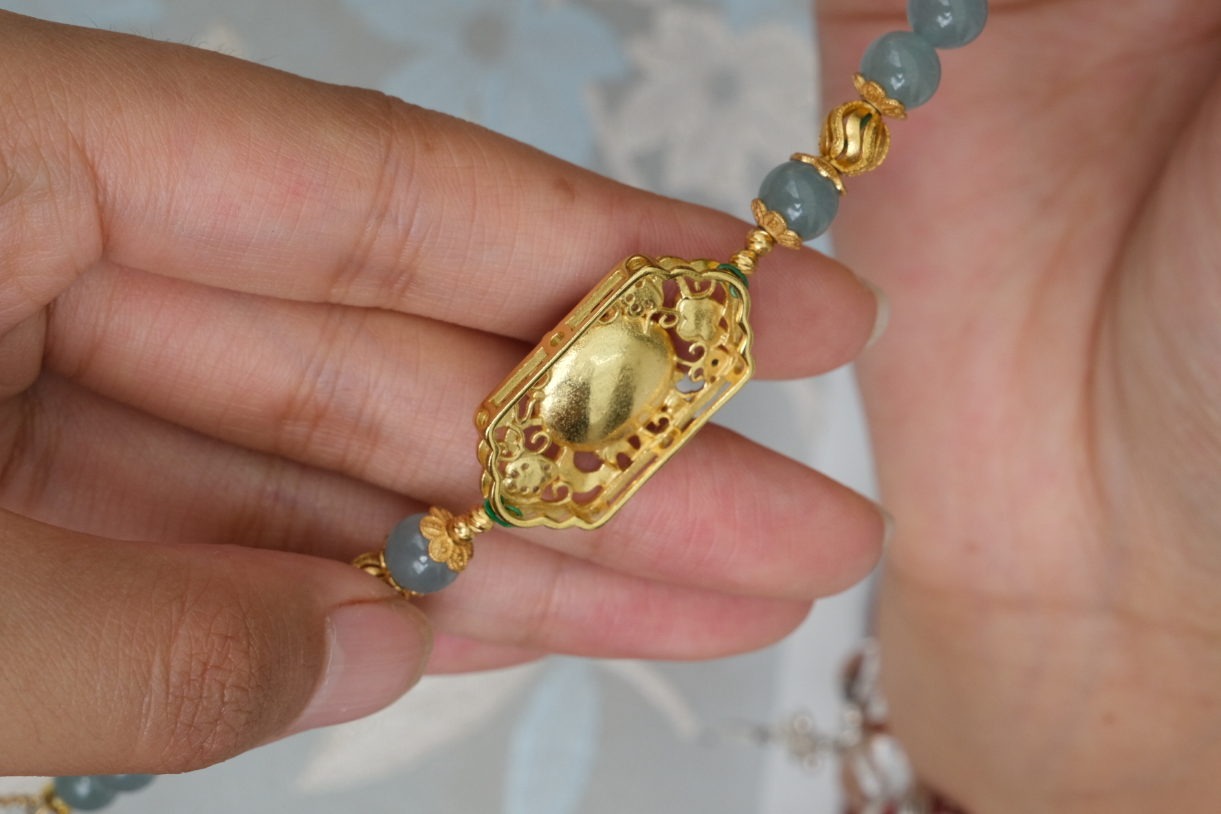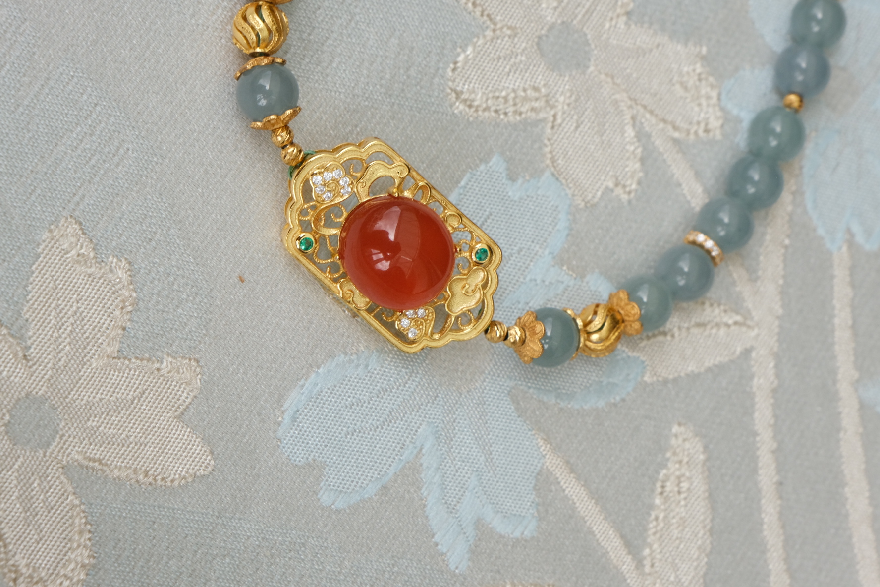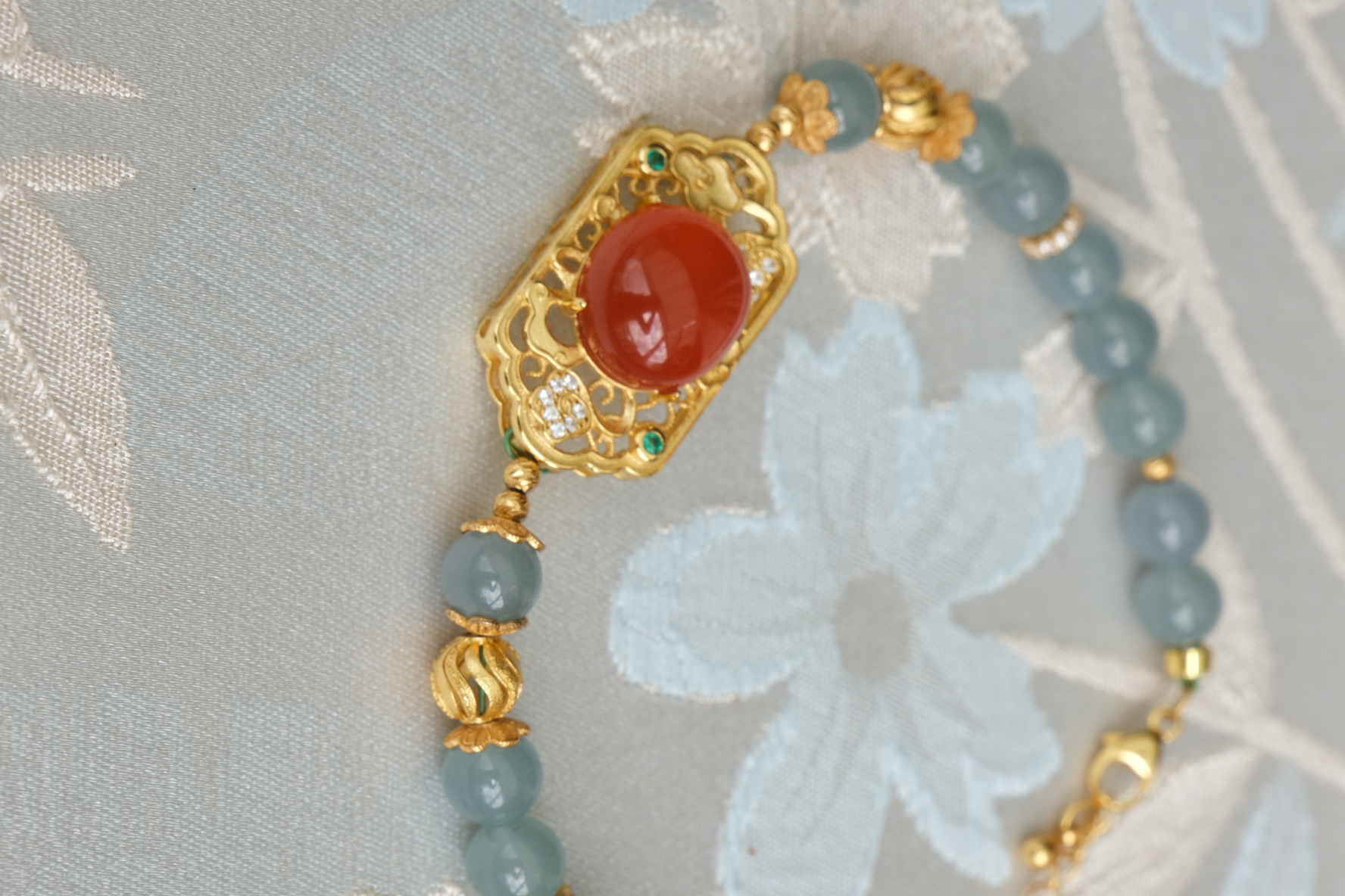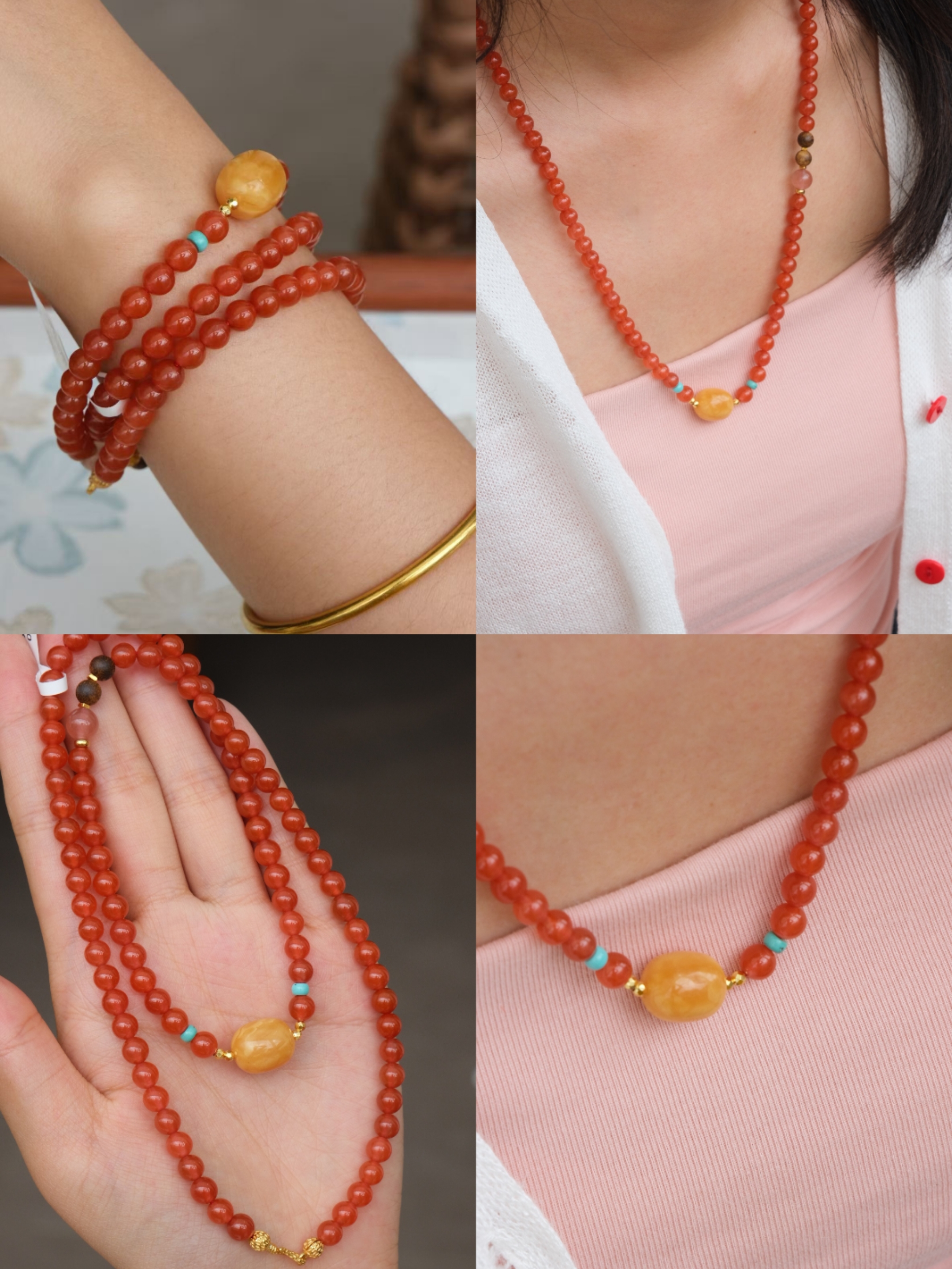 卖点:蜜蜡黄色与南红的红色相互映衬;绿松石点缀其中, 带来清新之感,丰富了珠串的色彩层次;金色配饰不仅提升了整体质感,还增添了华贵气息。