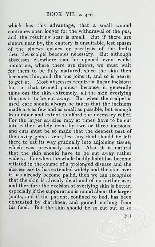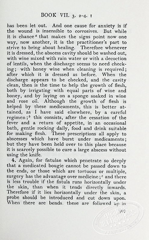 首册:在对希腊医学流派(教条式、方法式、经验式)进行了出色的研究之后,出现了合理的饮食学或健康保护,这一点永远适用。第二册涉及预后、症状诊断(他大力强调)和一般治疗学。第三册:内部疾病:发烧和一般疾病。第四册:局部身体疾病。接下来是两本药物学书籍,第五册:用药物治疗一般疾病;第六册:治疗局部疾病。第7和第8本书涉及外科手术;这些书包含许多手术的叙述,包括截肢。