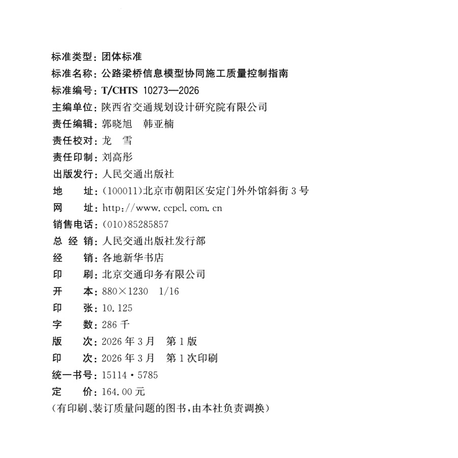 书名:公路梁桥信息模型协同施工质量控制指南(T/CHTS 10273—2026)