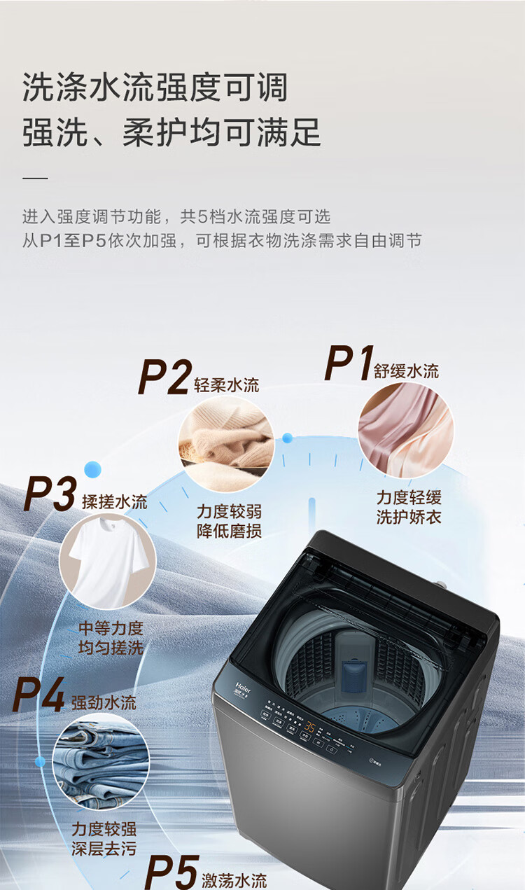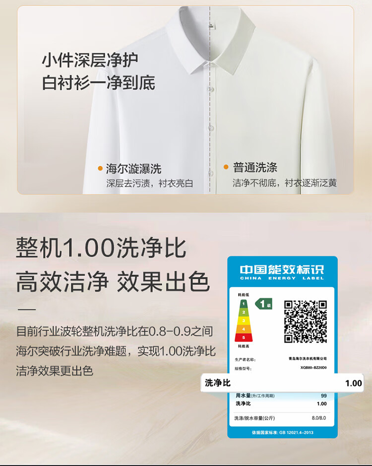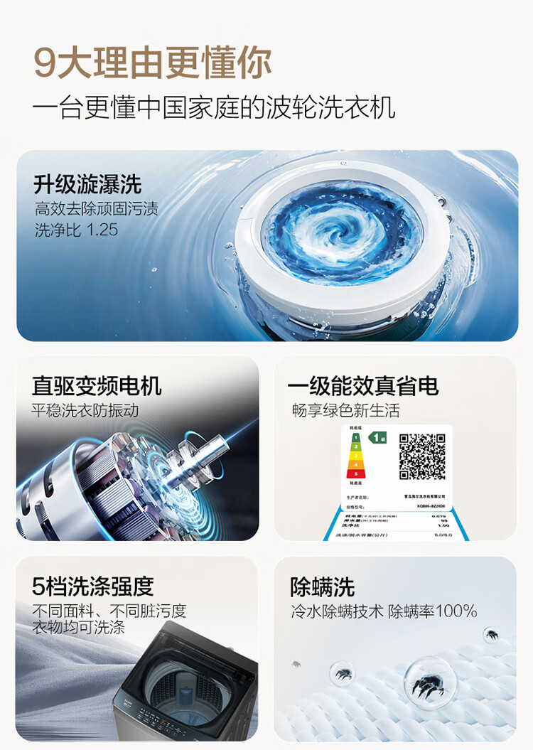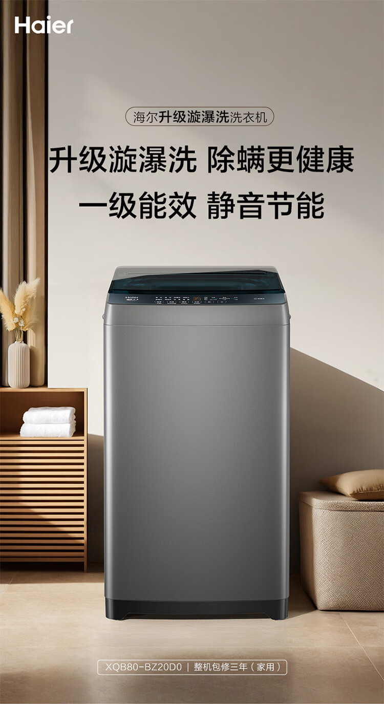 海尔8公斤全自动家用波轮洗衣机 直驱变频 一级能效 升级漩瀑洗 XQB80-BZ20D0 直驱变频+清新换风+一级能效