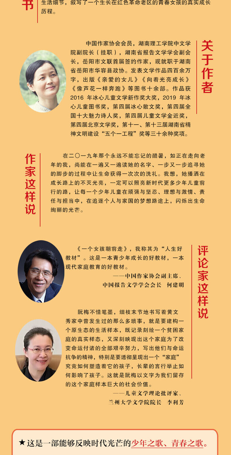本书聚焦“时代楷模”“全国优秀共产党员”黄文秀的少年时光,用纪实文学的创作手法记录这位用生命坚守初心和使命的青年共产党员的成长之路。通过深入实地采访,回避高大上式纪实文学写作方式,突出地域特色、人文环境和家庭成长背景,以细腻、温润、诗意、思想的文字,细密、动人的生活细节,叙写了一个生长在红色革命老区的青春女孩的真实成长历程。黄文秀的成长经历,也从一个侧面反映了中国农村发展的历史进程。长期以来国家的扶贫政策,在受益的少年儿童心中开出硕美的花朵。深怀饮水思源感恩之心的黄文秀,抱着“我就是要回来的人”,以好看的青春时光,反哺了她热爱的这片土地。她是少年标杆、青春楷模,她的精神和事迹,必定对当下青少年的价值观塑造、爱国敬业精神的传递产生重要的价值意义。