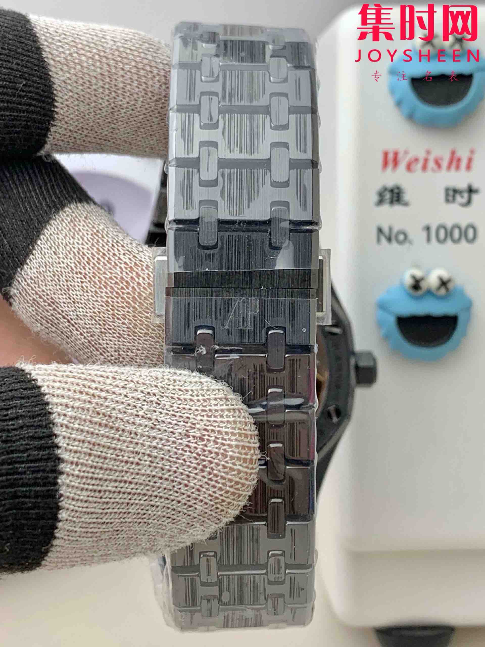 一体式结构:表壳与表带无缝衔接,延续皇家橡树标志性八角形表圈和“Tapisserie”格纹表盘,陶瓷材质赋予现代感。