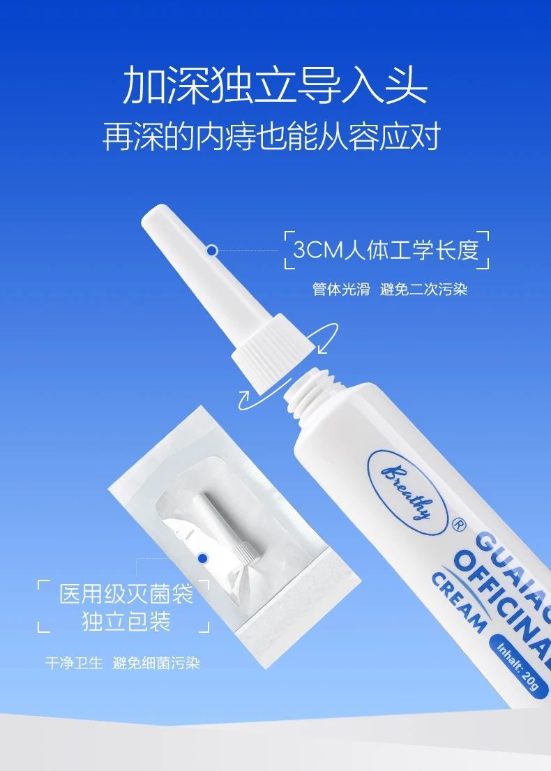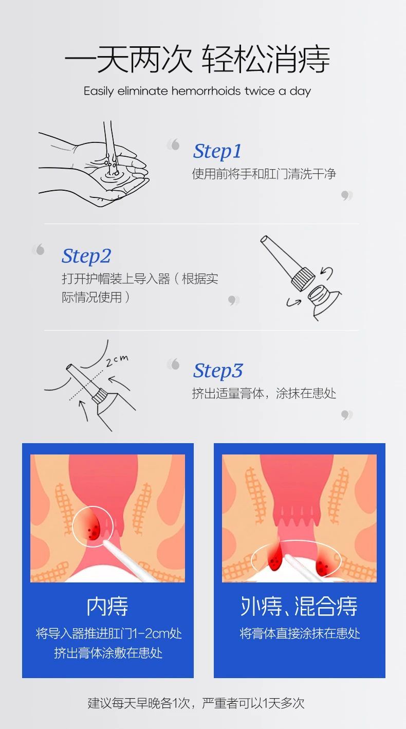 👉内痔:将导入器推进肛门1-2cm处,挤出膏体涂敷在患处