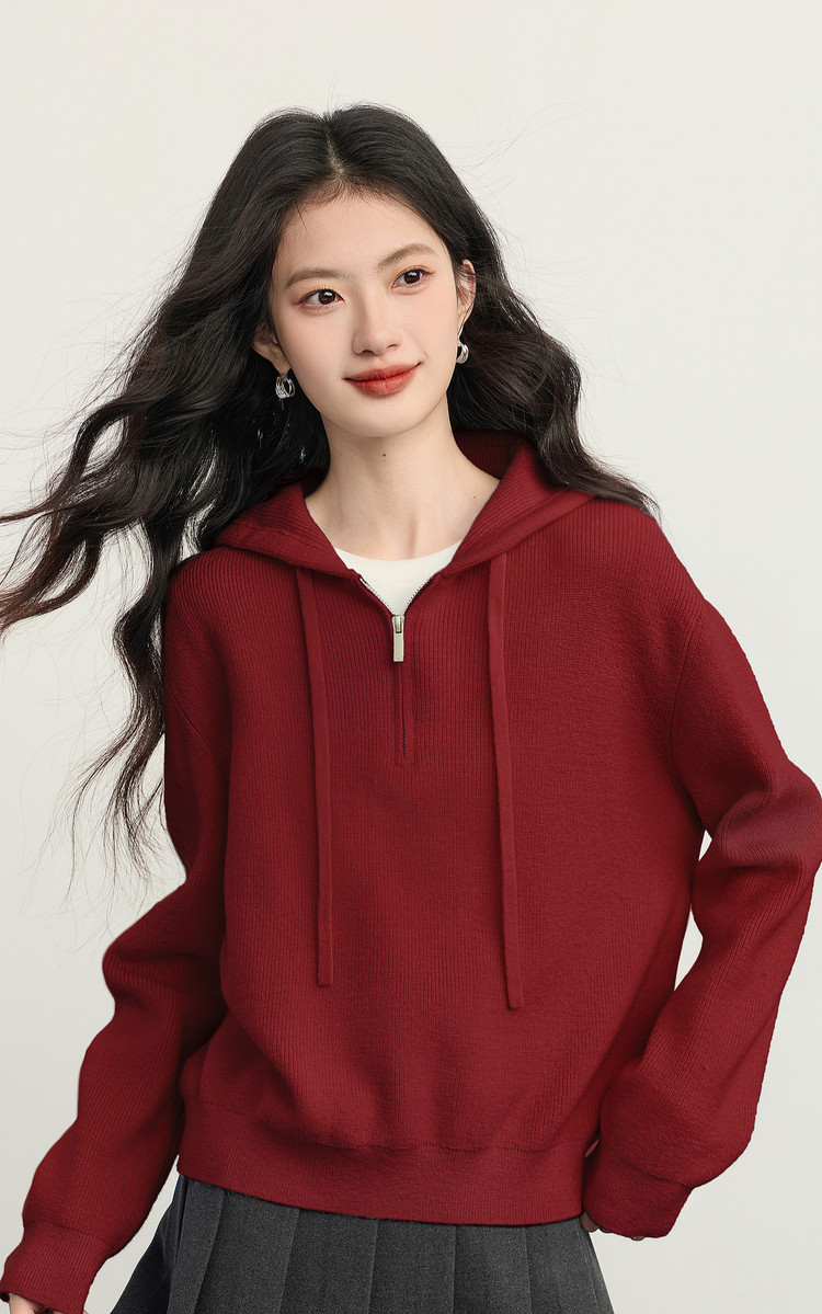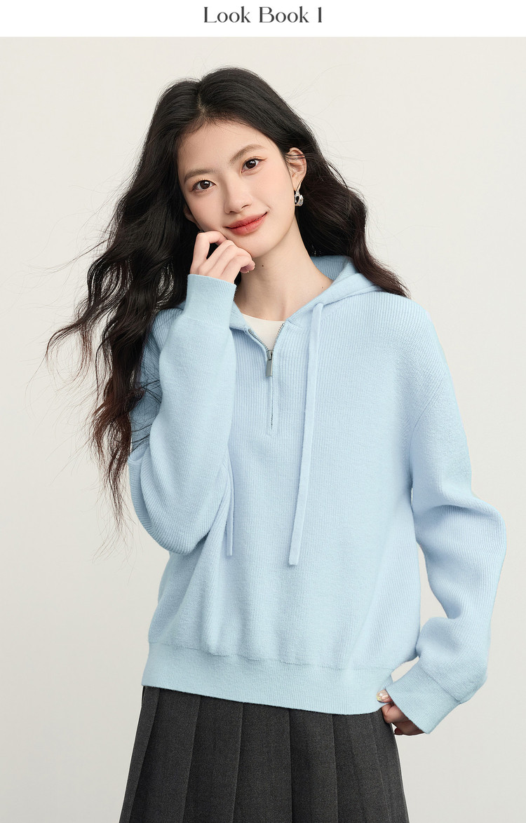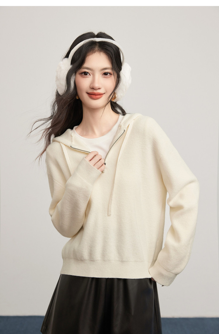 【12/31新品】熙世界北极绒抽绳连帽毛衣女秋冬纯色设计感宽松长袖套头针织上衣
