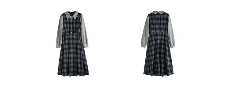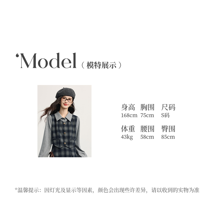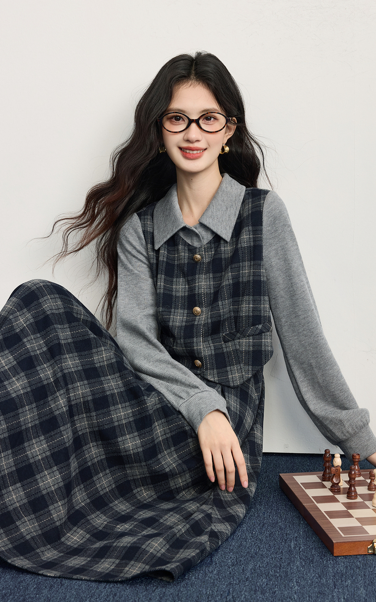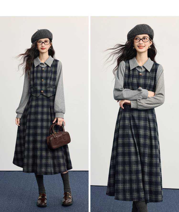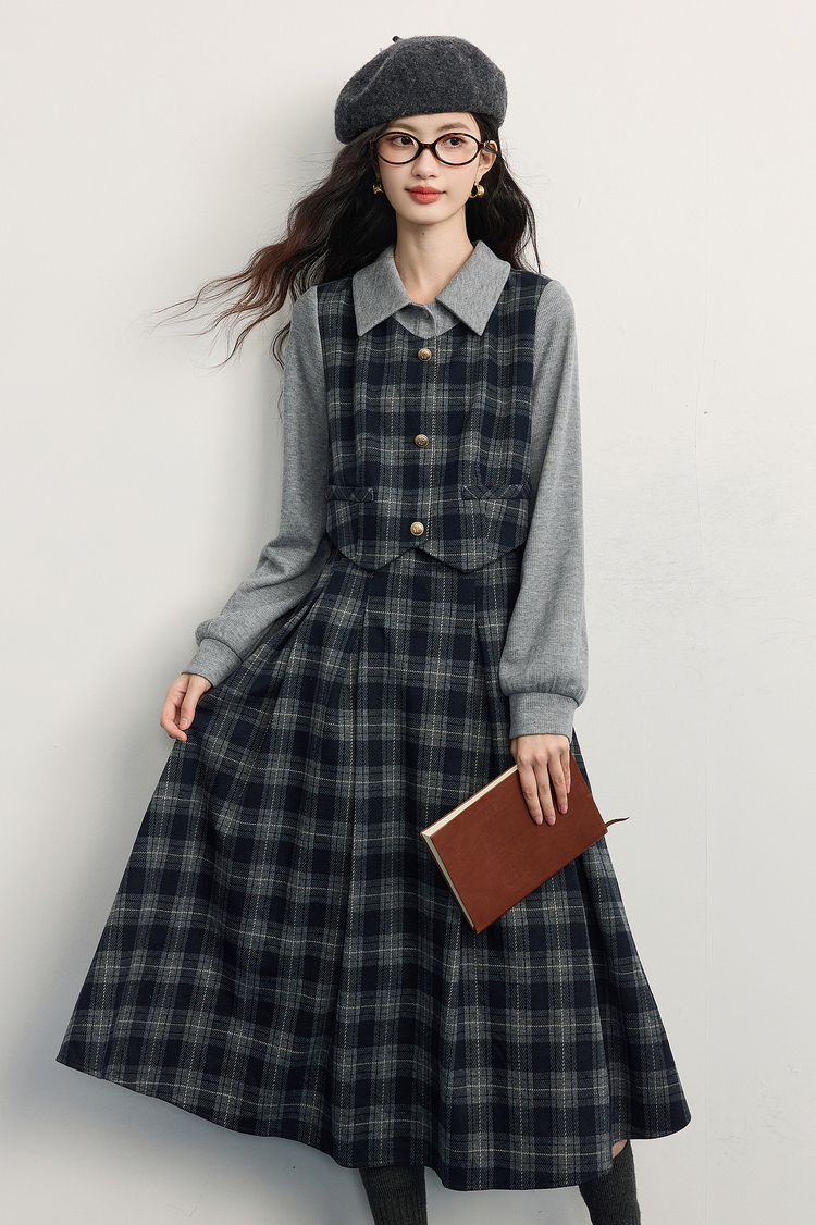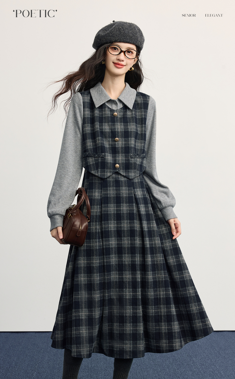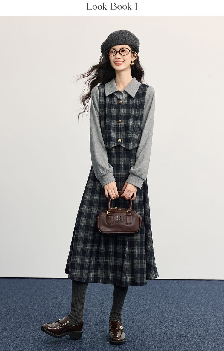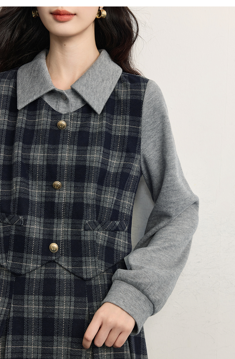 【11/5新品】熙世界复古知识分子风针织拼接格纹毛呢假两件连衣裙女2025秋冬季