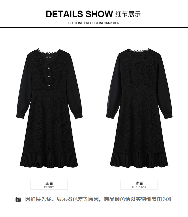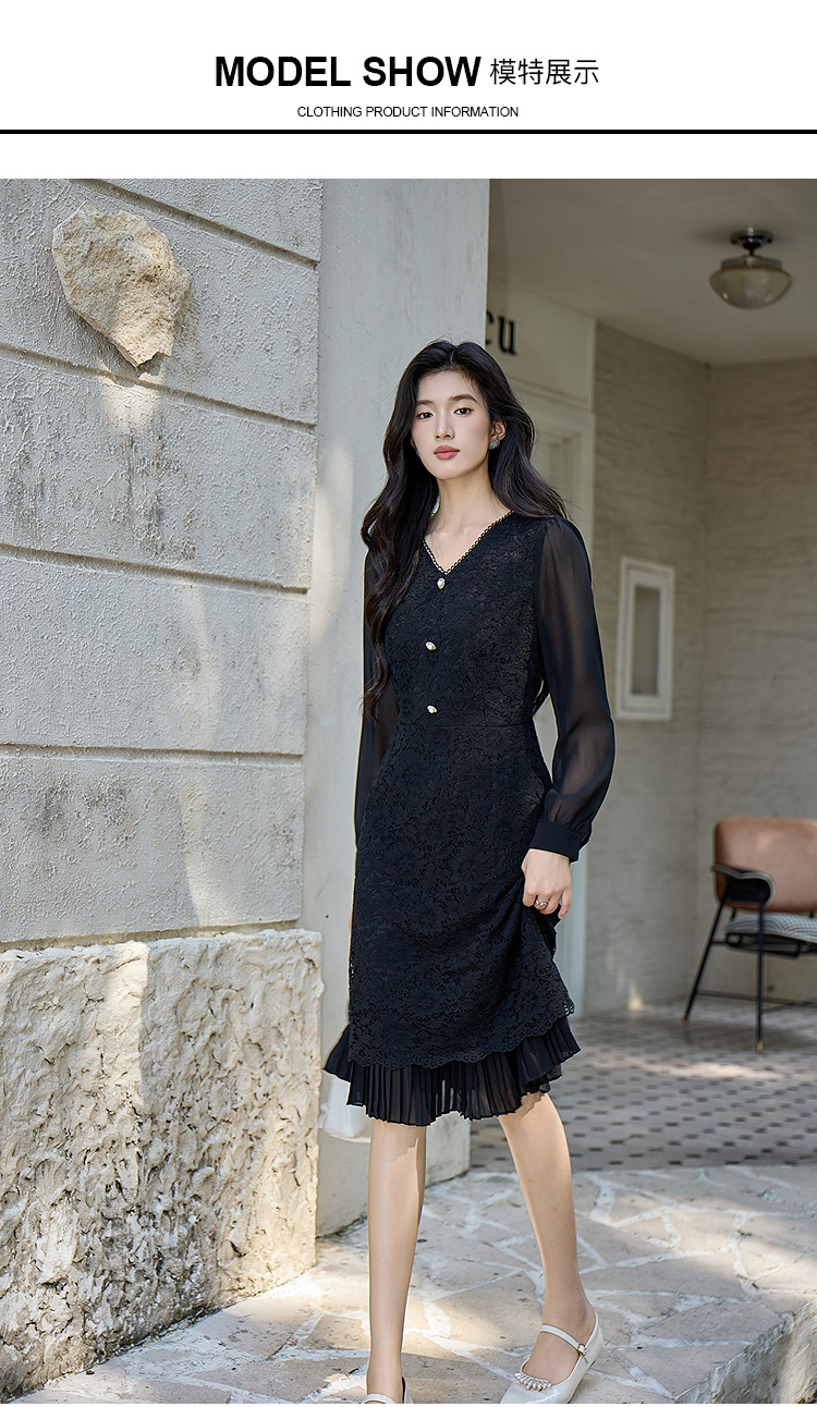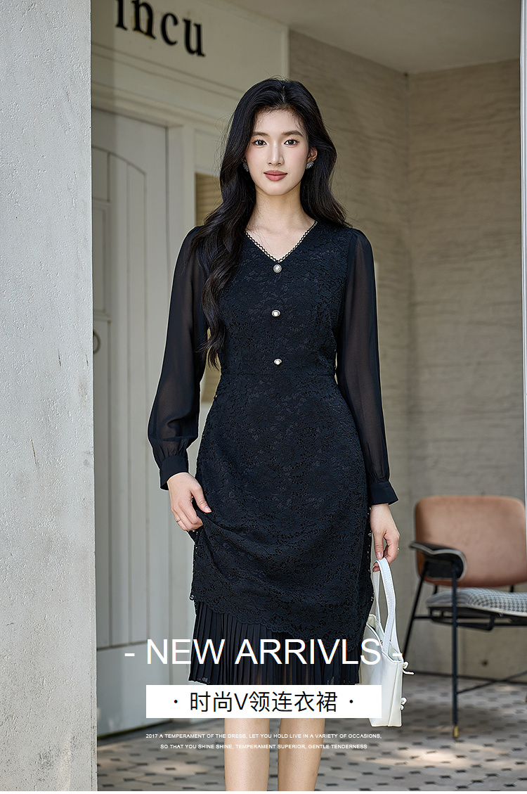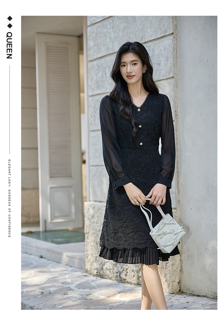 奢姿大码女装2025秋季时尚蕾丝花边百褶连衣裙胖妹妹气质V领裙子9953853362