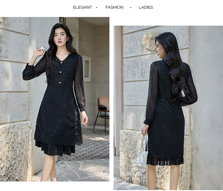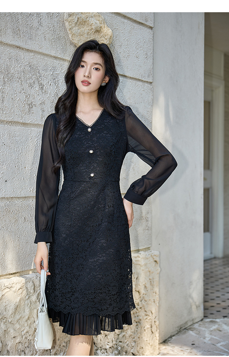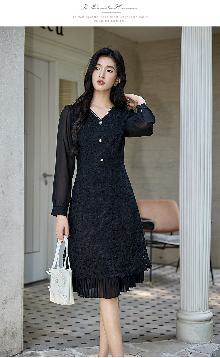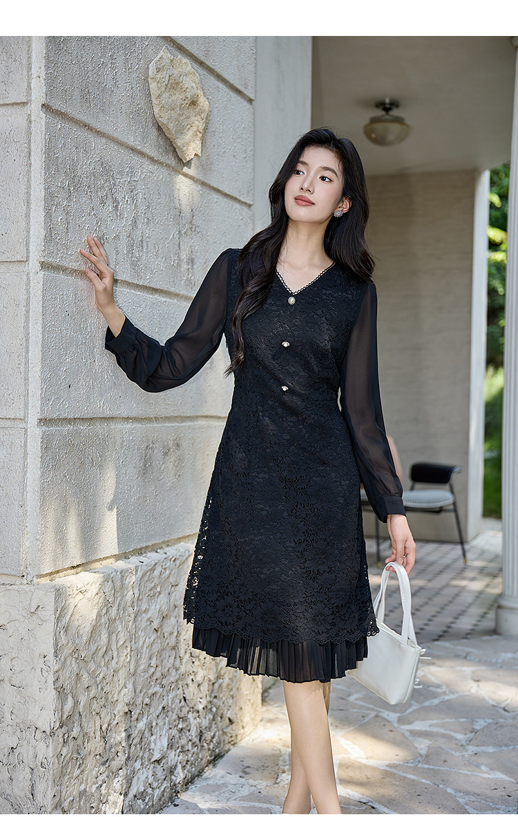 奢姿大码女装2025秋季时尚蕾丝花边百褶连衣裙胖妹妹气质V领裙子9953853362