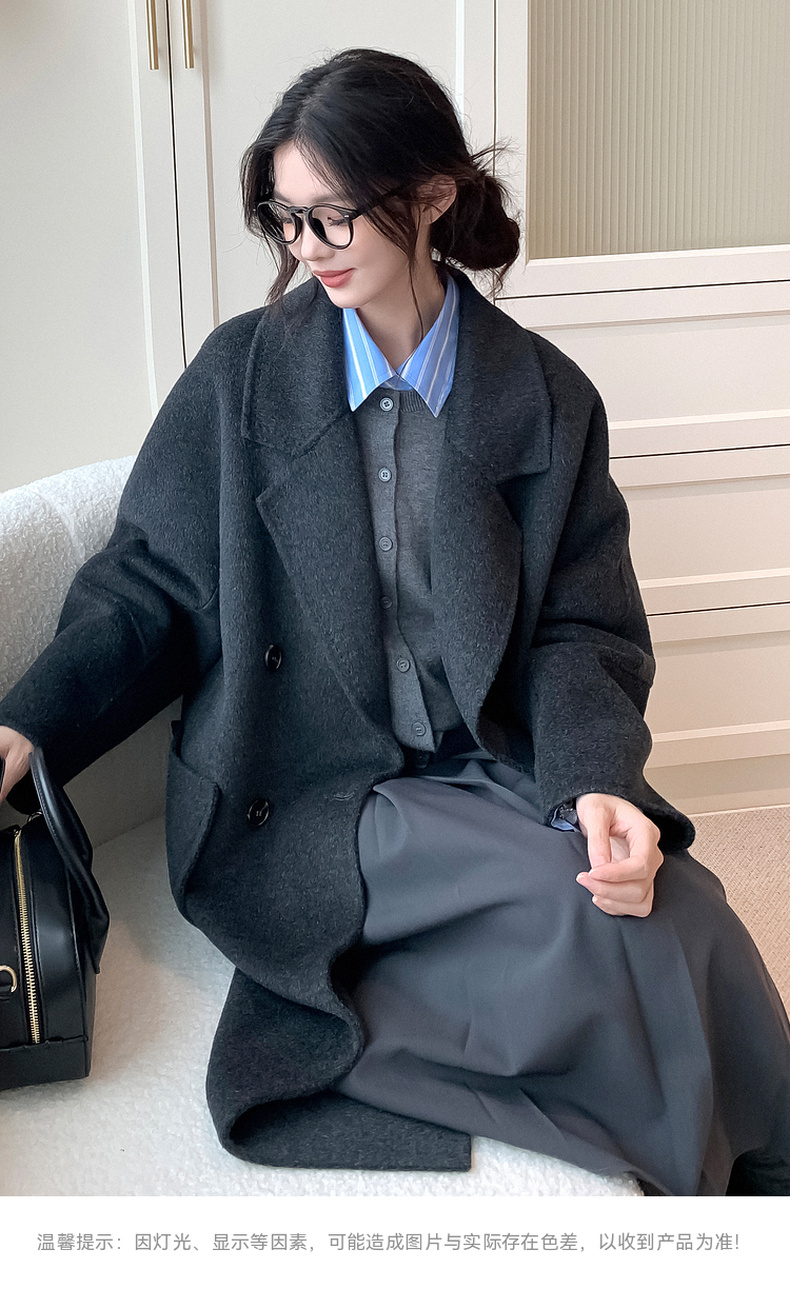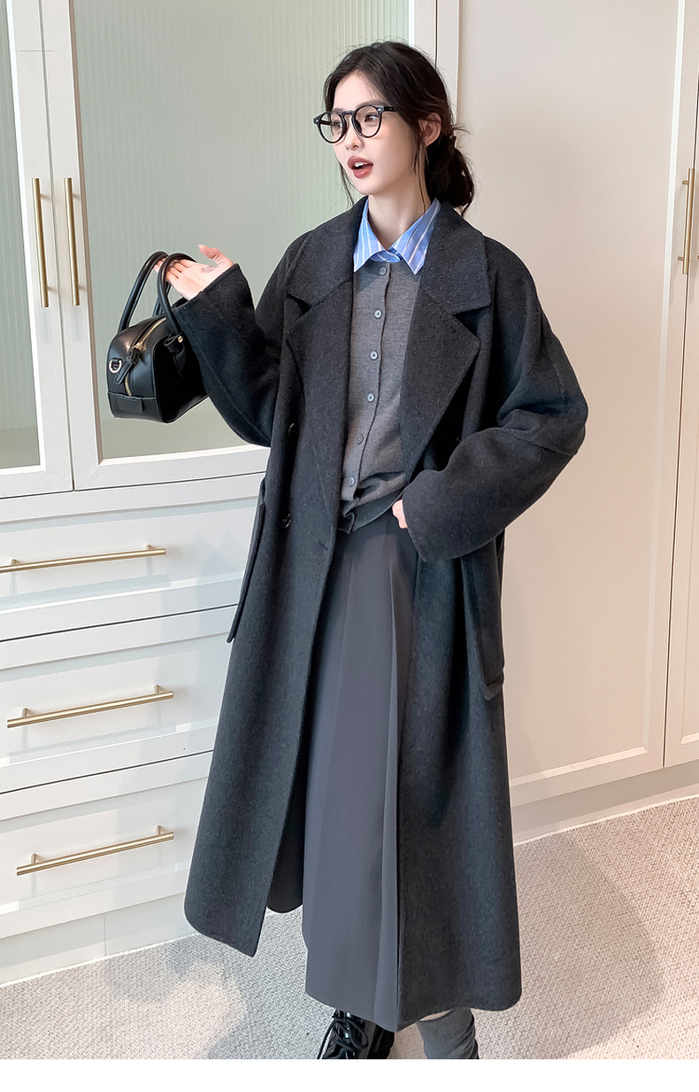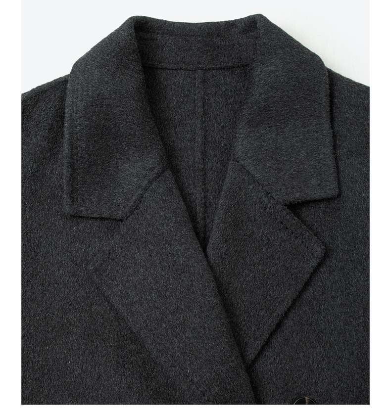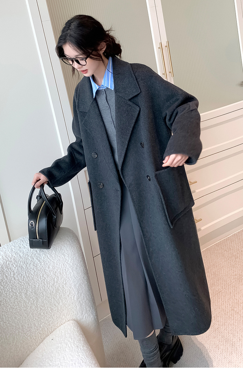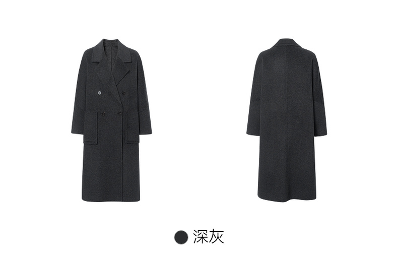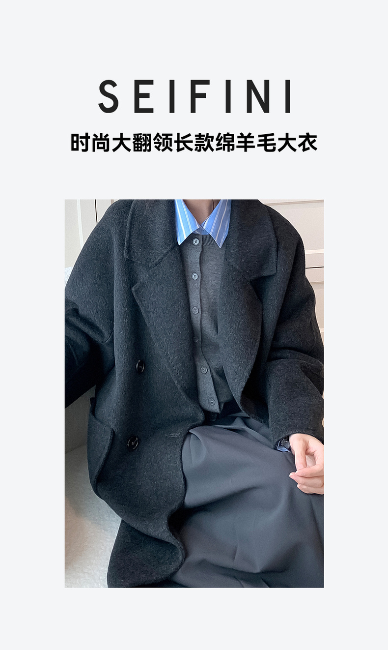 【严选】诗凡黎灰色绵羊毛翻领毛呢外套2024冬新款优雅双面呢高级长款大衣SF7170111D