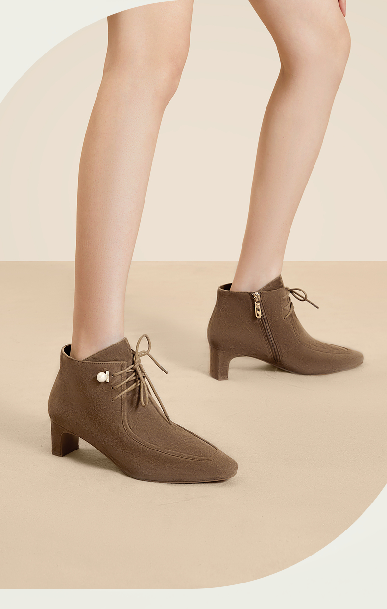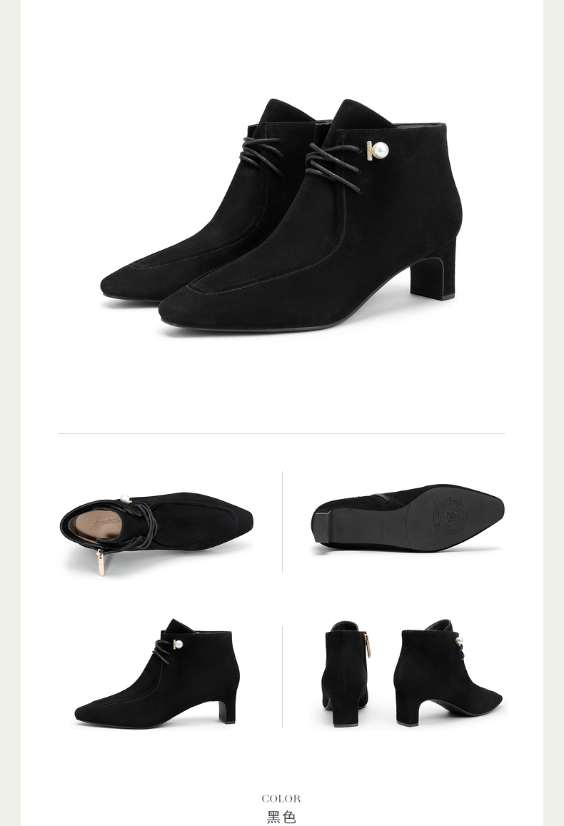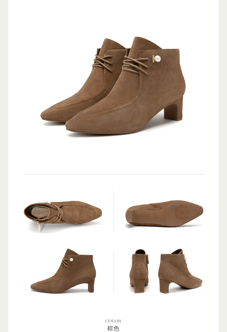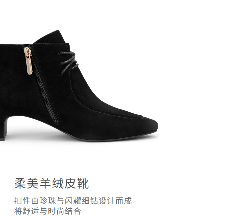 natursun羊绒短靴秋冬季绒面粗跟时尚气质方头绑带时装靴N24506207