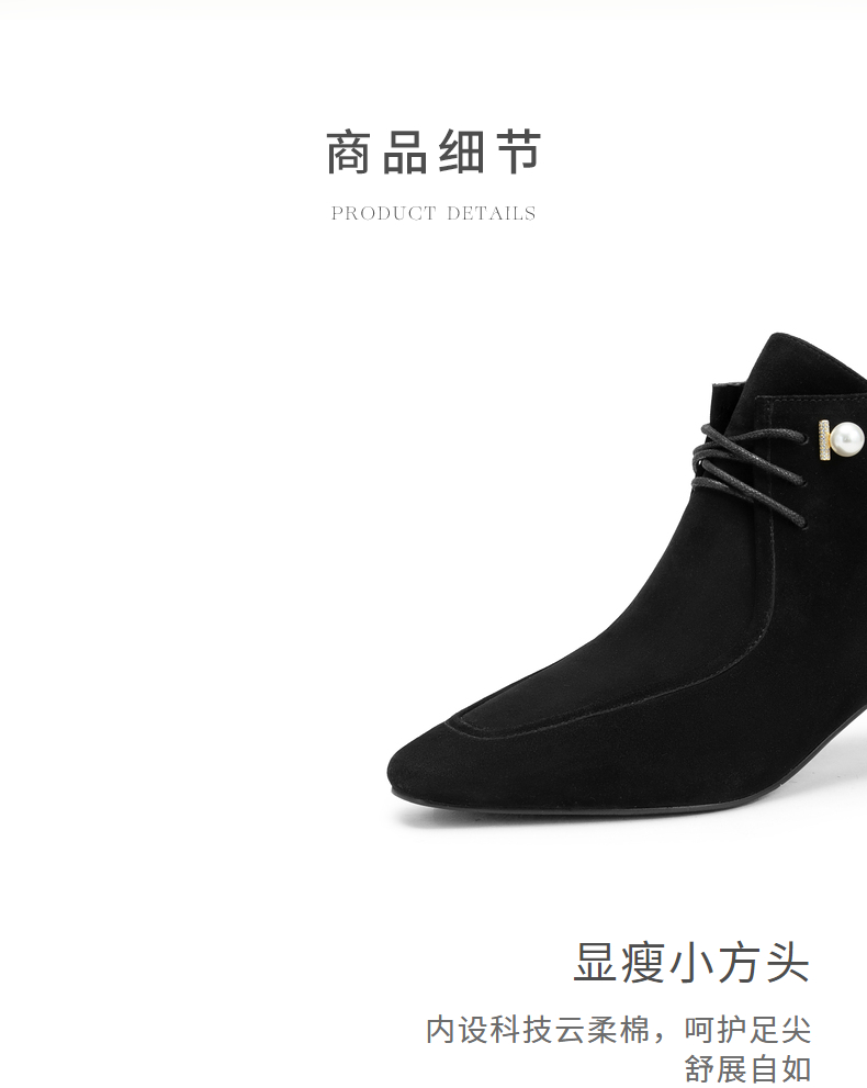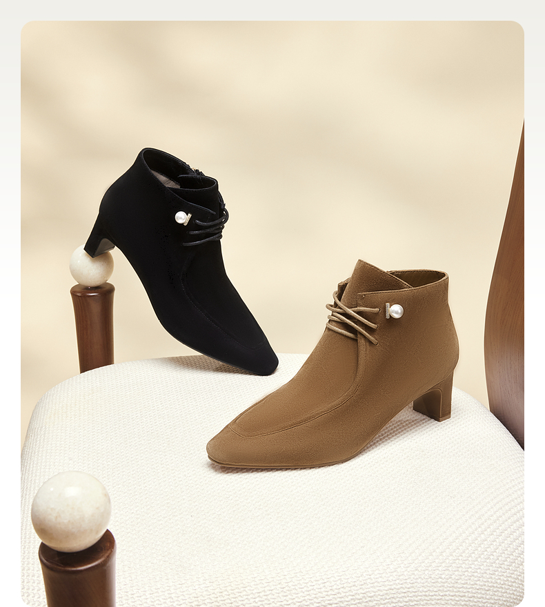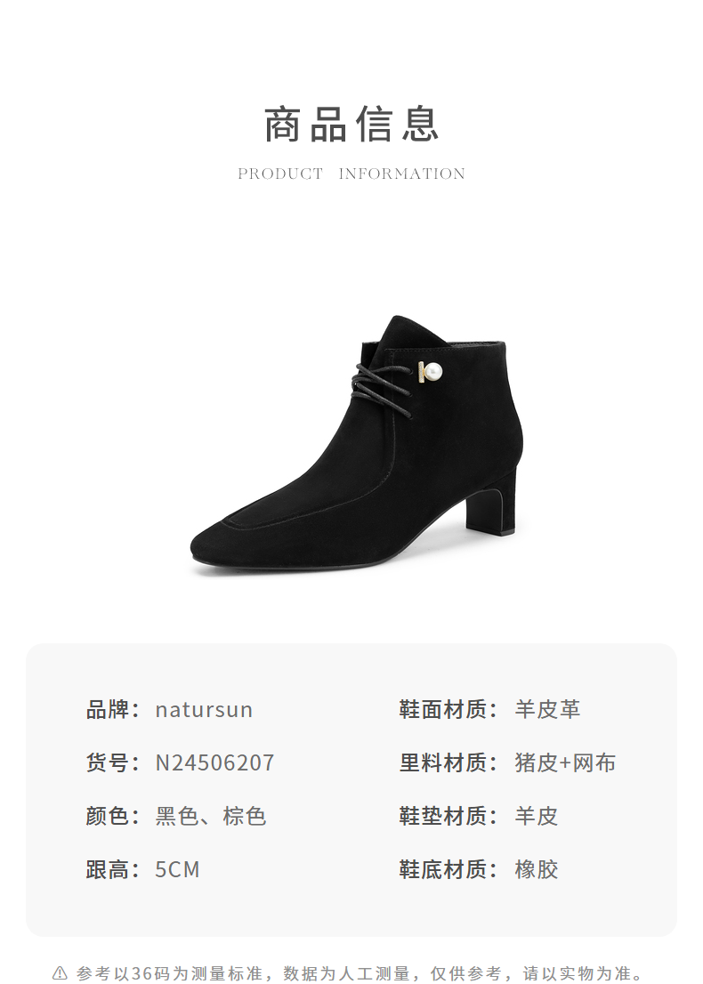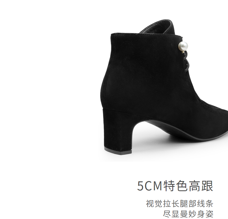 natursun羊绒短靴秋冬季绒面粗跟时尚气质方头绑带时装靴N24506207