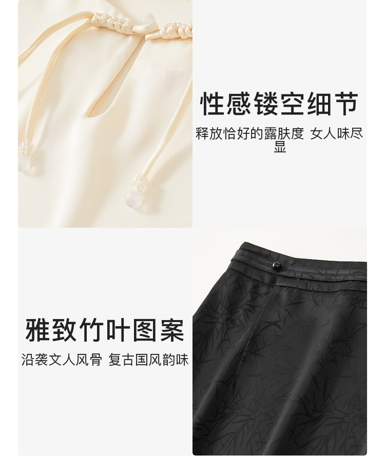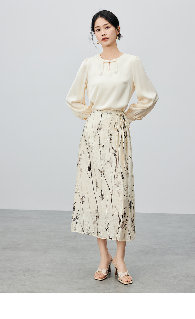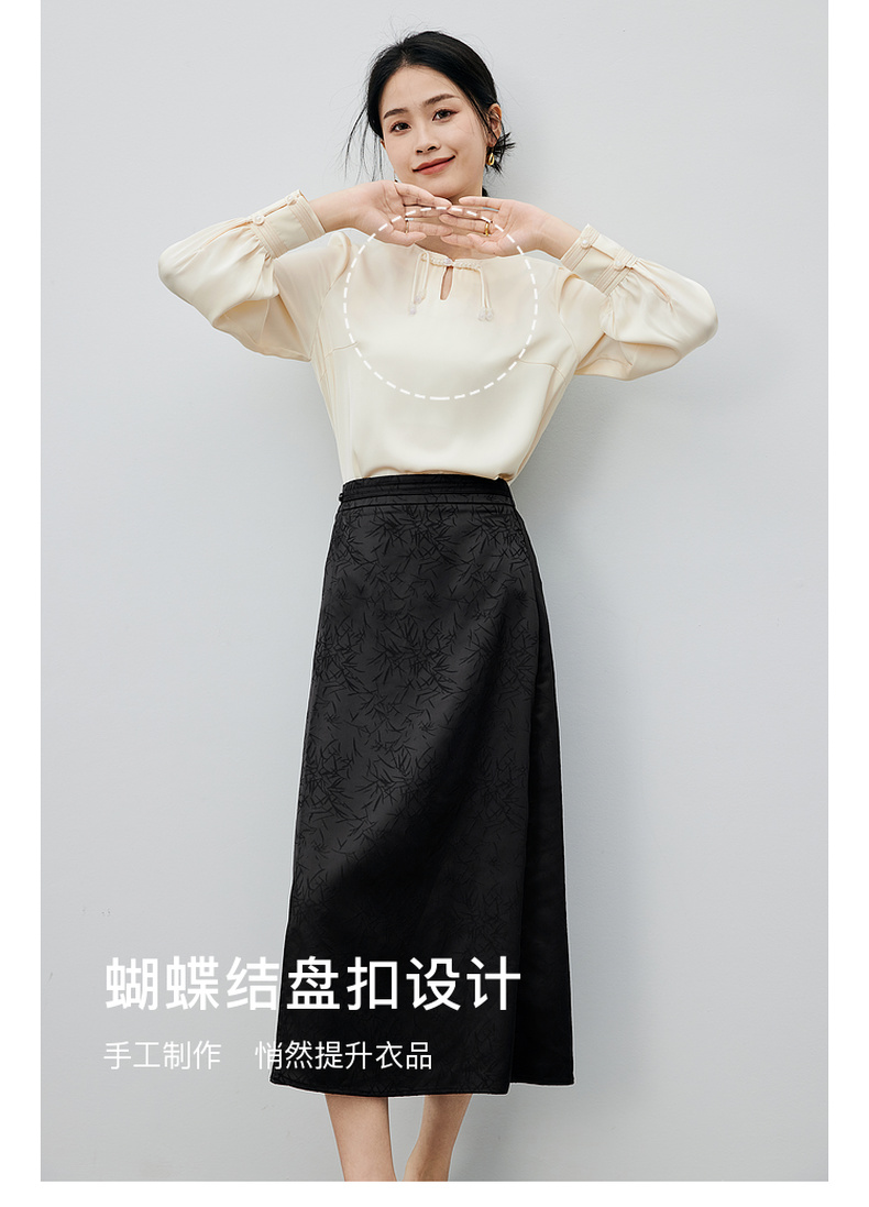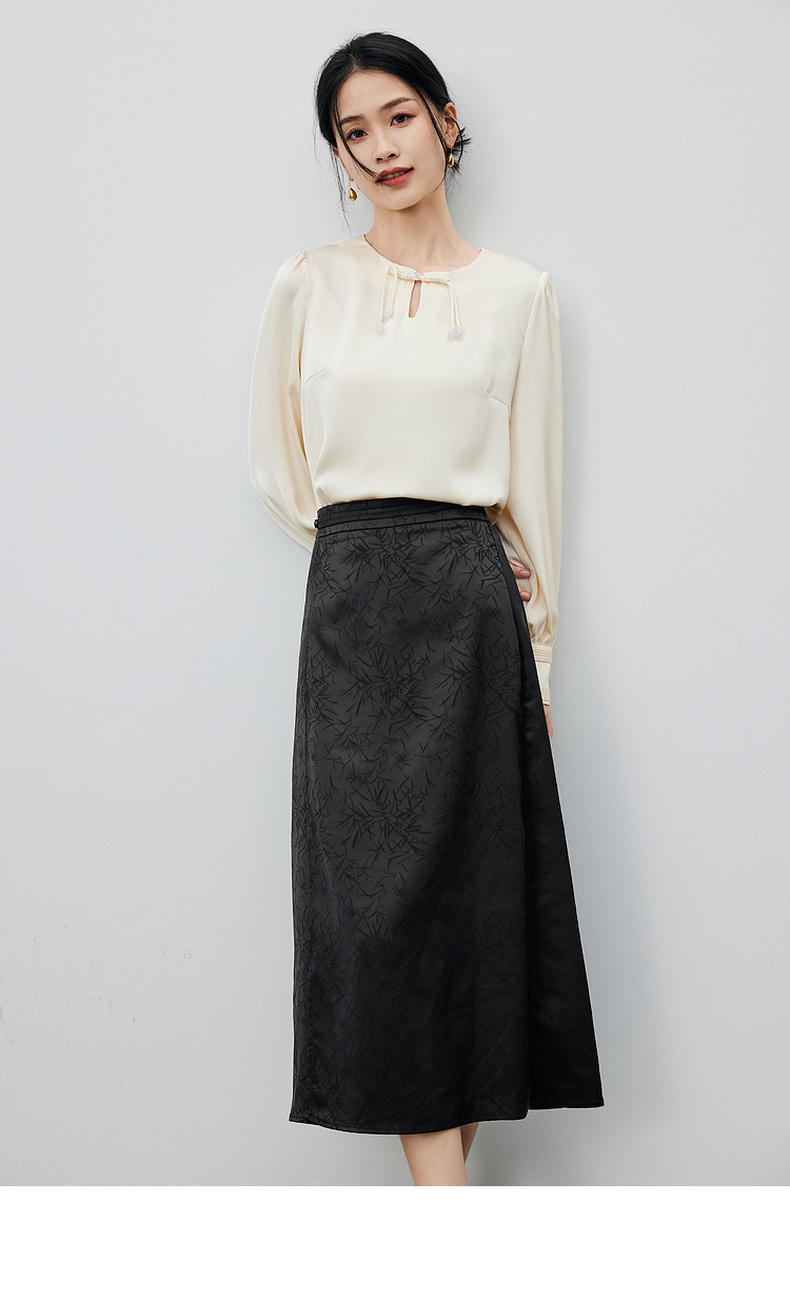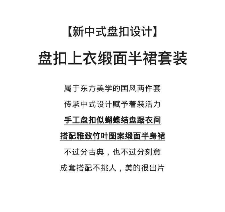 尚都比拉复古优雅小众盘扣上衣光泽感缎面竹叶印花半身裙套装-141Z52987