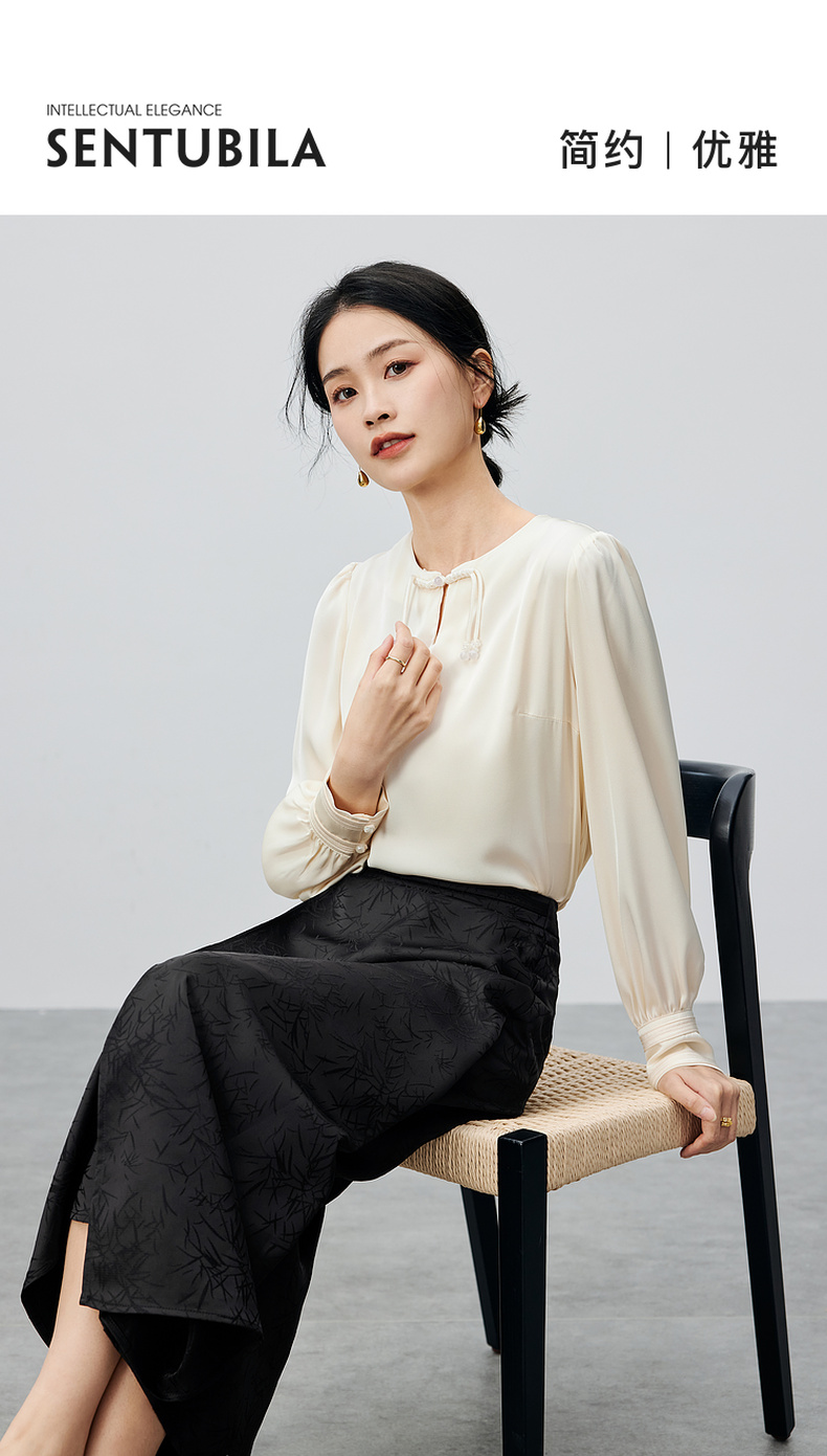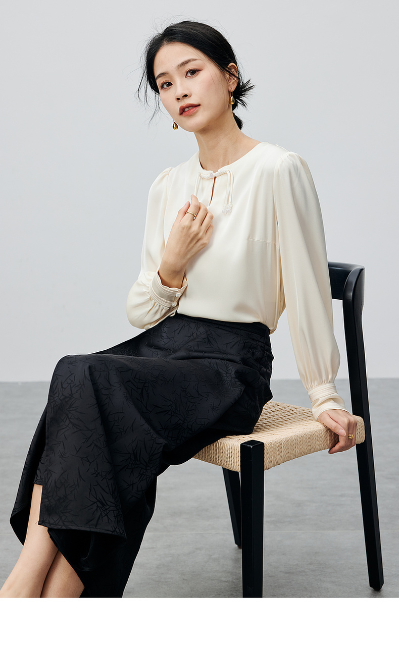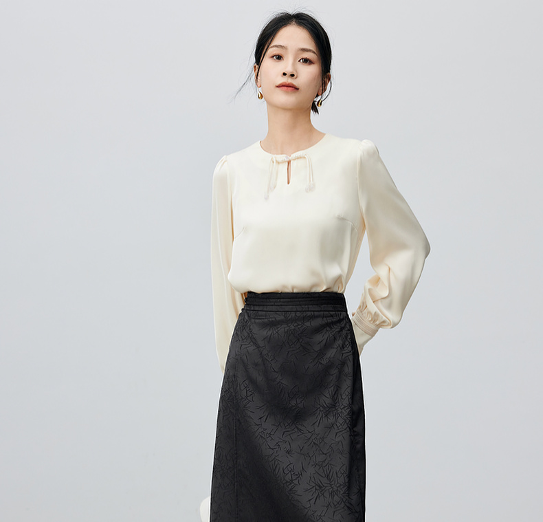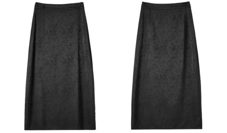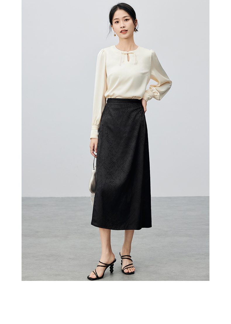 尚都比拉复古优雅小众盘扣上衣光泽感缎面竹叶印花半身裙套装-141Z52987