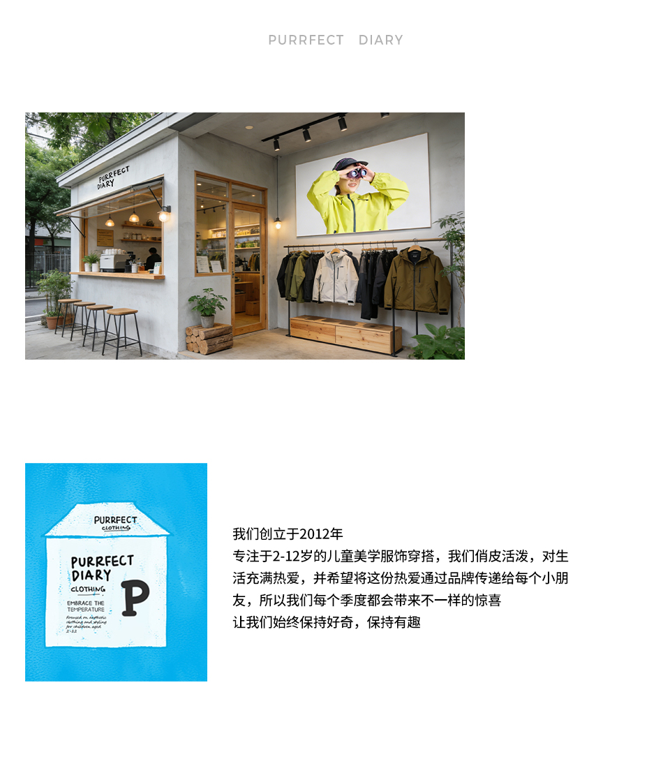 Purrfect-Diary专注于贴近自然随性的穿着概念,轻奢平价的童装文化传播,在产品设计上更加注重婴童穿着的舒适性、安全性、更出众的国际化品牌,将欧美的育婴文化在中国进行深入的传播与推广。