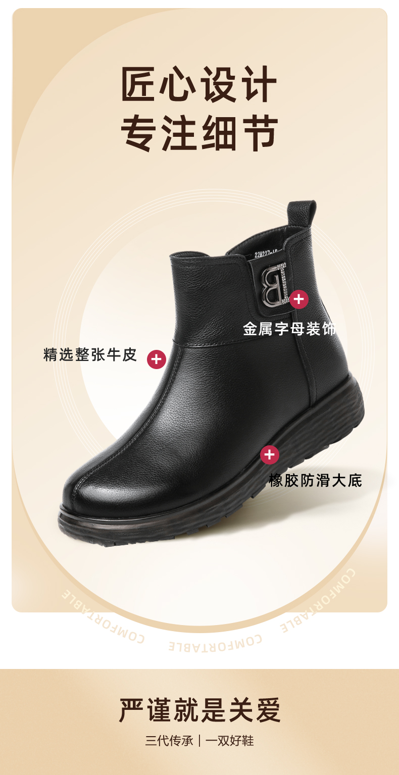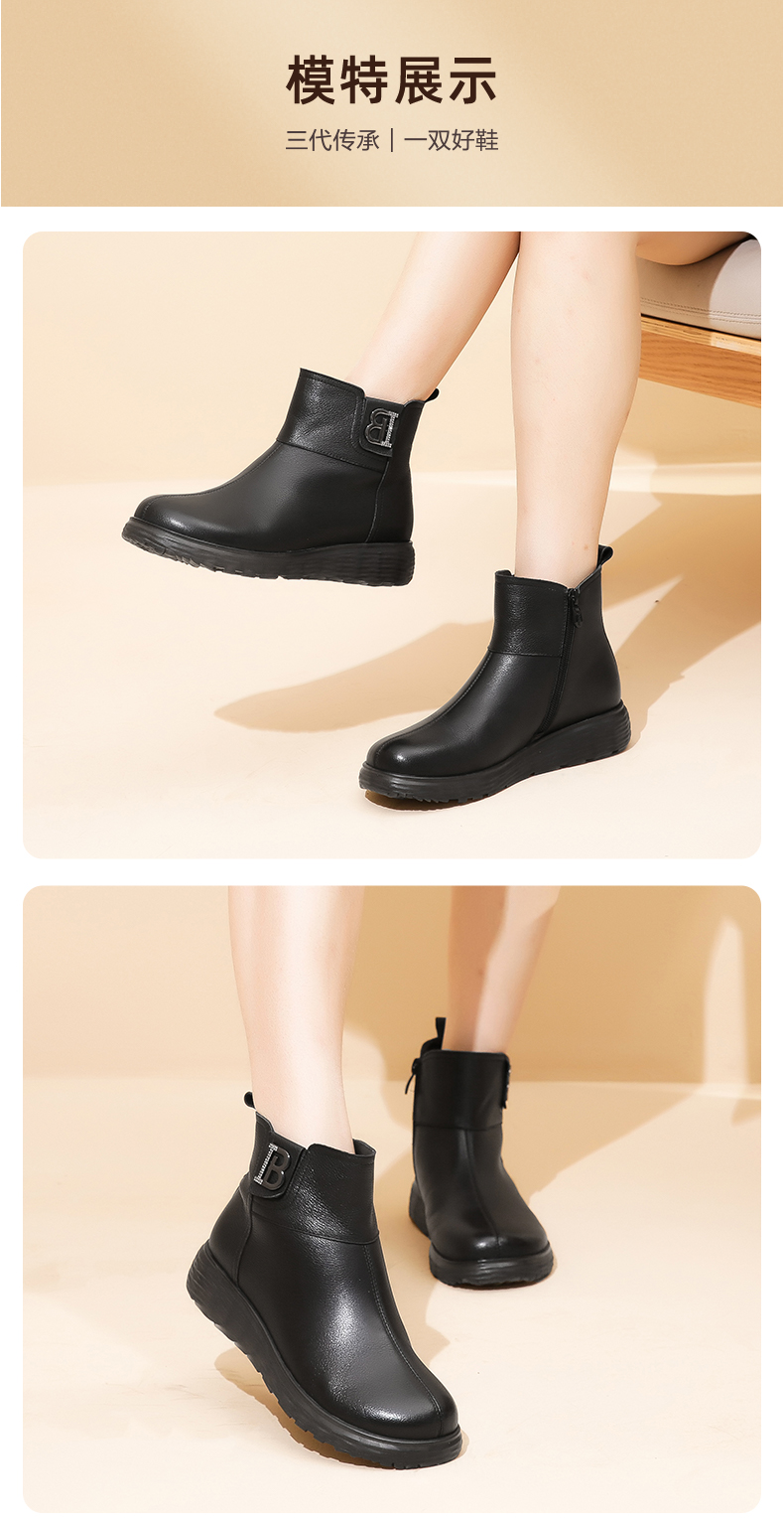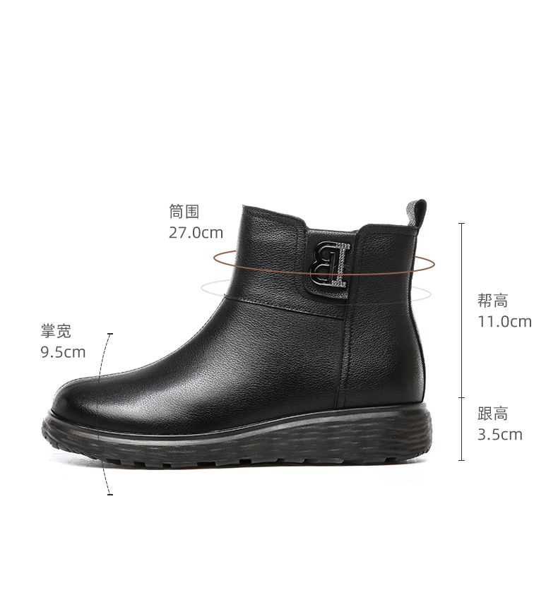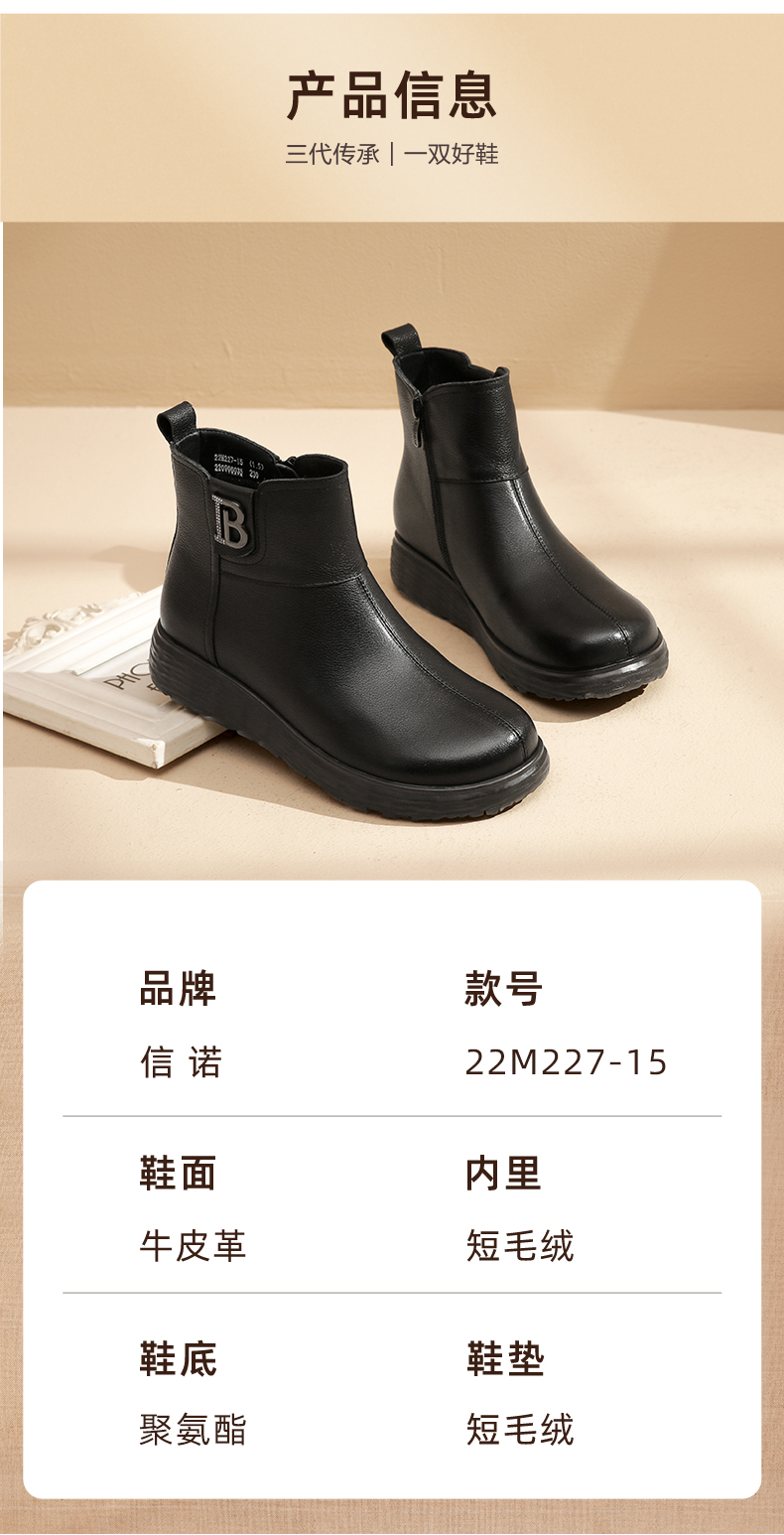 信诺真皮舒适女靴2022冬季新款妈妈靴子薄棉平底圆头短靴加绒皮鞋2M227-15