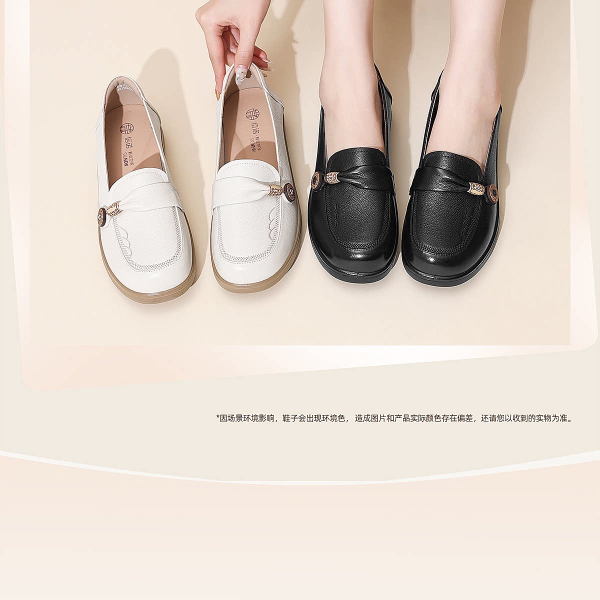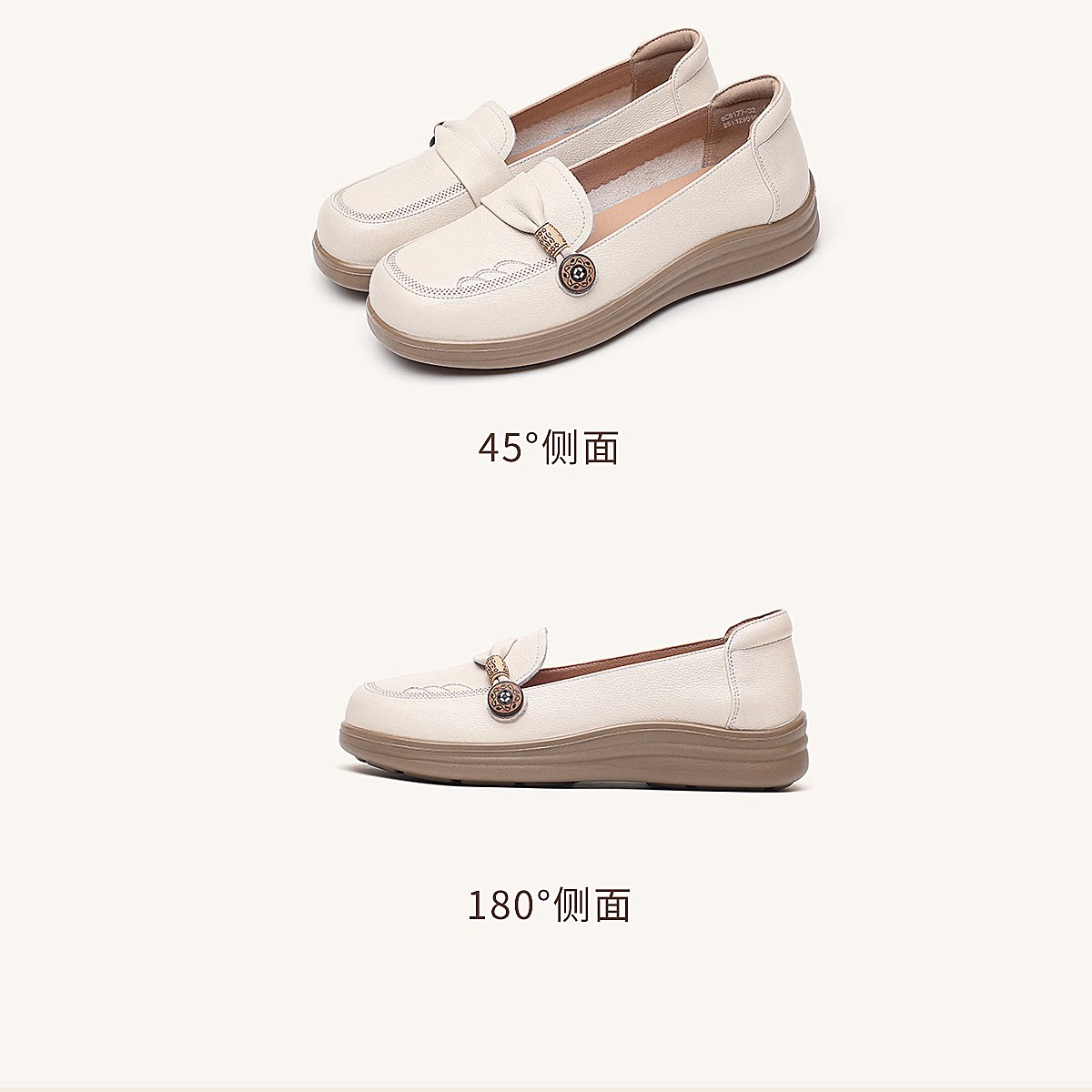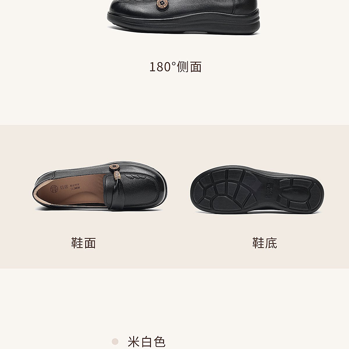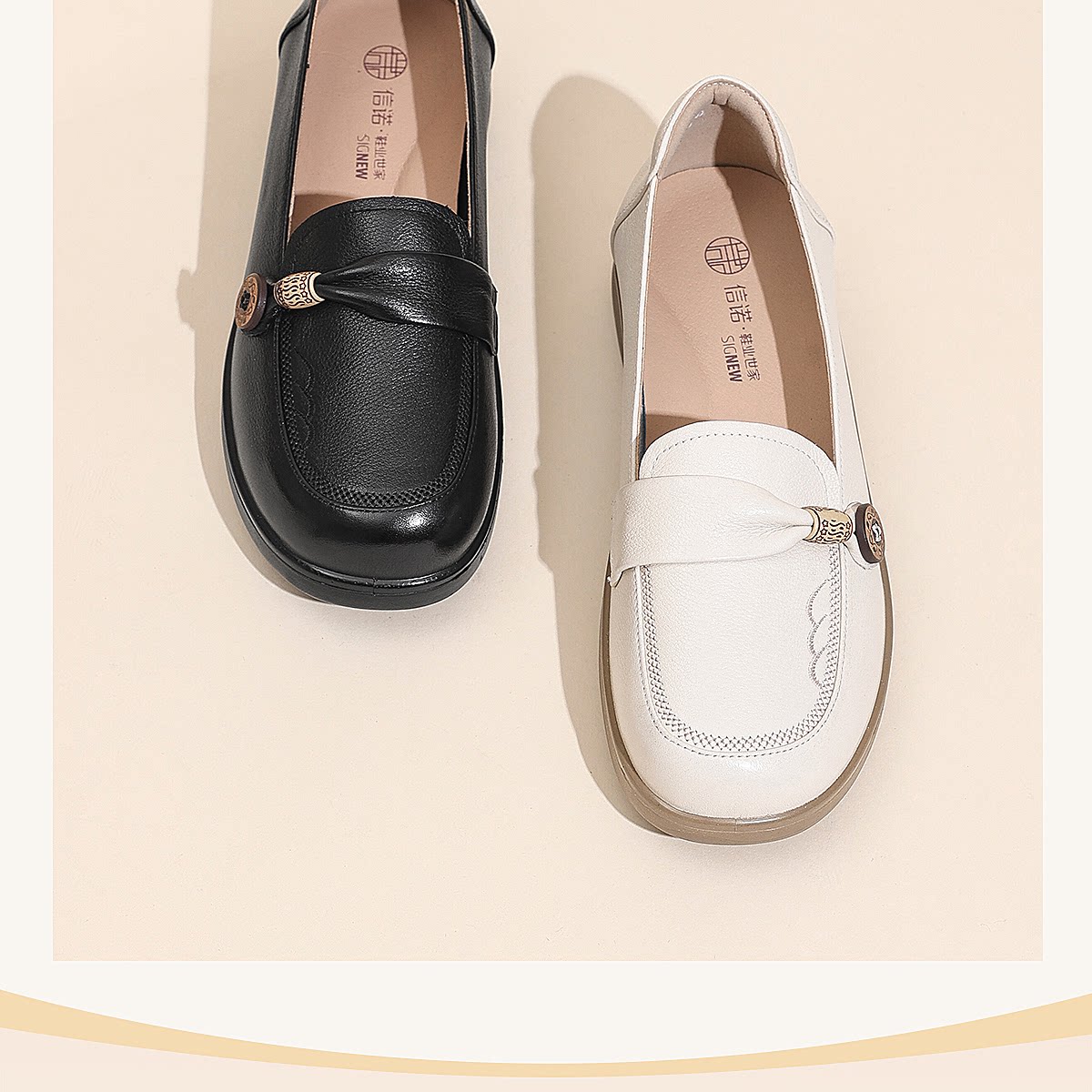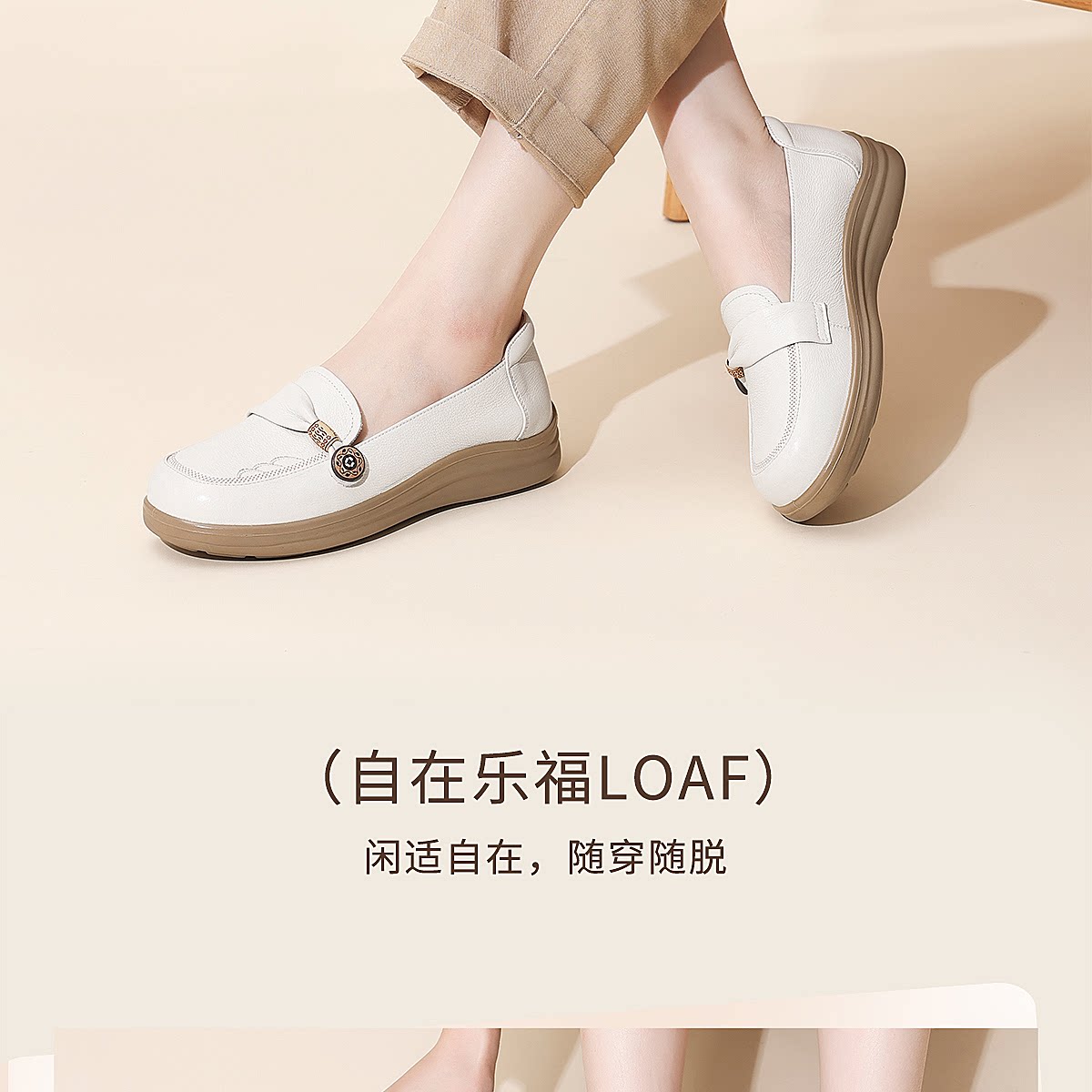 信诺真皮乐福鞋女平底一脚蹬软底不累脚妈妈鞋白色单鞋6C8166-32
