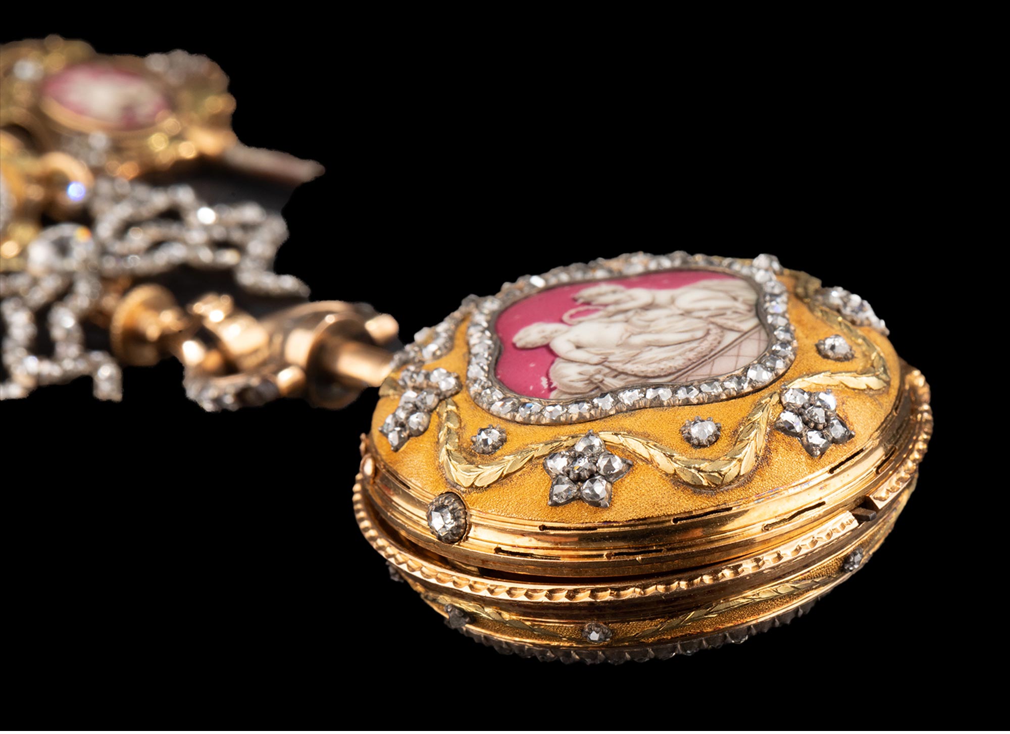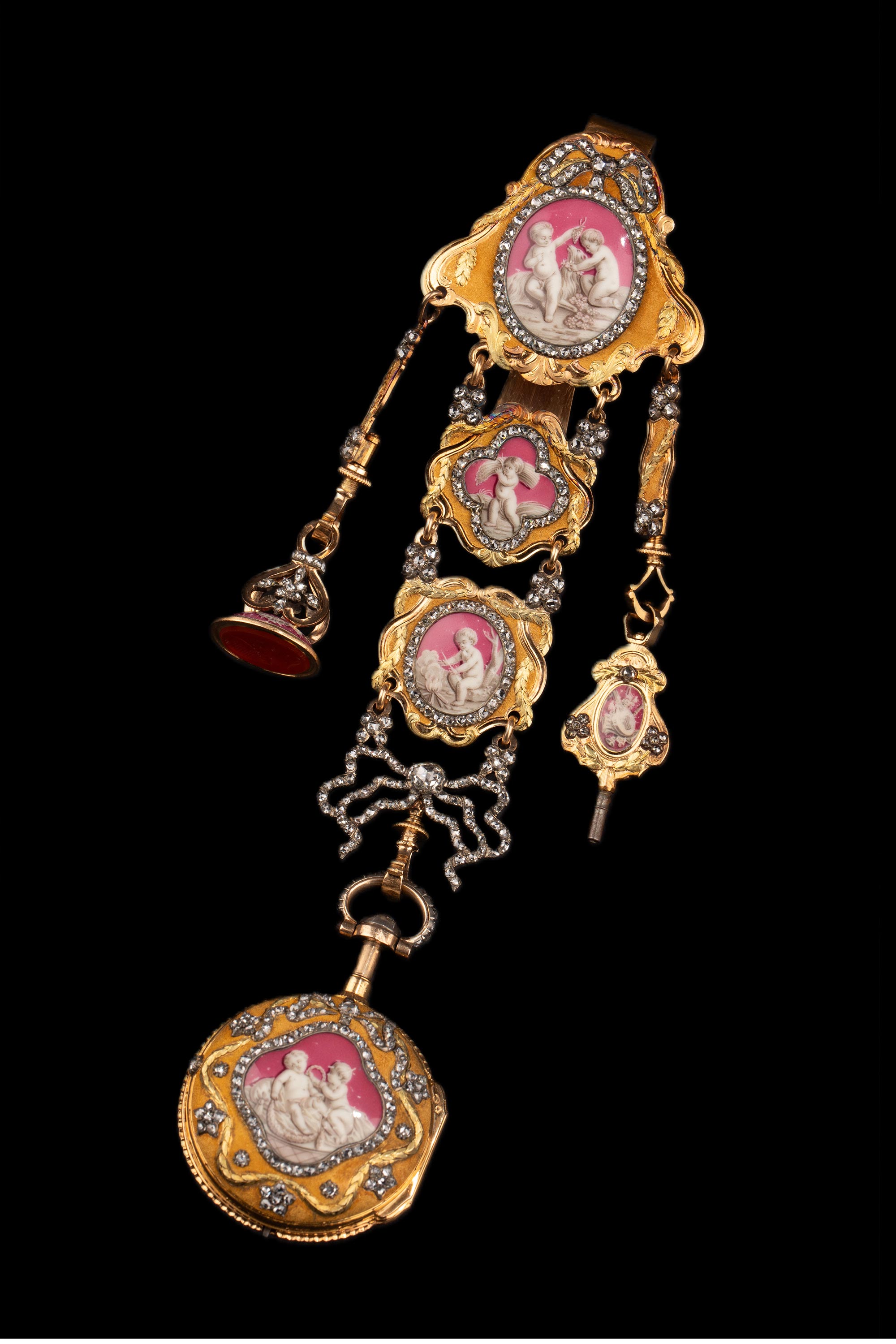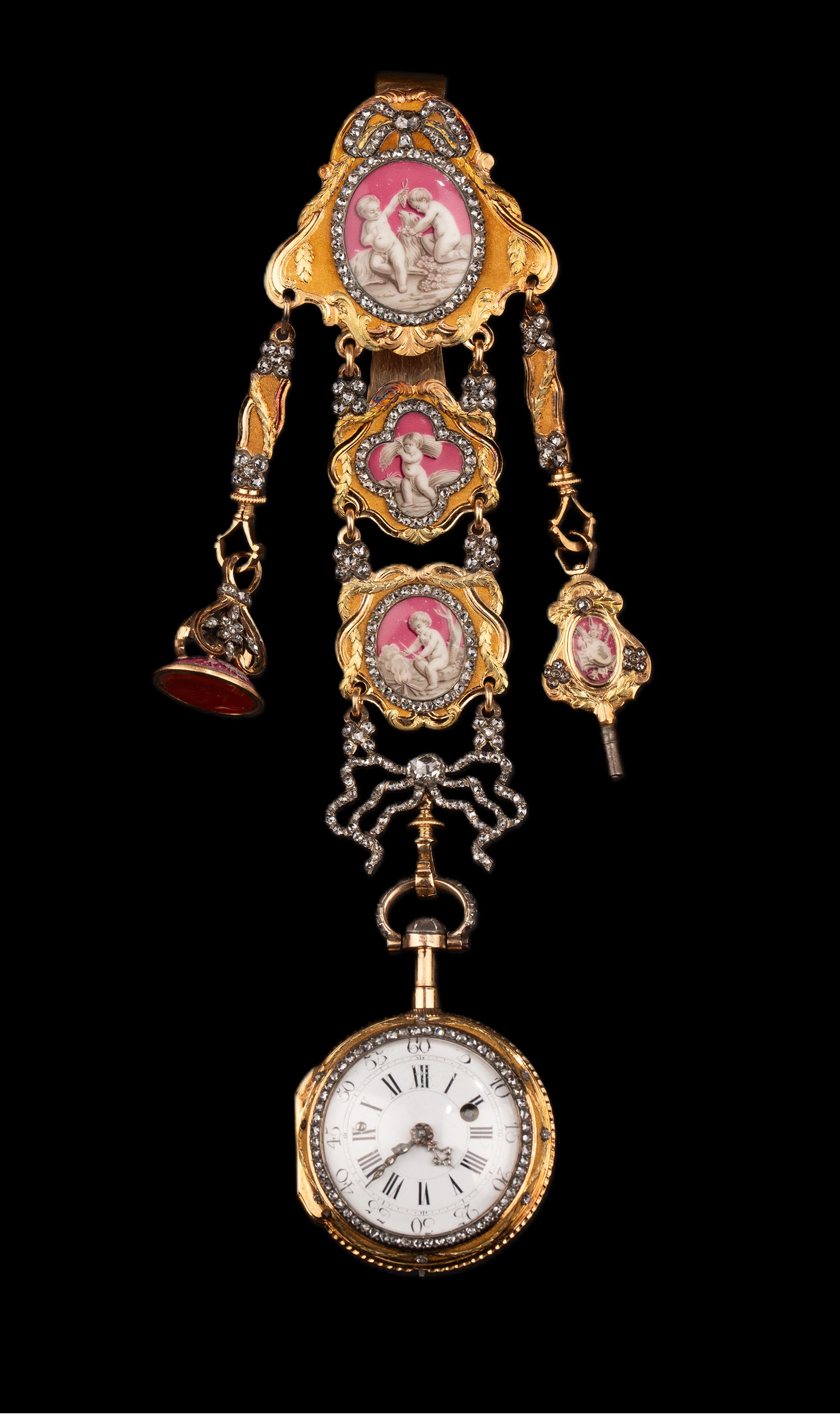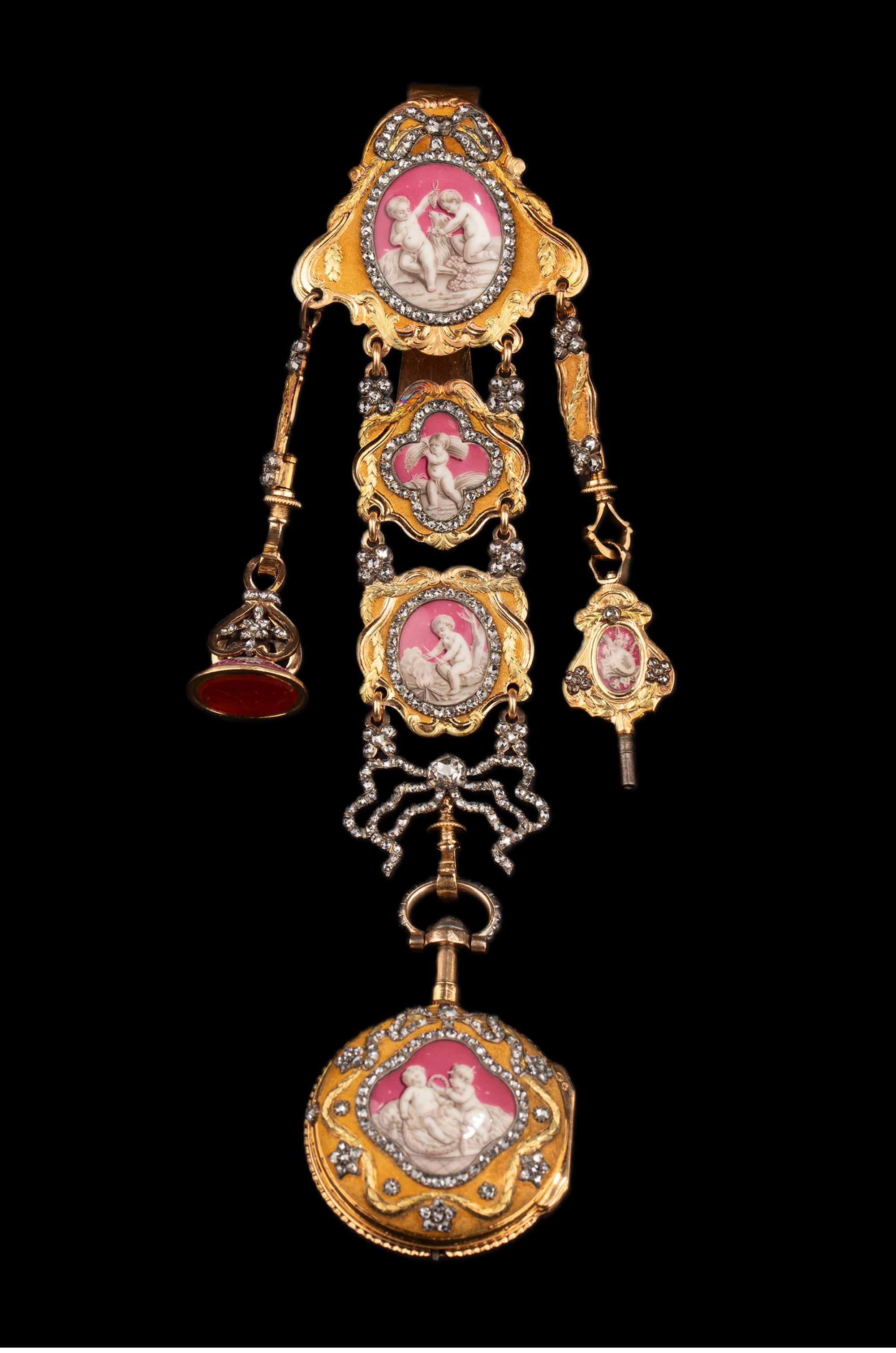 1790年代瑞士Ph. Terrot & Fazy工坊签名出品18K黄金精雕镶嵌钻石及古典孩童主题珐琅彩绘腰链式怀表