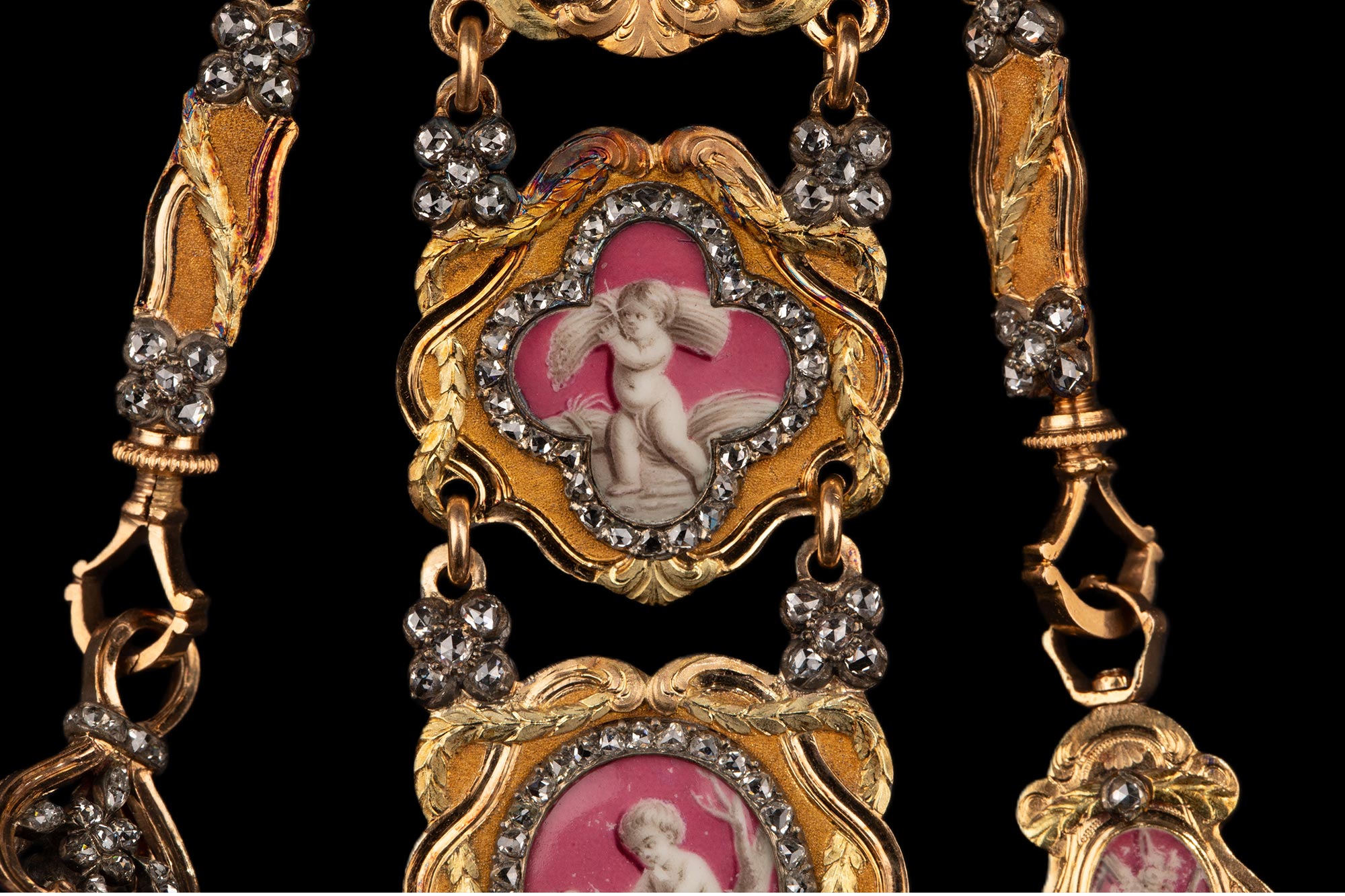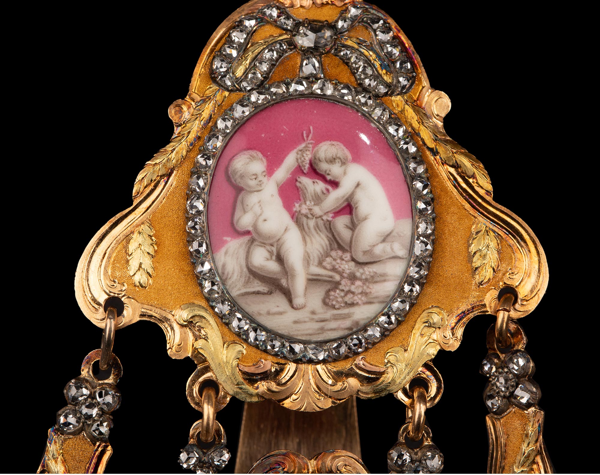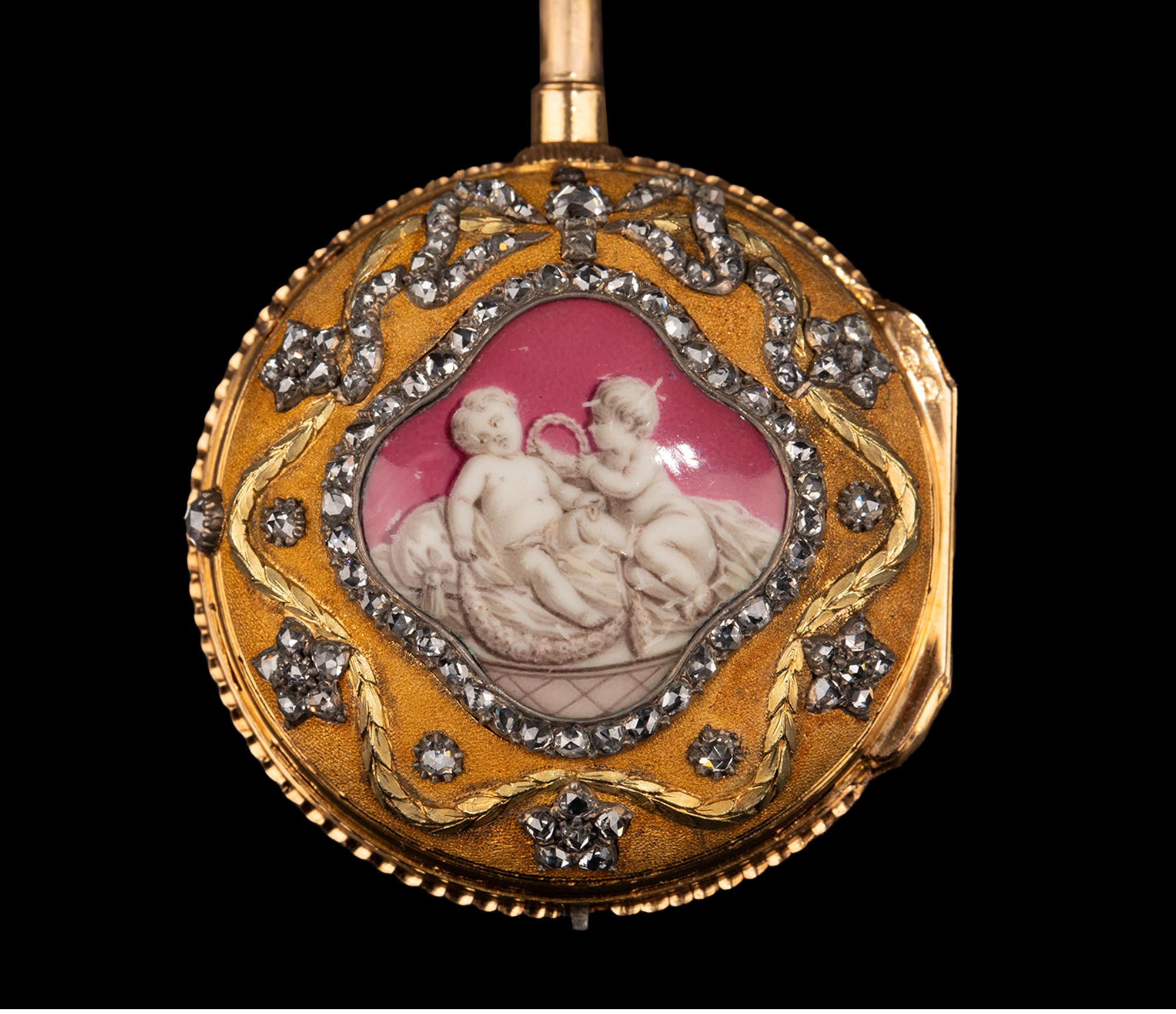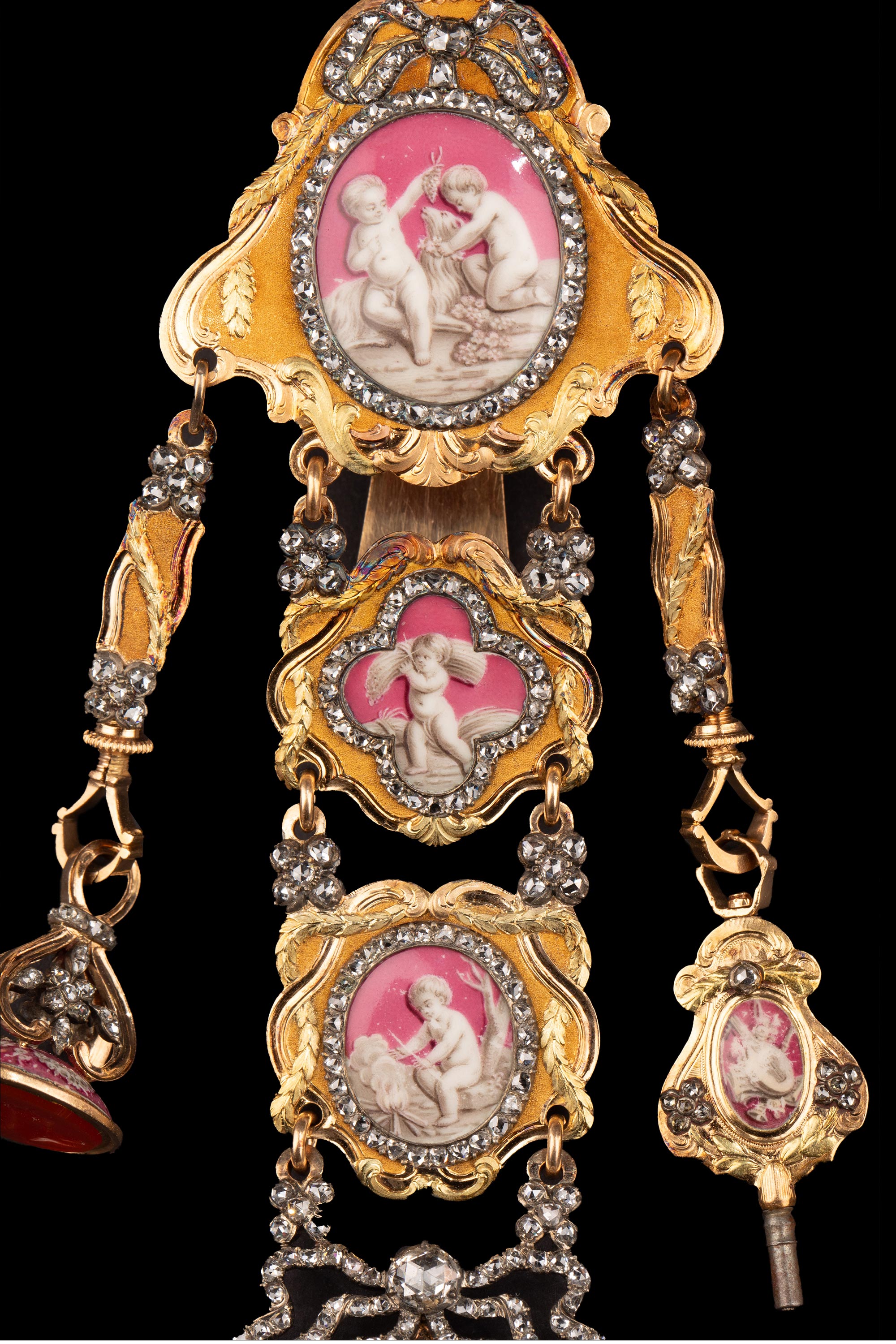 1790年代瑞士Ph. Terrot & Fazy工坊签名出品18K黄金精雕镶嵌钻石及古典孩童主题珐琅彩绘腰链式怀表