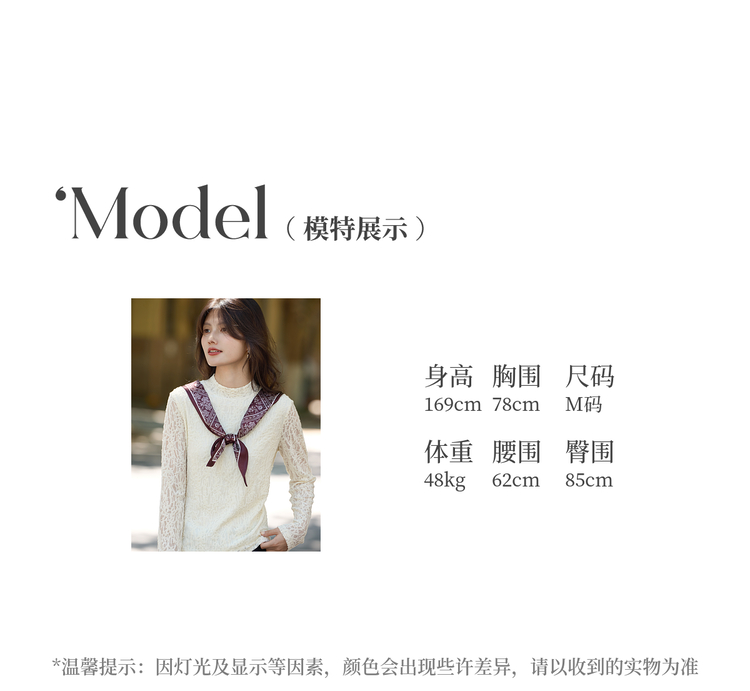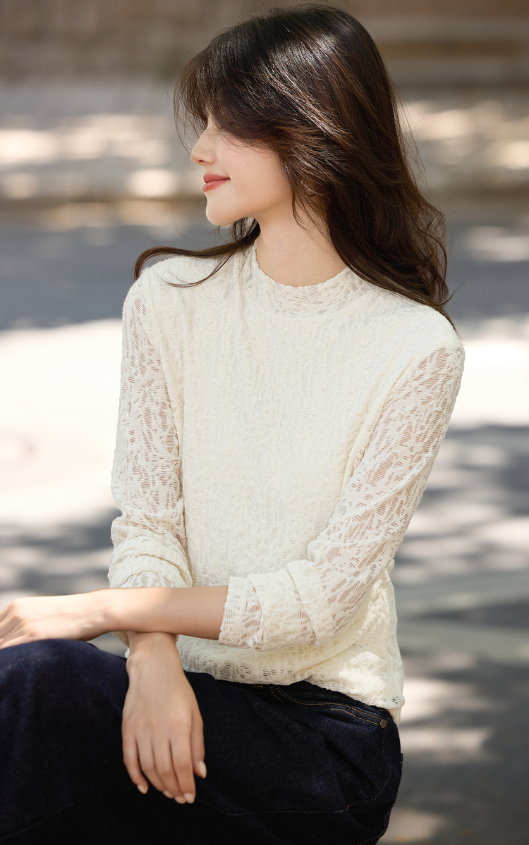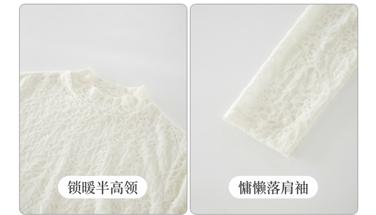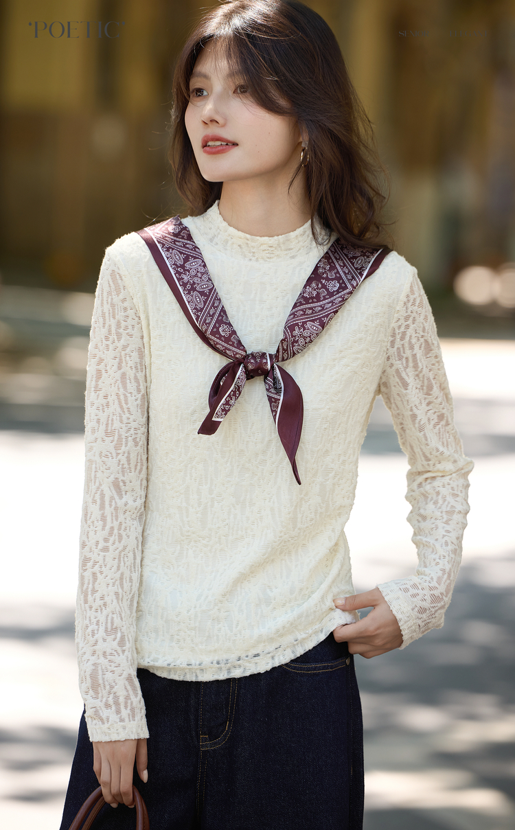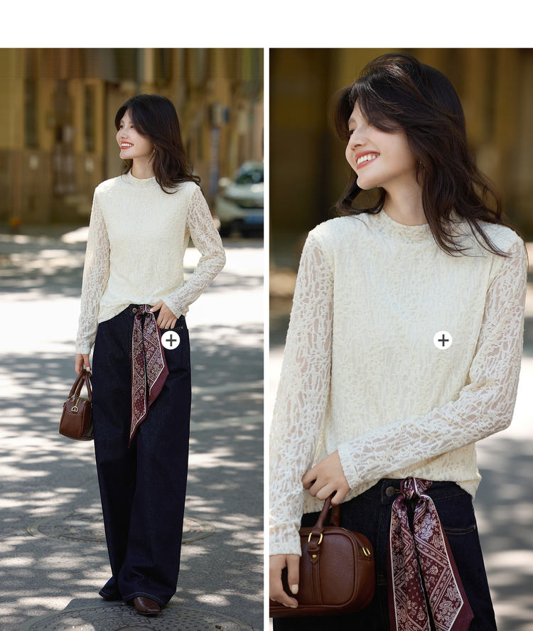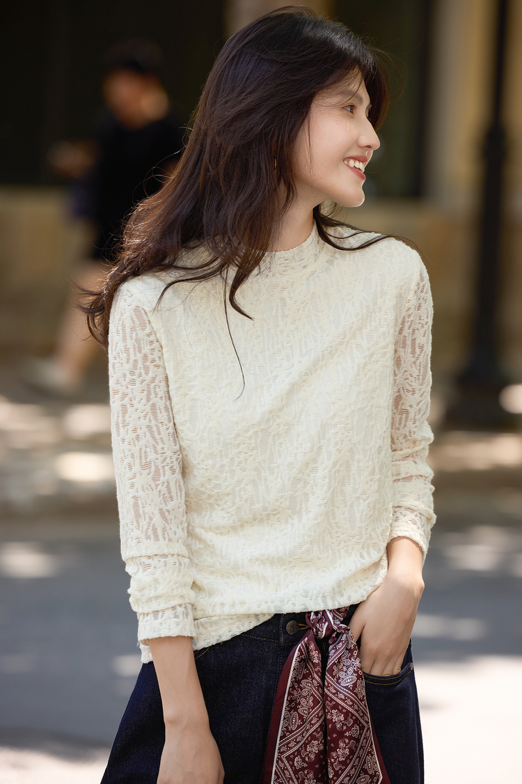 【10/29新品】熙世界浮雕肌理蕾丝打底衫内搭女2025秋冬新款气质杏色半高领上衣