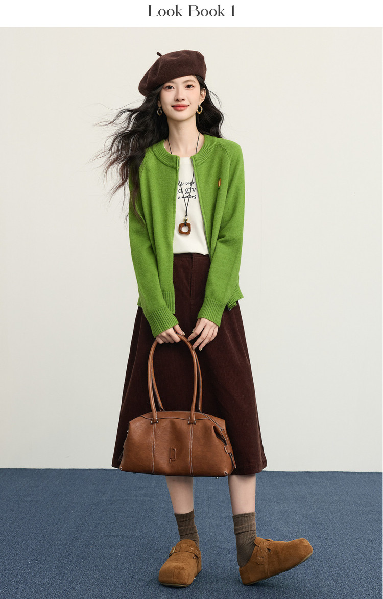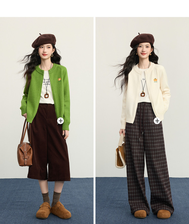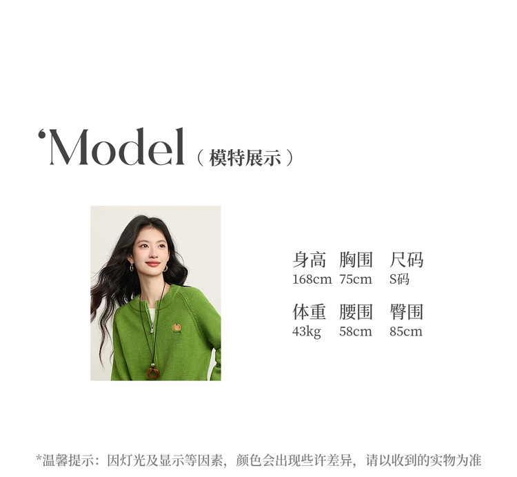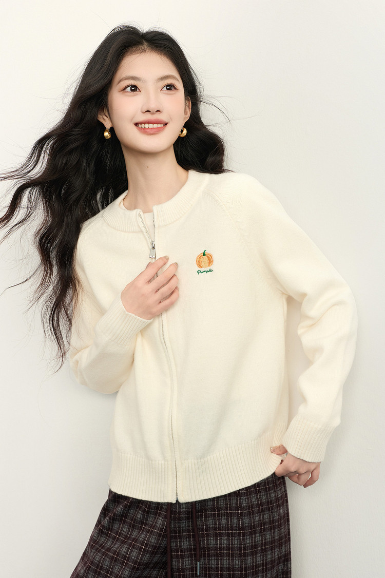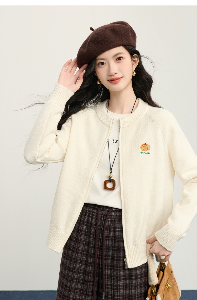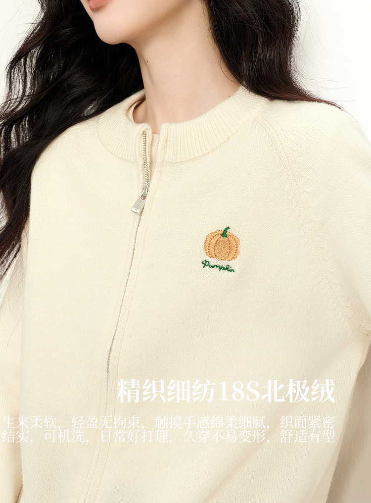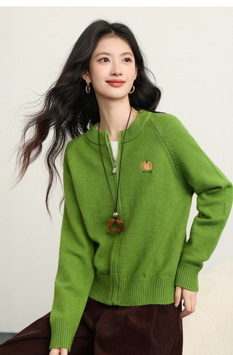 【1/21新品】熙世界绿色拉链毛衣开衫女2025秋冬新款宽松刺绣圆领针织衫短外套