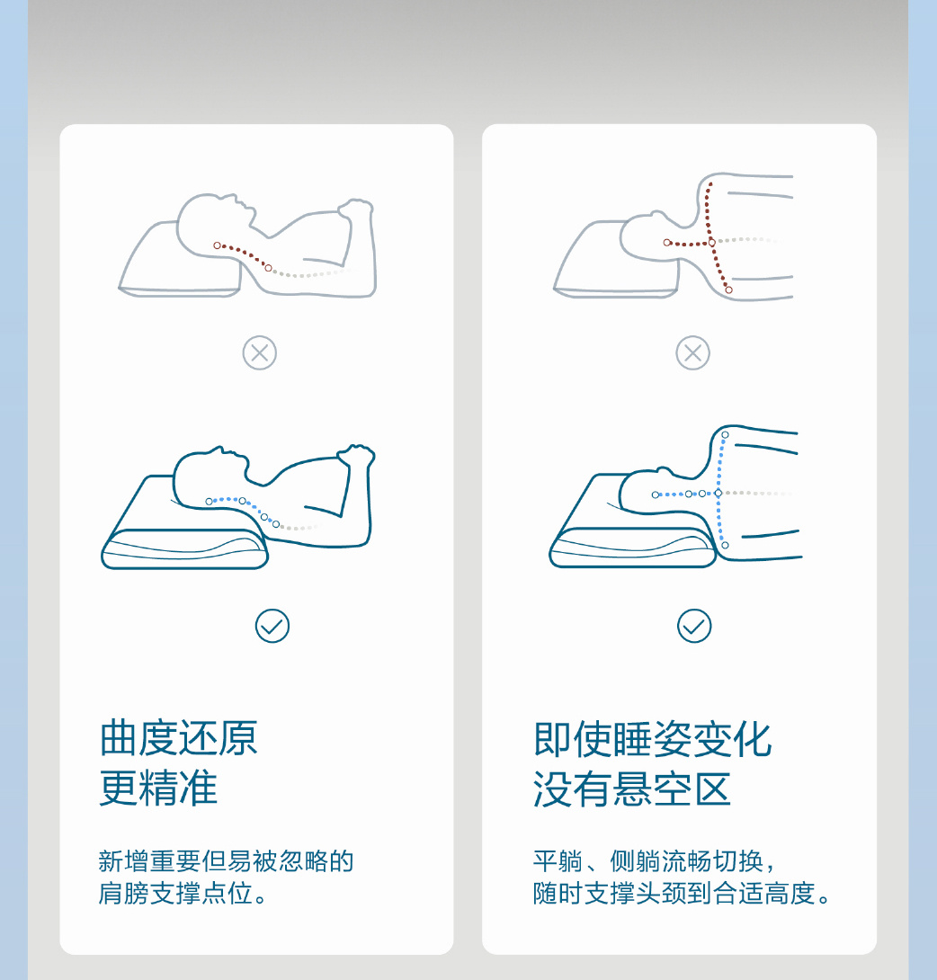 慢回弹吸收肩颈施的压力新型记忆棉,能根据睡姿调整形状更能贴合颈部和肩膀!透气性也很棒!